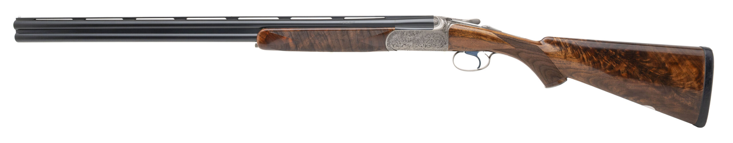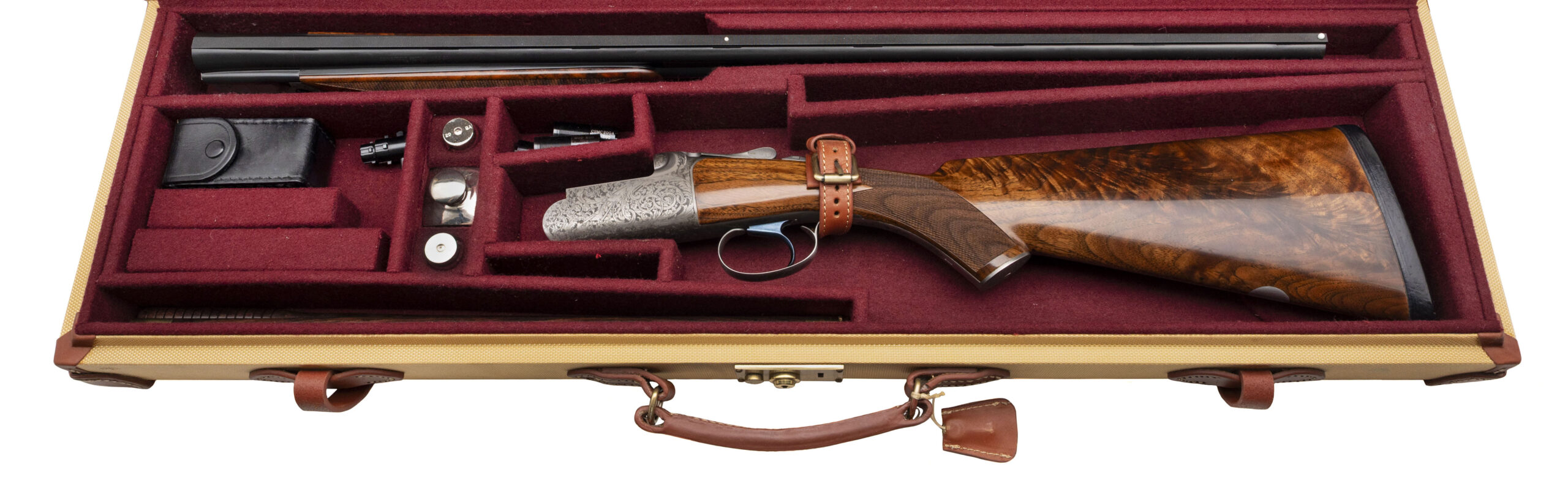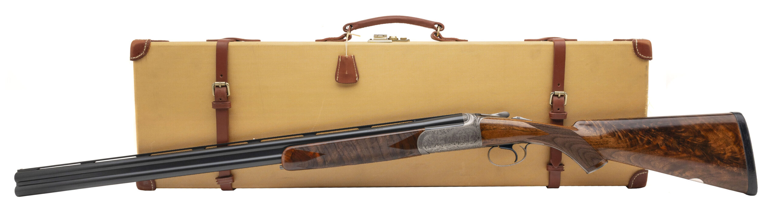 SN: I-00046. Round action over under 20 gauge shotgun with 28” vent rib barrels with white front and mid bead, 3” chambers and screw in chokes. Engraved coin finish box lock with a selective single trigger, auto ejectors and a manual safety. Upgraded XXX wood and leather covered recoil pad with a blank silver oval, 14 ½” LOP and drop of 1 3/8” to 2”. Comes with original luggage case and accessories. DALLAS LOCATION