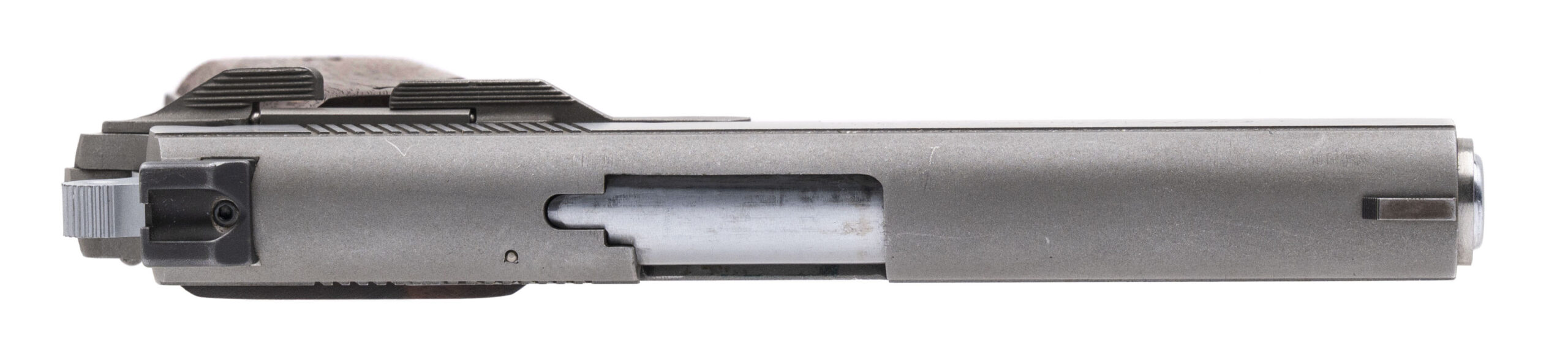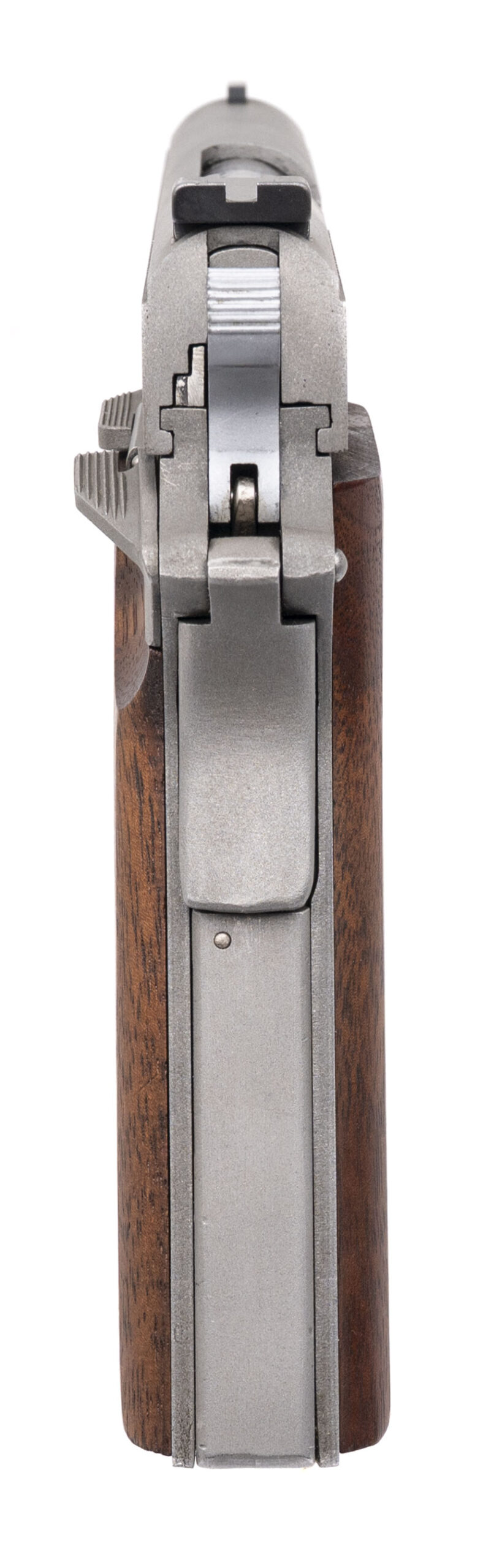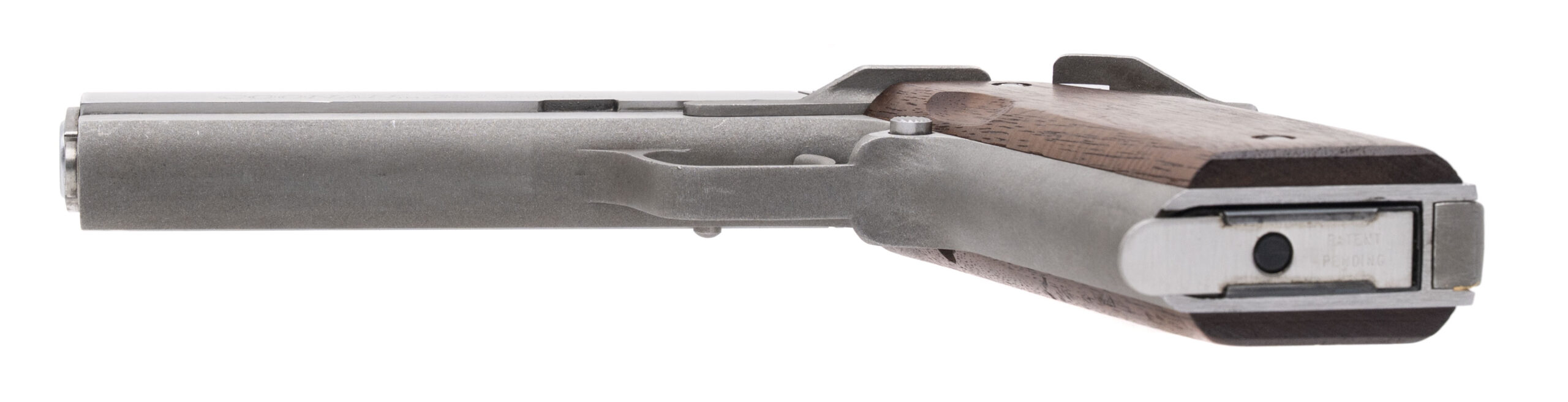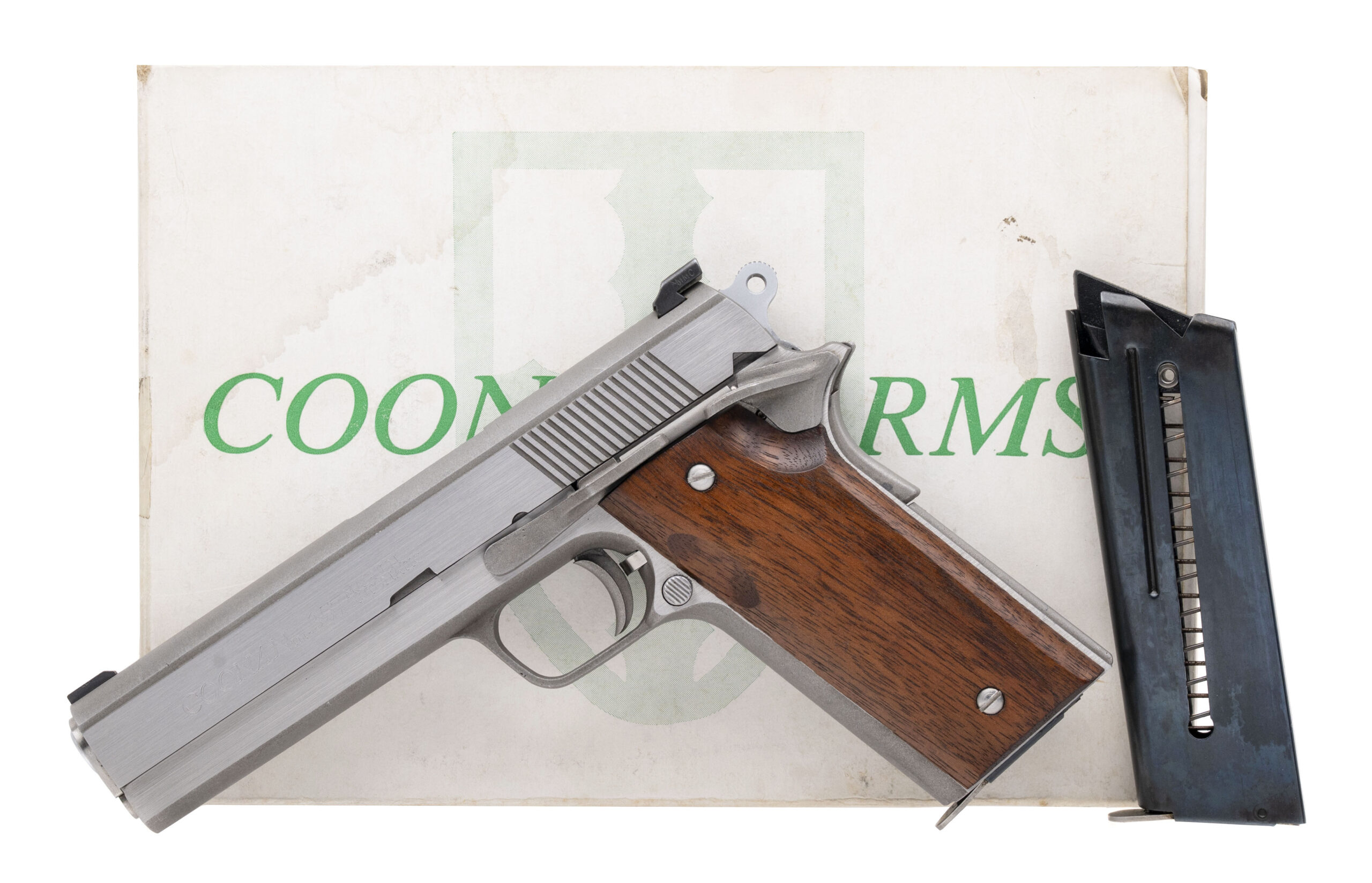 SN: 095. Made in 1981, .357 MAG. with a 5" barrel. Bore is excellent. Unique full size .357 MAG. 1911 style pistol with a manual thumb-safety, stainless steel frame, and wood grips. Metal & grips show minor handling marks. Includes an additional magazine, and original box. Overall condition is very good.