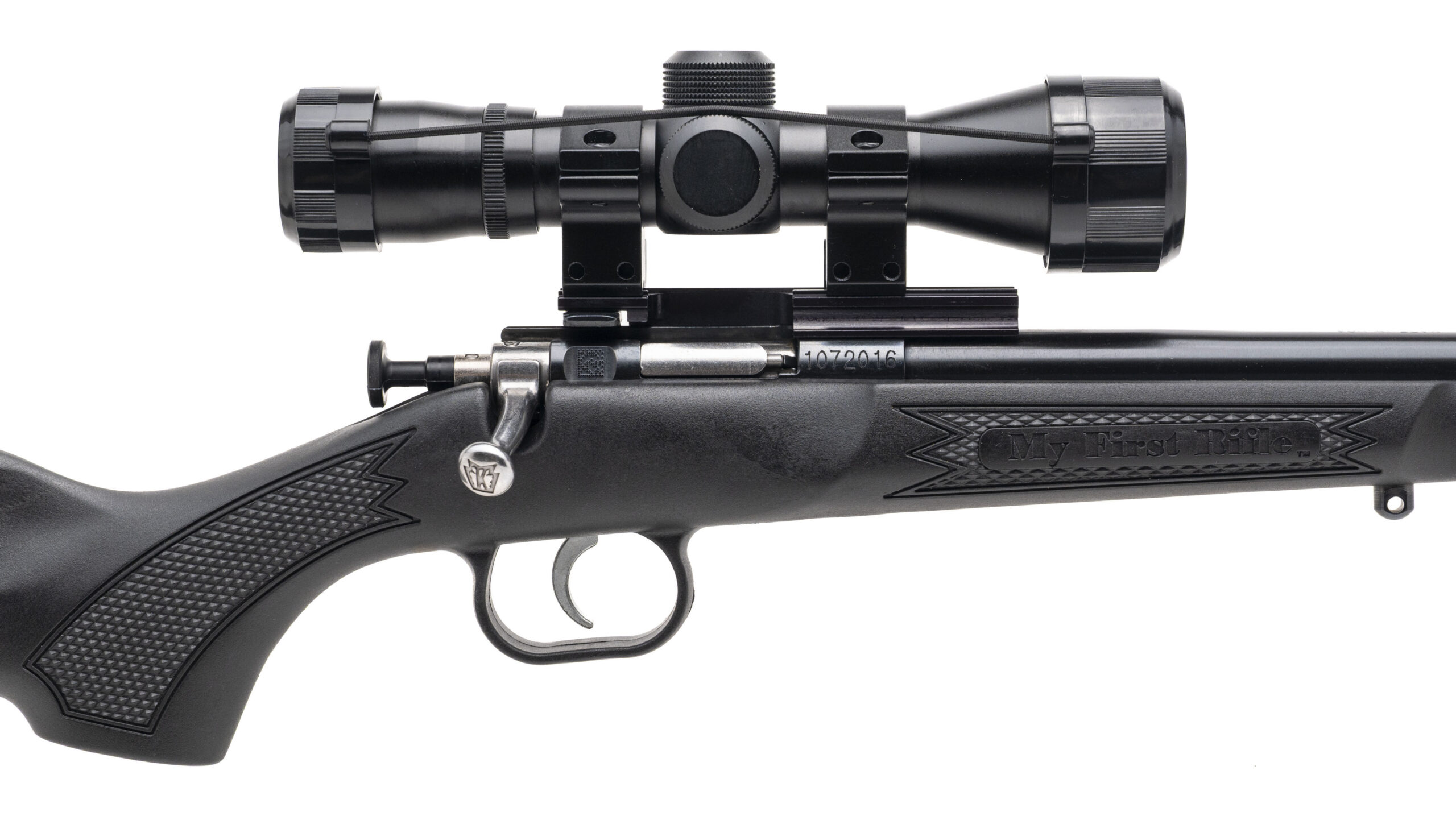SN: 1072016. Modern production, .22S, L, LR with a 16.1" barrel. Bore is very good. Single-shot youth rimfire rifle with a Crickett 4X32 compact scope, blued finish, and checkered black synthetic stock. Stock shows light handling marks. Overall condition is near excellent. Includes original range bag, and original box.