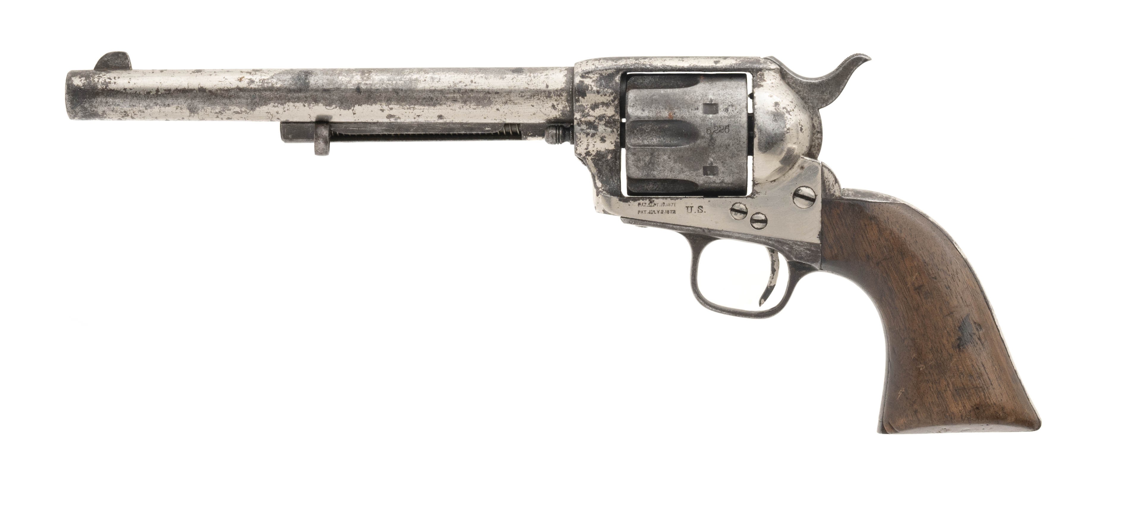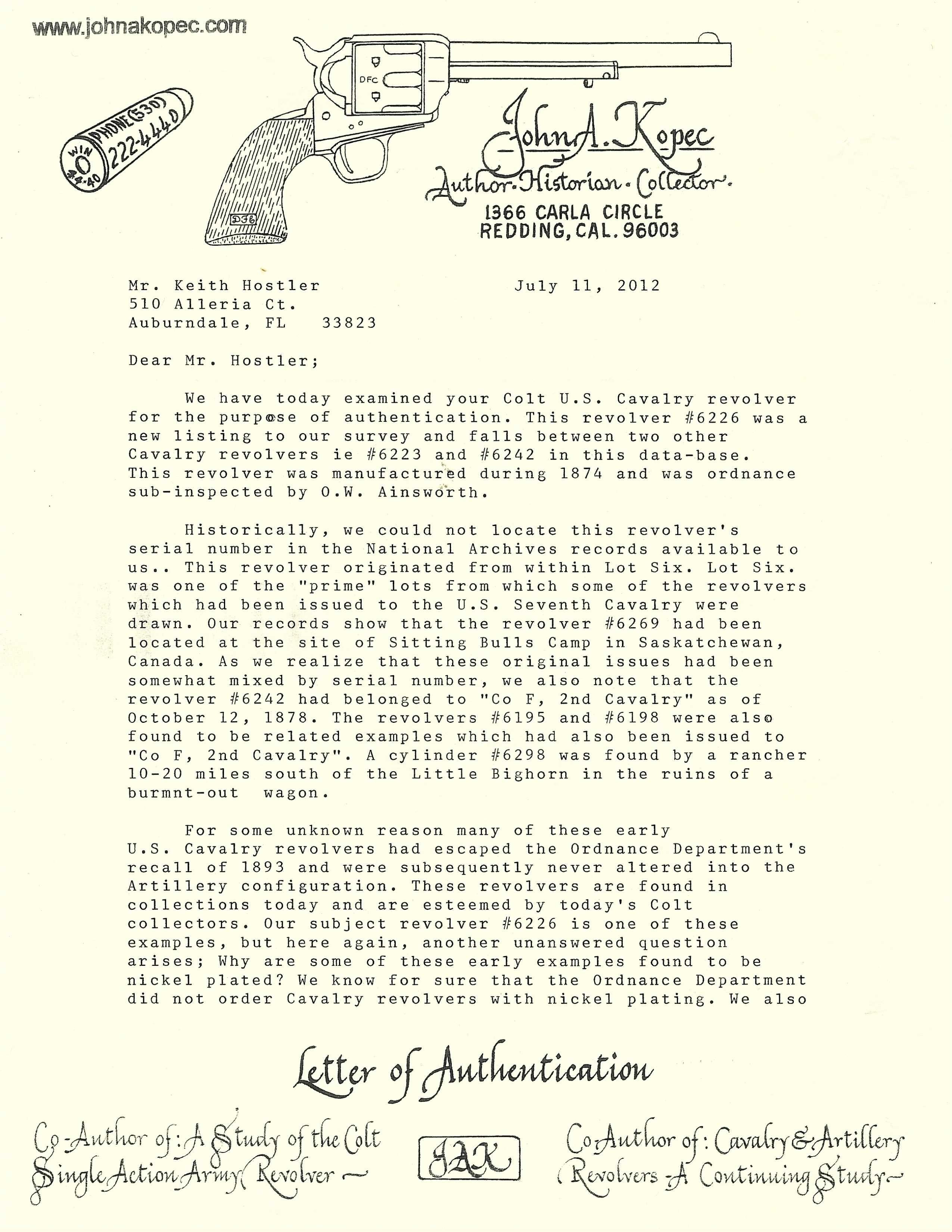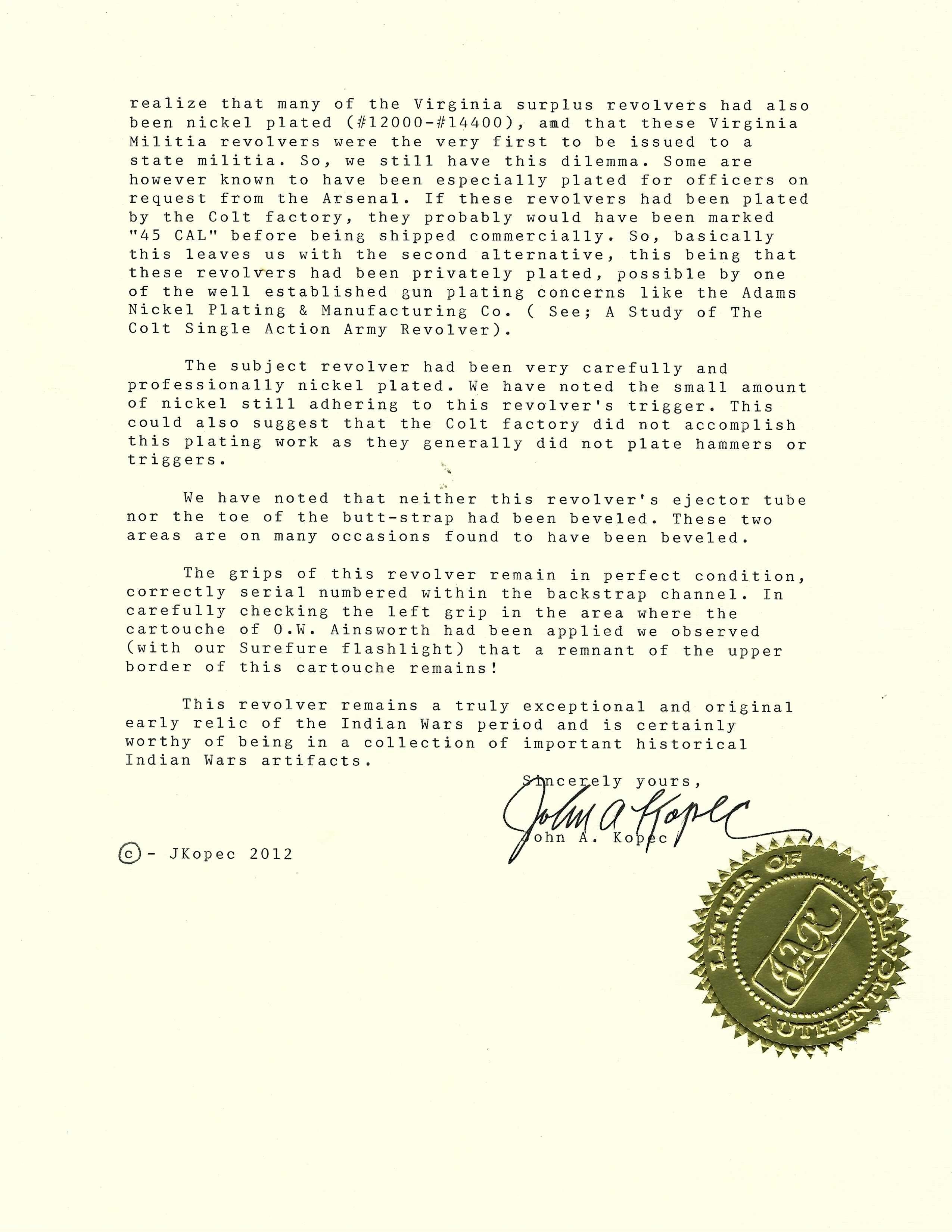 Serial number 6226. 45 LC caliber with a 7 ½” barrel. This gun is a Cavalry model purchased by the military and inspected by O. W. Ainsworth. This gun has a period nickel finish. Noted expert and author John Kopec has speculations of why some cavalry models were nickel plated, but does not know for sure the reason. Approximately 70% of the nickel finish remains. Grips show normal wear. This gun falls in the 6th lot issued to the cavalry where Lot 5 & 6 are the guns issued to the 7th cavalry and could have been used at the Battle of the Little Big Horn. It also falls in a range where it could have been issued to the 2nd Cavalry. This gun comes with a letter from noted expert John Kopec authenticating this gun as all original. This gun was awarded Mr. Kopec’s coveted Golden seal that is reserved for only the finest cavalry models that are completely original and completely unaltered. Very fine Custer era Colt!
