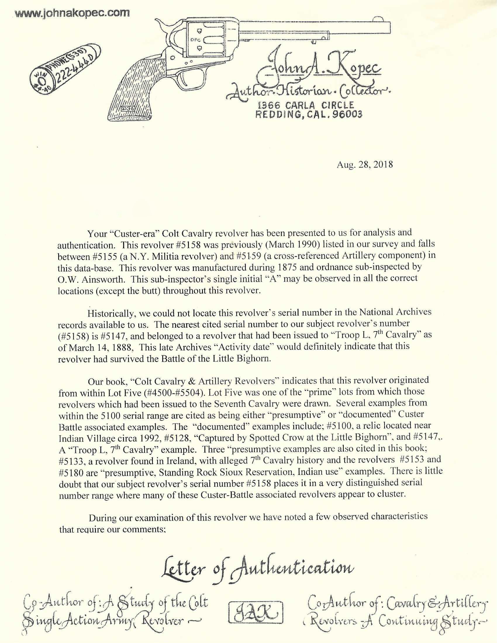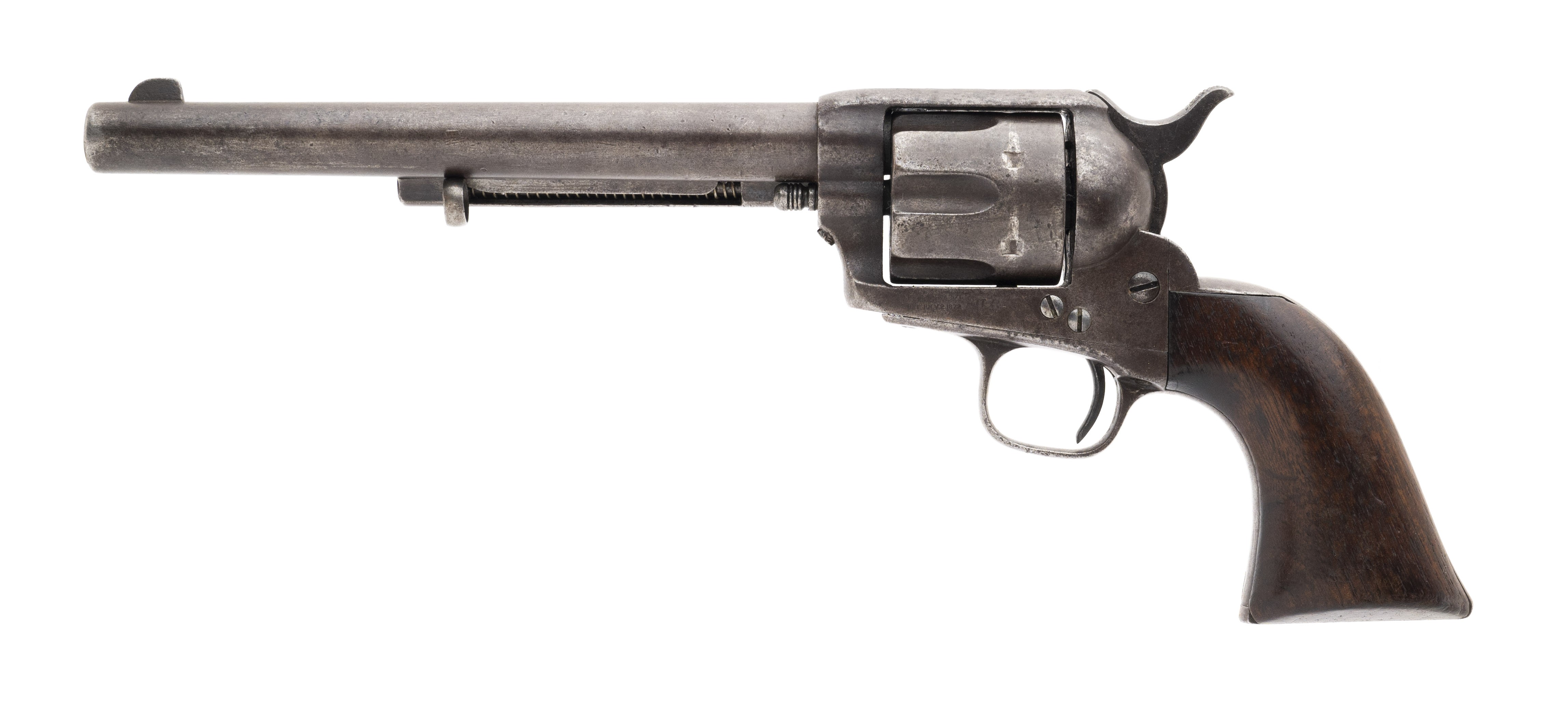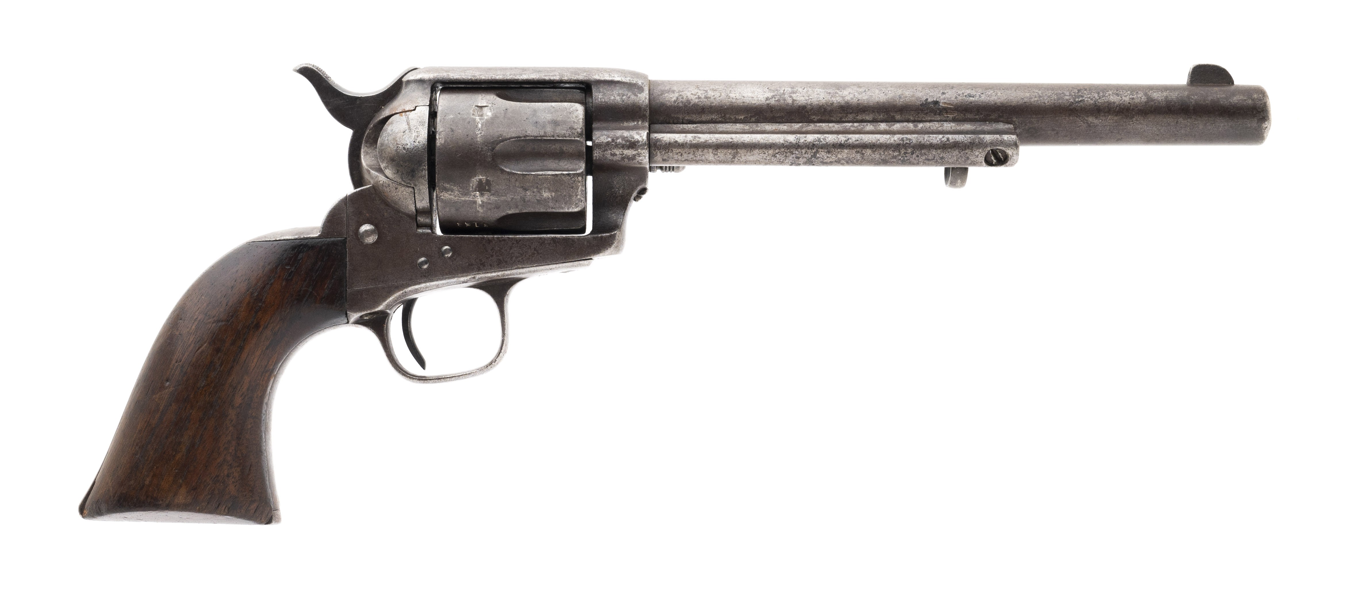 Serial Number 5158. Made in 1874. 45LC caliber with a 7 ½” barrel. This is a cavalry Model inspected by O. W. Ainsworth. This is a very sharp example of an early cavalry model with s light brown to gray patina throughout the metal. All markings are sharp and crisp and all numbers are matching except the grips. This is an exceptional gun as it was part of Lot 5 of the US Cavalry models. These guns were issued to the 7th Cavalry and had a high probability of being part of the battle of the Little Big Horn. The 5100 serial range contains numerous guns with documentation that were likely veterans of the Little Big Horn. This gun comes with a letter from noted Colt expert John Kopec. Mr. Kopec gun says the only alterations to this gun are a replaced main spring, and a replaced period set of grips along with a drilled backstrap for stabilizing pins which indicates this gun once had two piece grips. These are all very minor alterations. Very fine example of a 7th Cavalry issued Colt Single Action Army!
