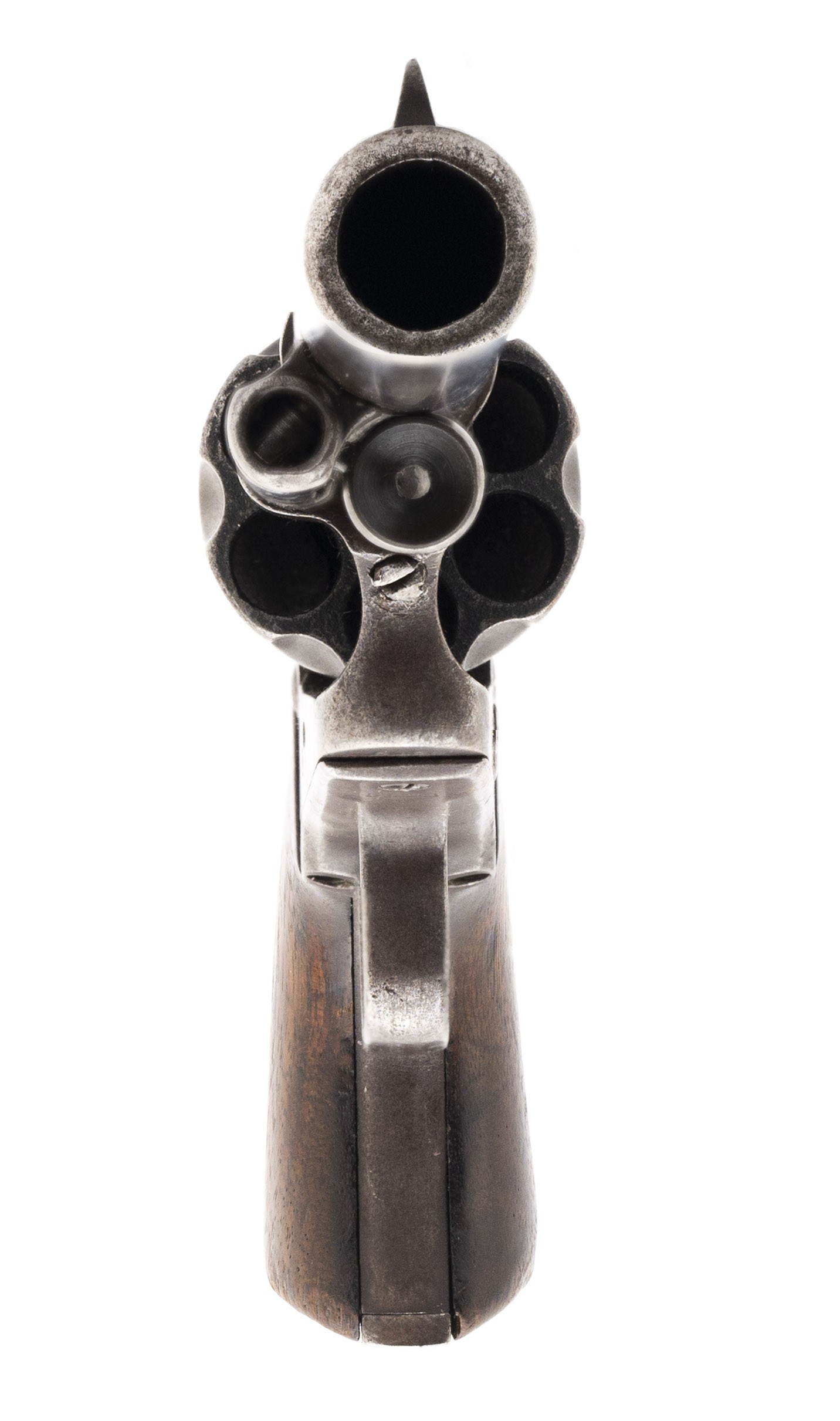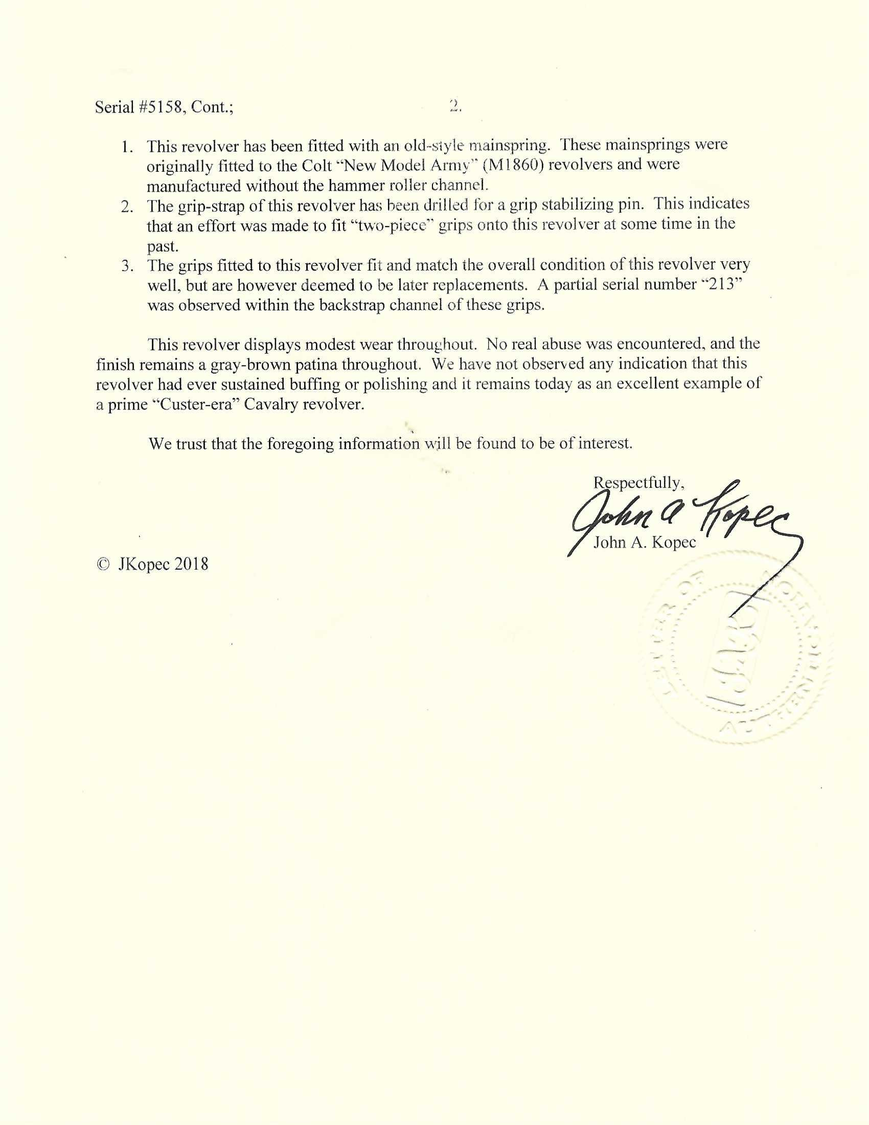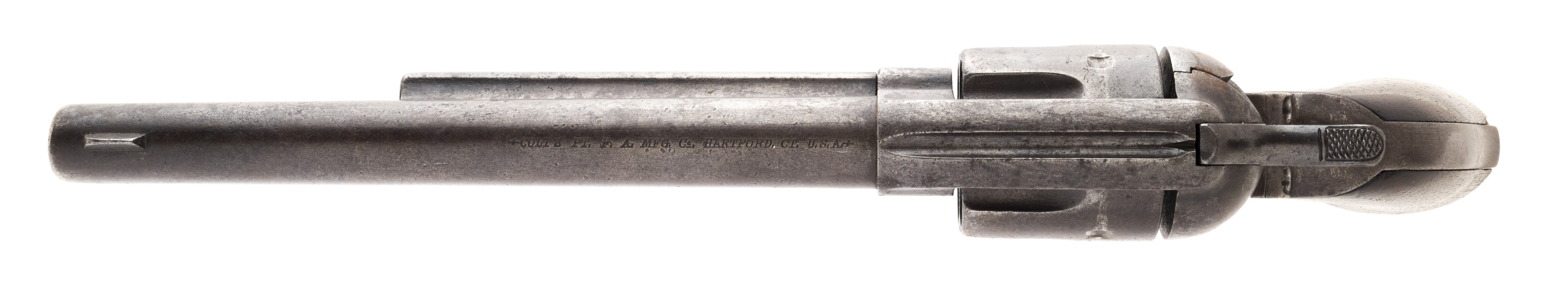 Serial Number 5158. Made in 1874. 45LC caliber with a 7 ½” barrel. This is a cavalry Model inspected by O. W. Ainsworth. This is a very sharp example of an early cavalry model with s light brown to gray patina throughout the metal. All markings are sharp and crisp and all numbers are matching except the grips. This is an exceptional gun as it was part of Lot 5 of the US Cavalry models. These guns were issued to the 7th Cavalry and had a high probability of being part of the battle of the Little Big Horn. The 5100 serial range contains numerous guns with documentation that were likely veterans of the Little Big Horn. This gun comes with a letter from noted Colt expert John Kopec. Mr. Kopec gun says the only alterations to this gun are a replaced main spring, and a replaced period set of grips along with a drilled backstrap for stabilizing pins which indicates this gun once had two piece grips. These are all very minor alterations. Very fine example of a 7th Cavalry issued Colt Single Action Army!