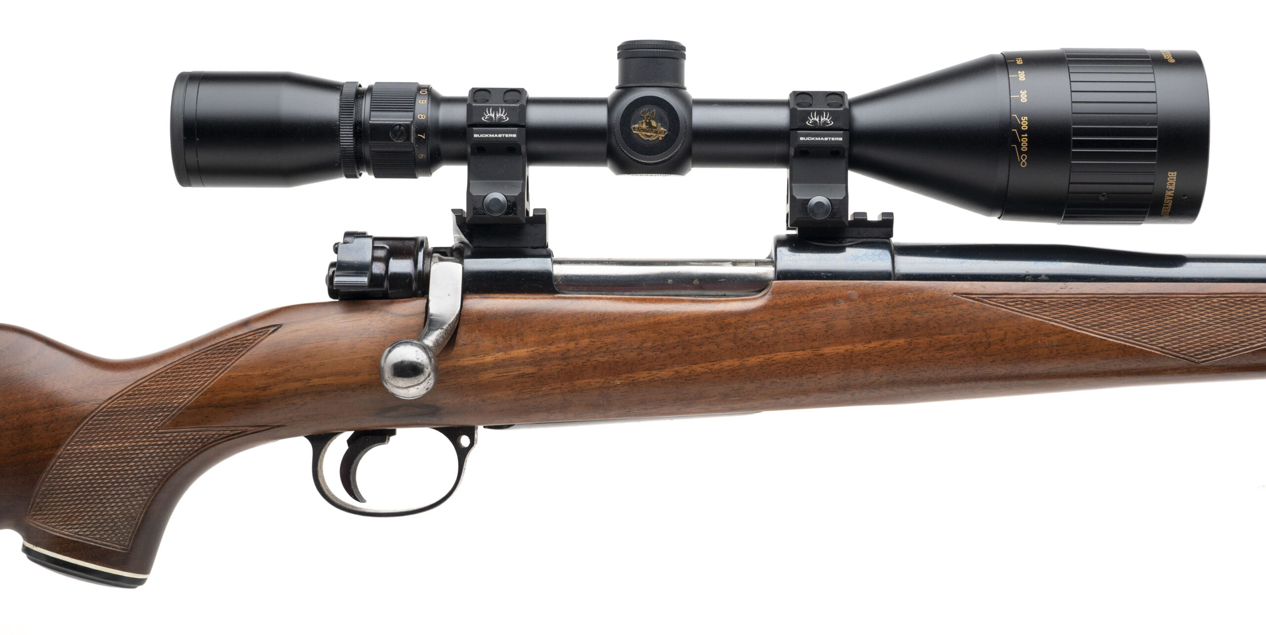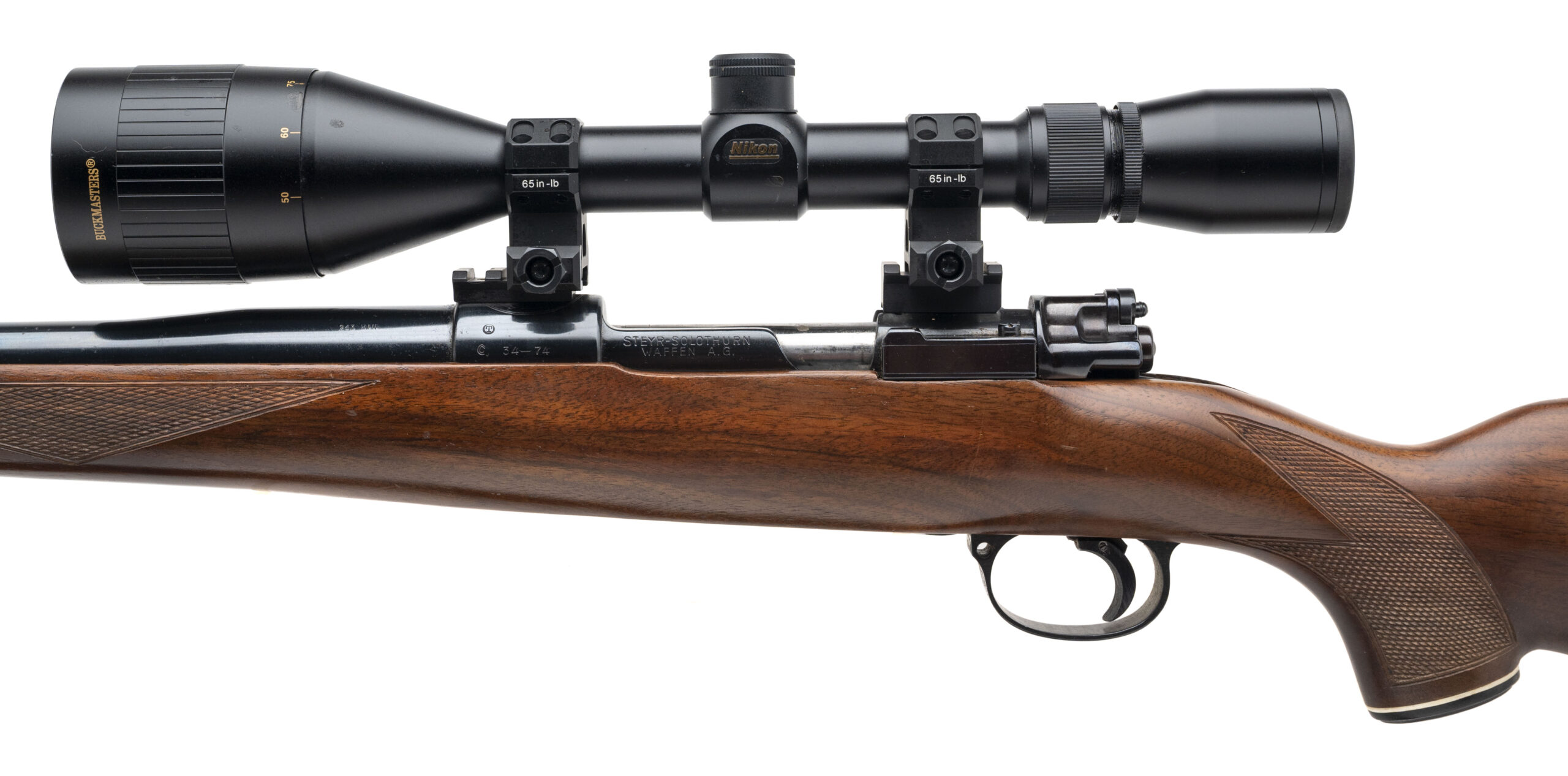 SN: 34-74 Custom rifle built on a Steyr-Solothurn Mauser action with a 27.5" heavy contour round barrel chambered in 243, custom adjustable trigger, Picatinny scope bases and a Nikon Buckmaster 4-12 scope in a Fajen checkered walnut stock. Some light handling marks but overall in very good condition with an excellent bore. Comes with leather sling.