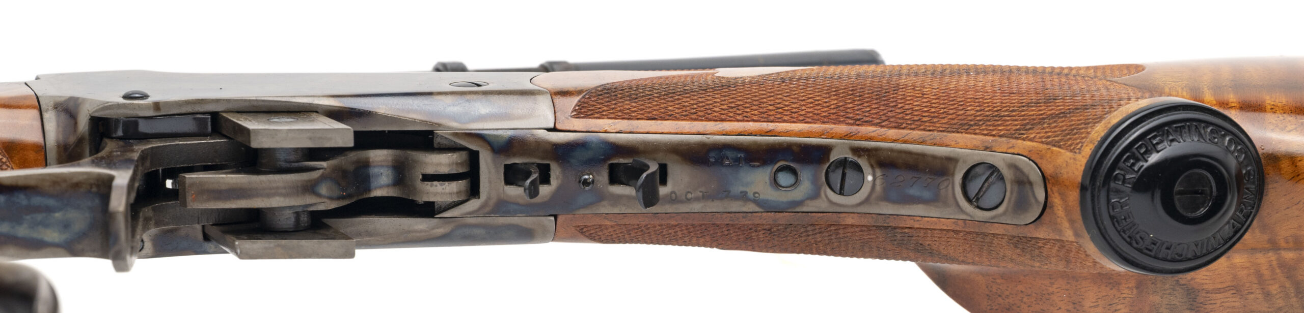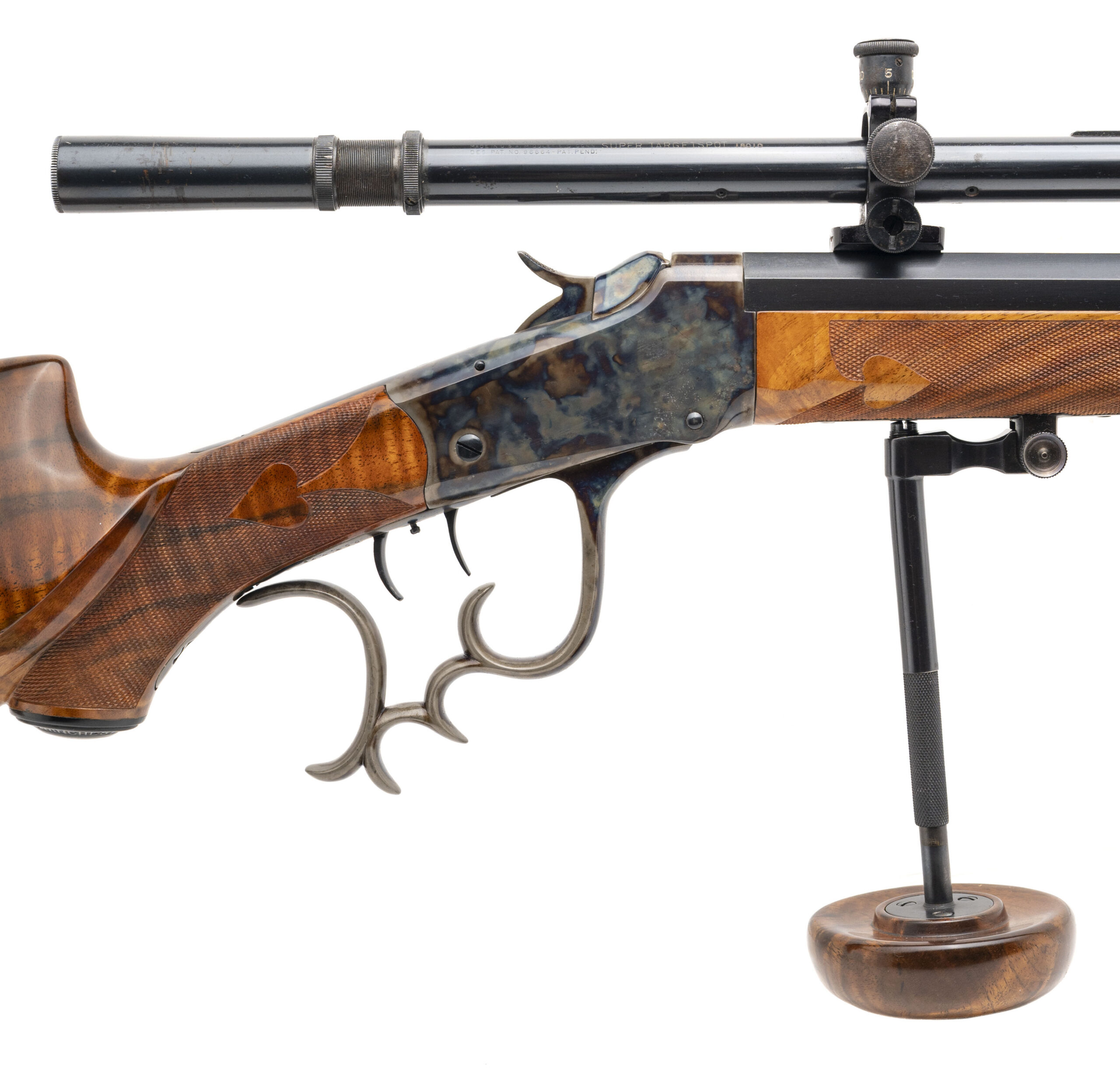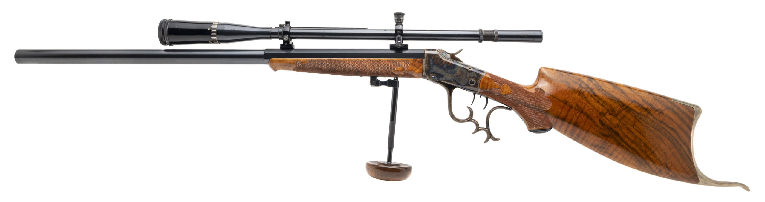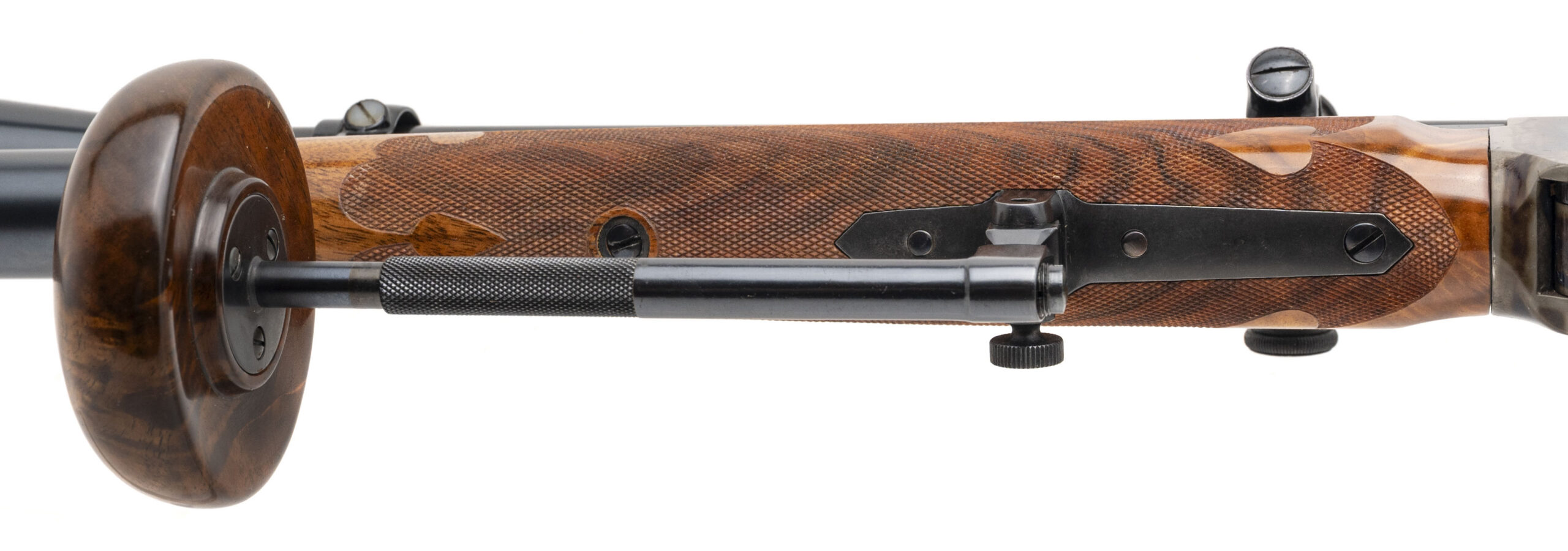 Serial number 62770. Made in 1893. 22 LR caliber with a 27” barrel bull, half round half octagon barrel. This gun is in like new condition as customized. The barrel has 100% of the blue. The frame has very well done case colors with a small area on the right hand side that appears to have laid up against something. The stock is finely figured and checkered in a Fleur D’Lis style. This gun has a half Schutzen style butt plate. Action works perfect and bore is excellent.