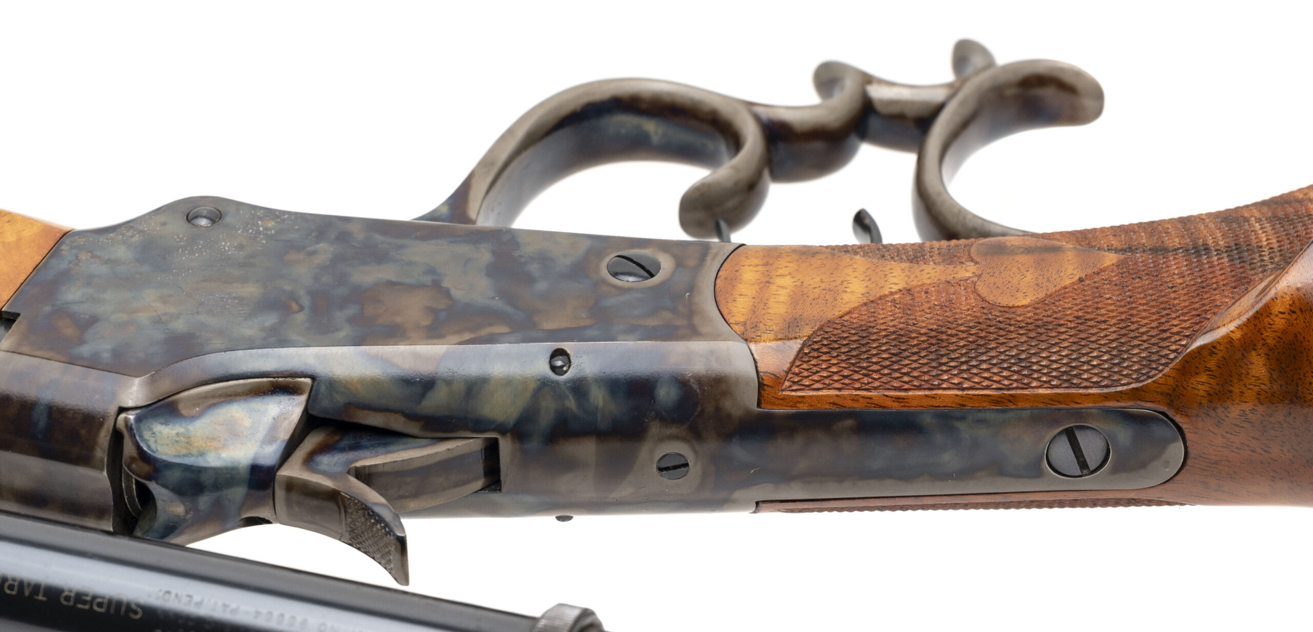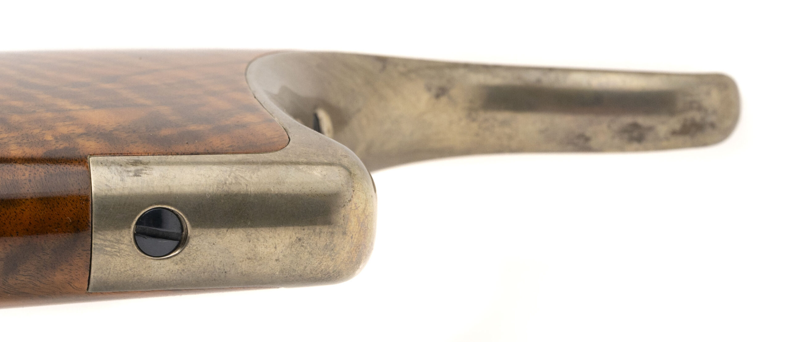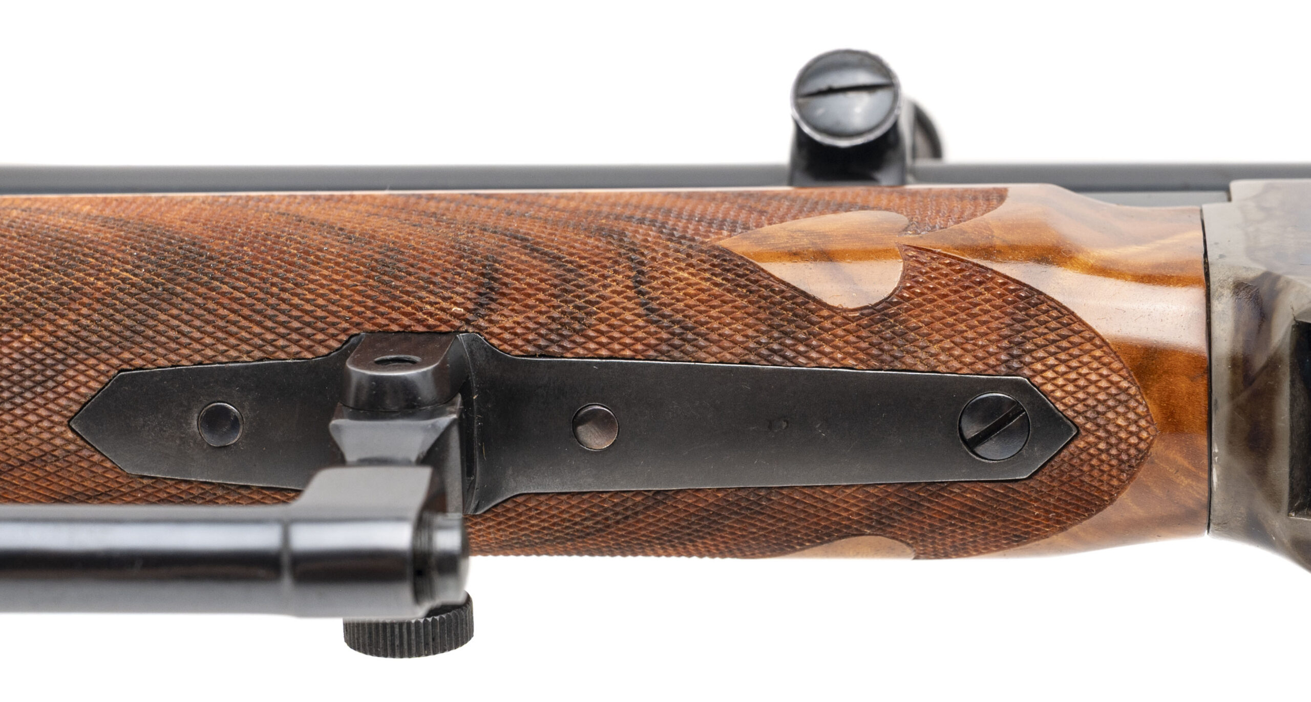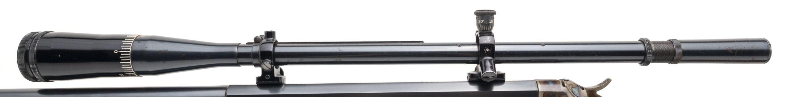 Serial number 62770. Made in 1893. 22 LR caliber with a 27” barrel bull, half round half octagon barrel. This gun is in like new condition as customized. The barrel has 100% of the blue. The frame has very well done case colors with a small area on the right hand side that appears to have laid up against something. The stock is finely figured and checkered in a Fleur D’Lis style. This gun has a half Schutzen style butt plate. Action works perfect and bore is excellent.