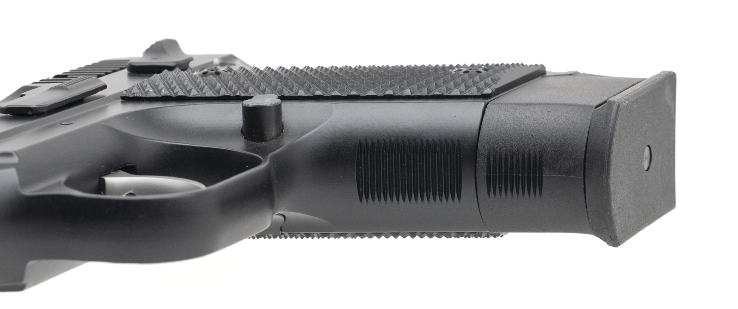 SN: C838395. Modern production, 9mm with a 3" barrel. Bore is excellent. Sub-compact steel frame double-action pistol with a fiber-optic front sight, manual decocker, Cajun Gun Works upgraded trigger & action, matte black finish, and custom checkered polymer grips. Overall condition is excellent. Includes an additional magazine, and original case.