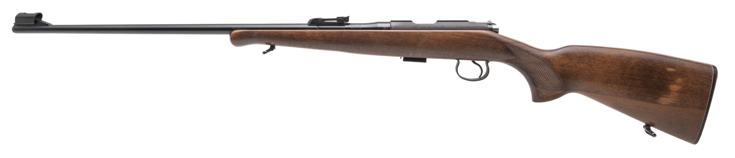 SN: A092333 modern production 22lr bolt action rifle with a 24" round barrel, hooded ramped front sight, adjustable ladder style rear sight, receiver dovetailed for scope mounts, detachable magazine and checkered walnut stock with the original butt plate and sling swivels. Overall in near excellent condition with an excellent bore.