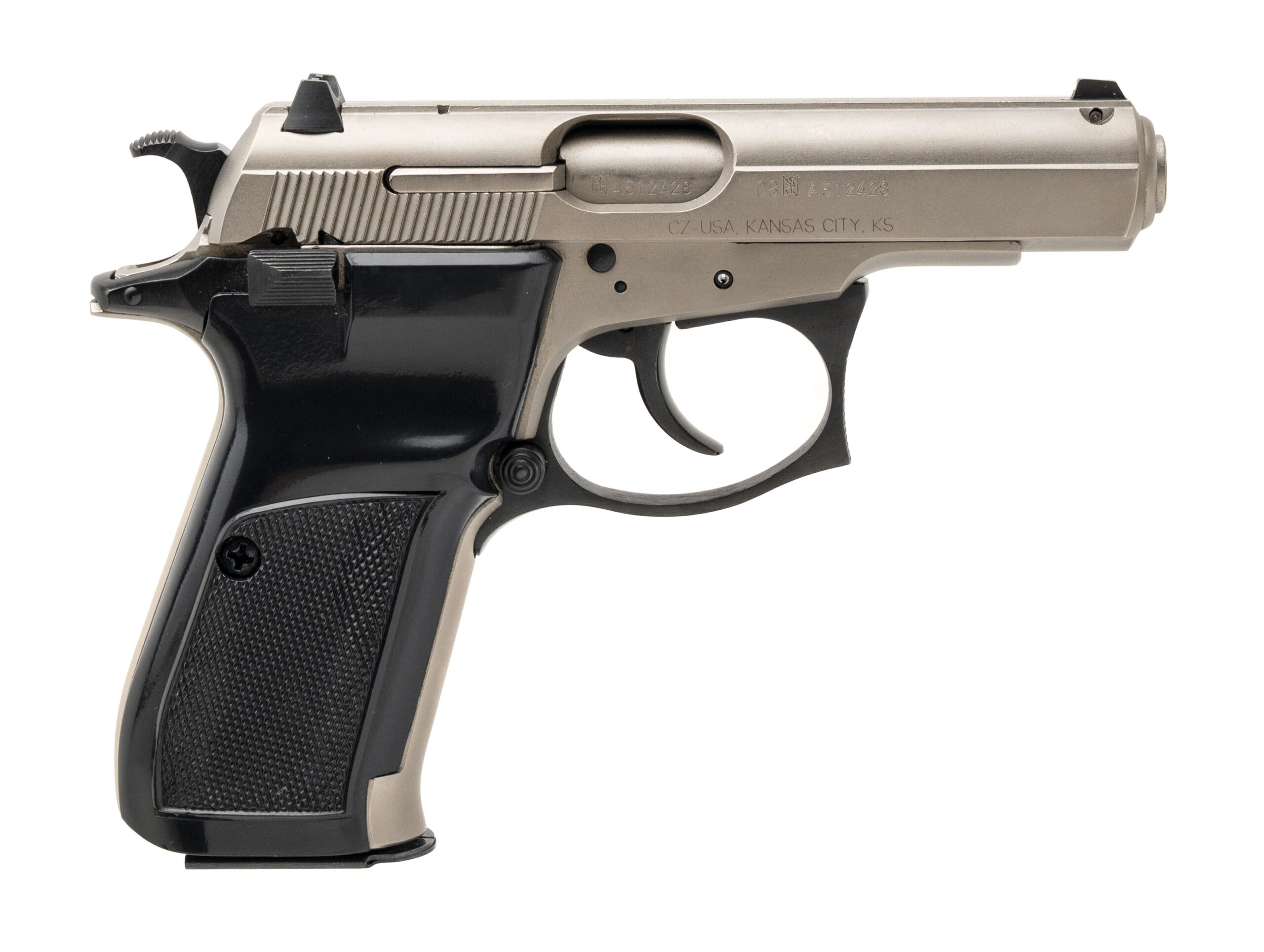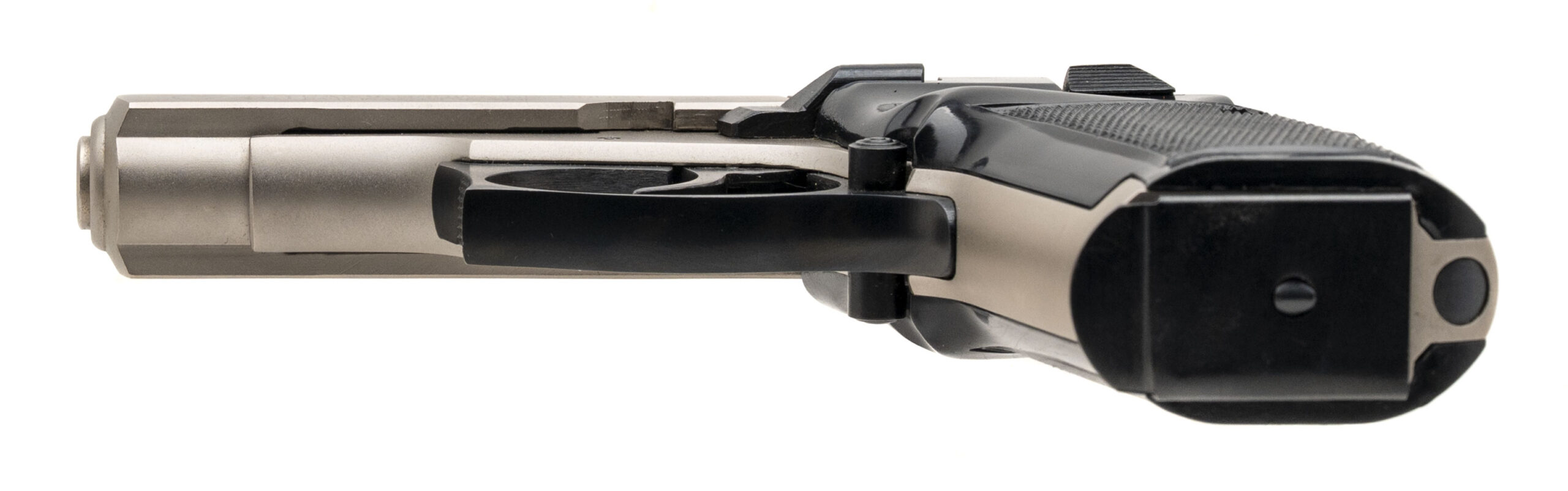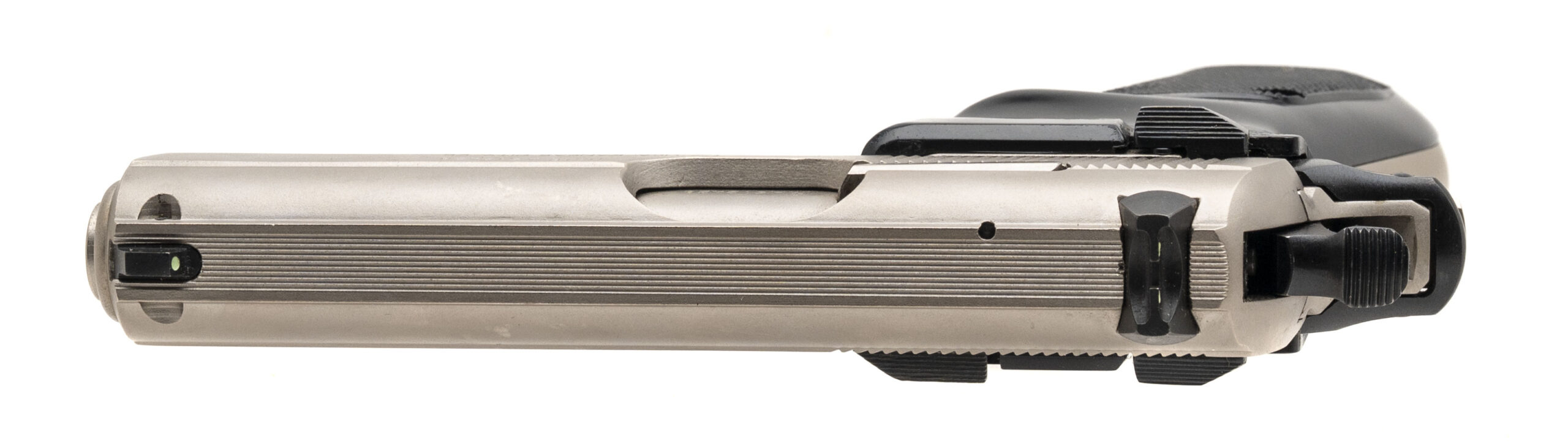 SN: A512428. Modern production, .380 ACP with a 3.8" barrel. Bore is excellent. Double-action pistol with manual thumb-safety, ambidextrous magazine release, satin nickel finish, and black plastic grips. Minor marks to finish, notably to the rear of the slide. Overall condition is very good.