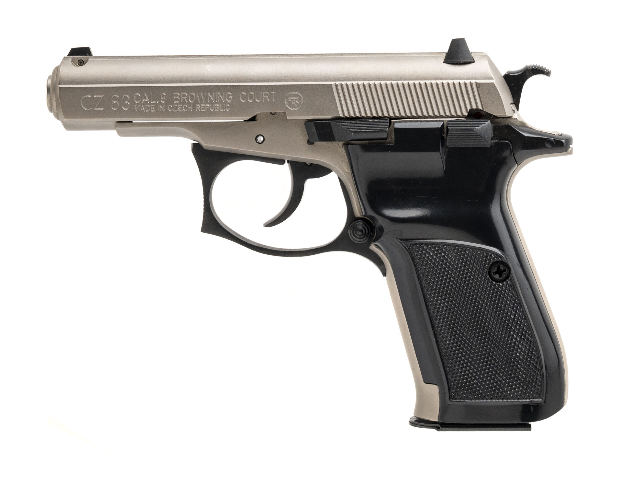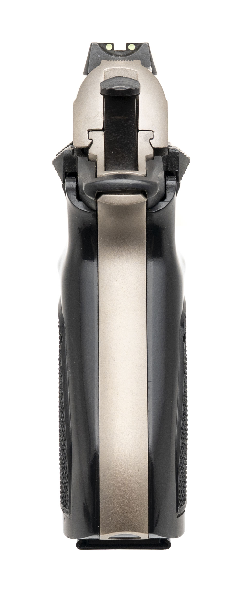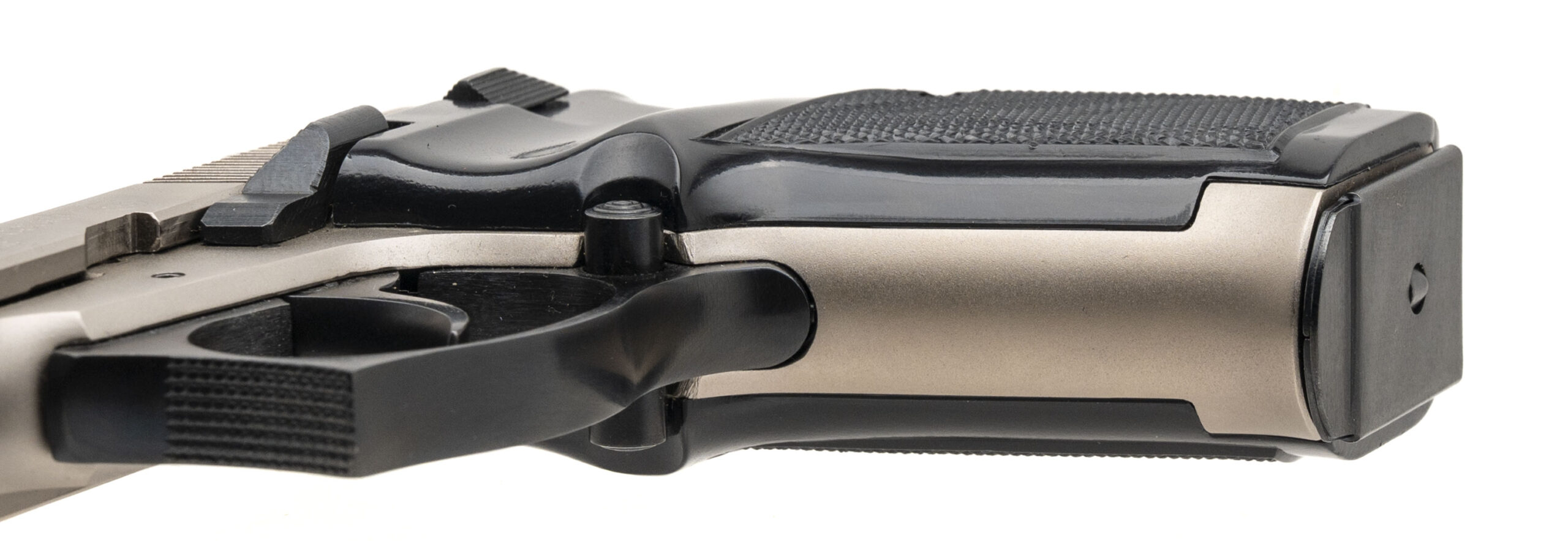 SN: A512428. Modern production, .380 ACP with a 3.8" barrel. Bore is excellent. Double-action pistol with manual thumb-safety, ambidextrous magazine release, satin nickel finish, and black plastic grips. Minor marks to finish, notably to the rear of the slide. Overall condition is very good.