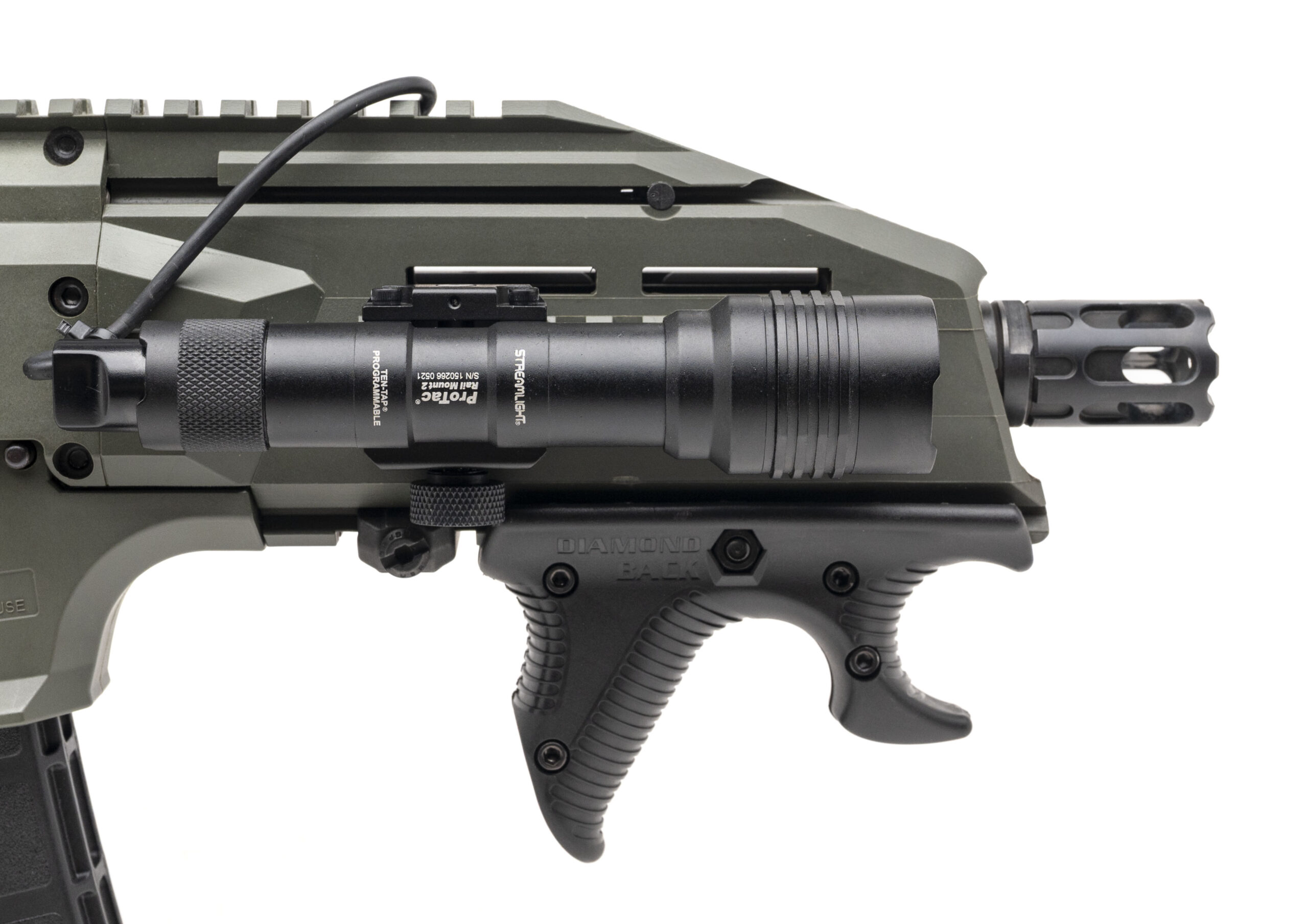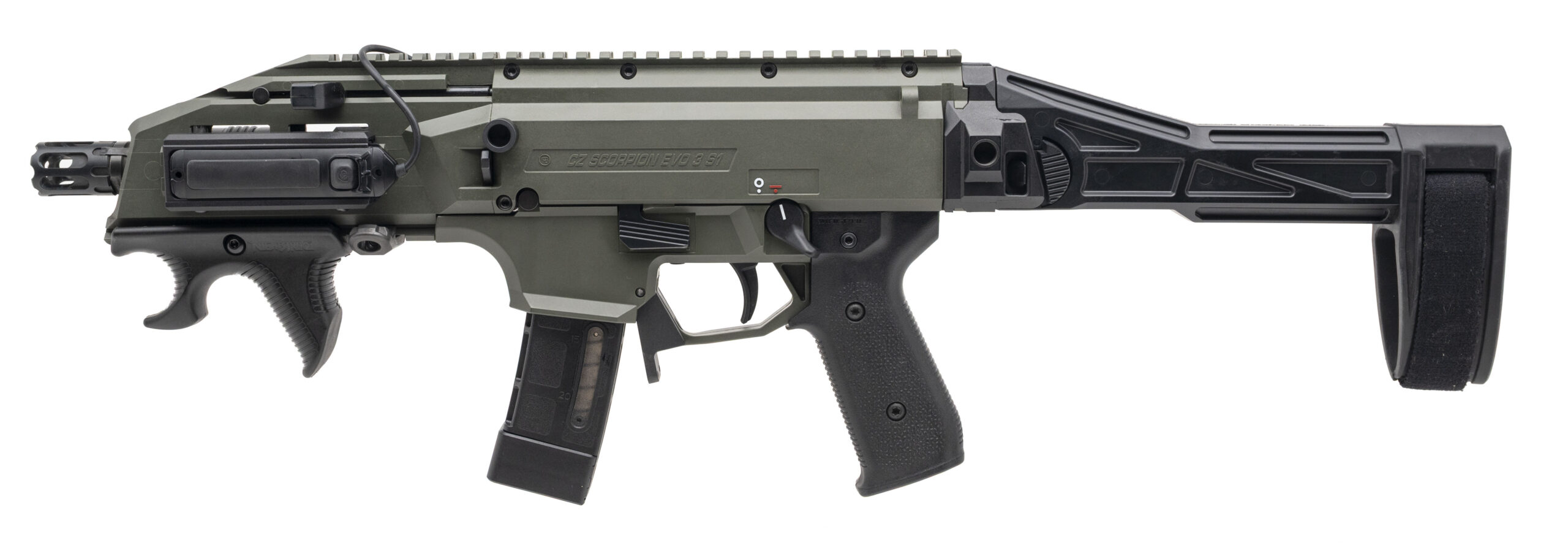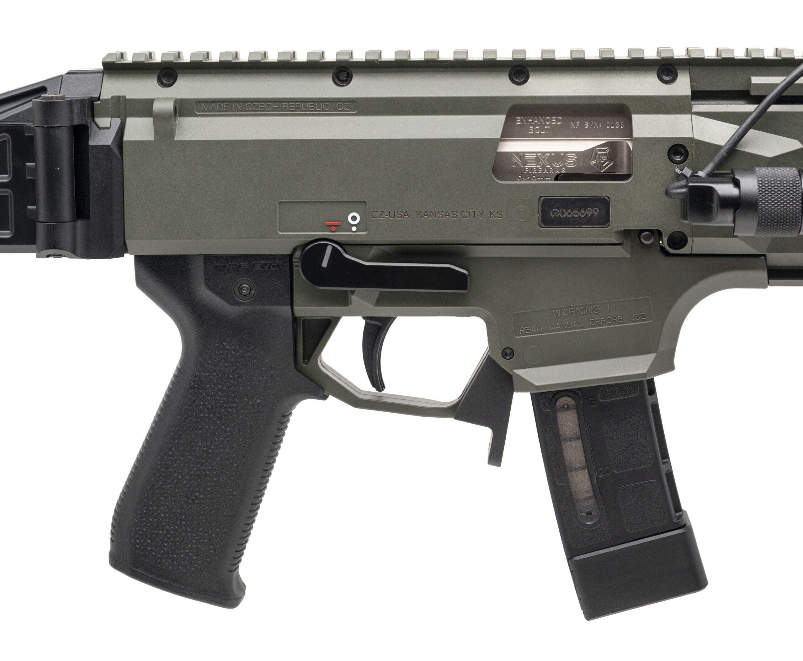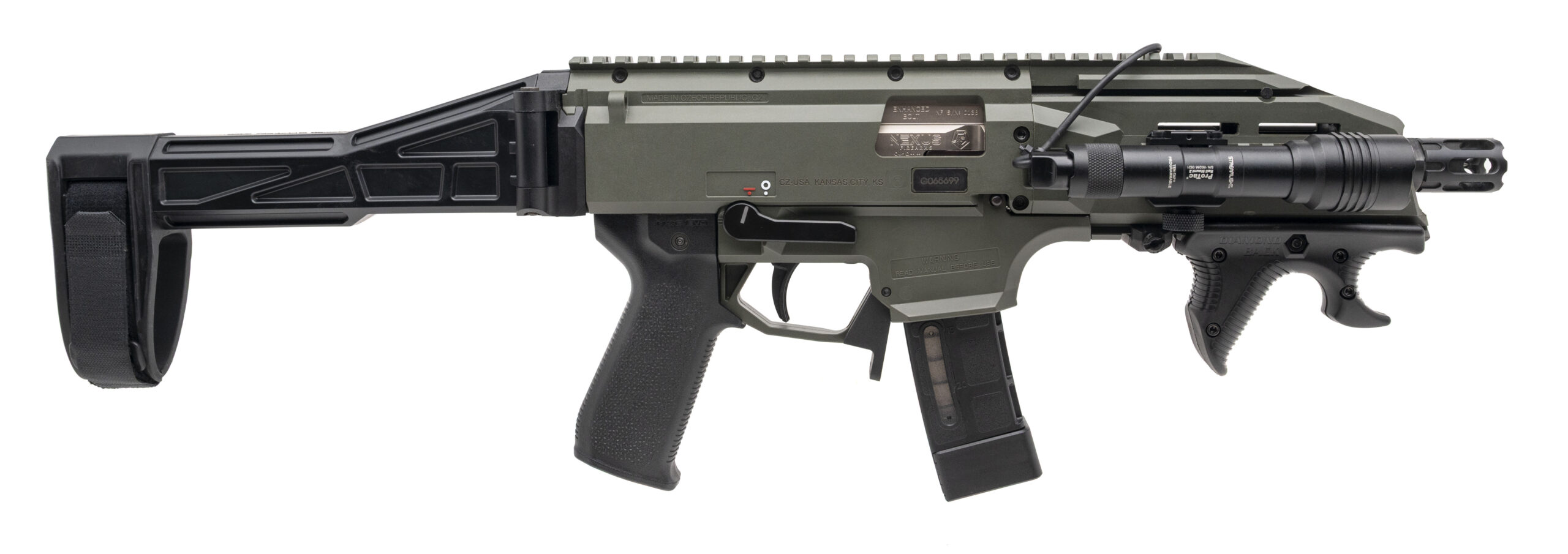 SN: G065699. Modern production, 9mm with a 7.8" barrel. Bore is bright with strong rifling. Czech made tactical pistol with an ODG finish, Streamlight ProTac flashlight w/Cloud Defense pressure switch, Night Strike angled grip, upgraded Nexus Firearms bcg, extended controls, and an SB Tactical side-folding stabilizing brace. Excellent condition overall.