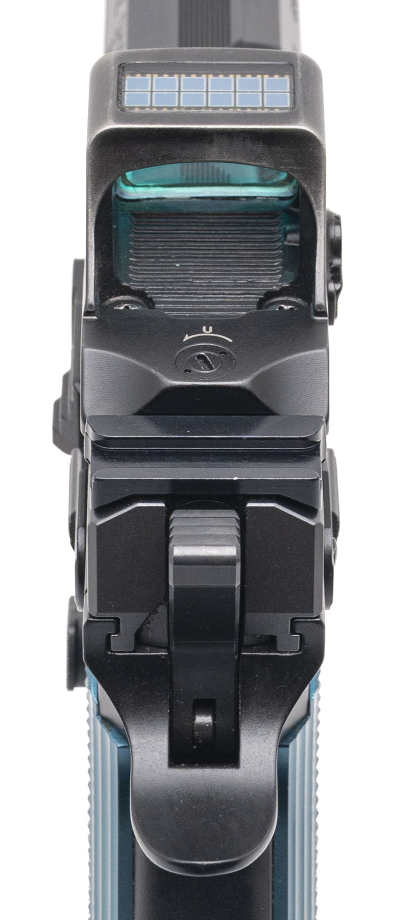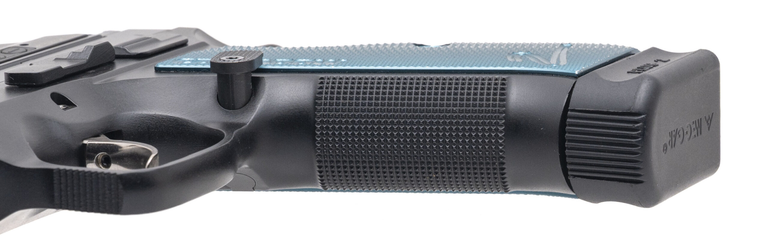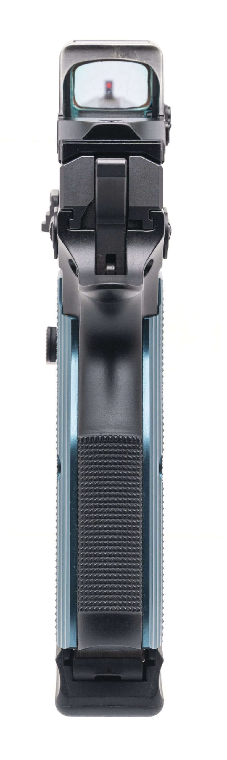 SN: G380706. Modern production, 9mm with a 4.89" barrel. Bore is very good. Czech made double action pistol with a Holosun 508T green dot optic, blue aluminum grips, and ambidextrous safety. Very good condition overall.