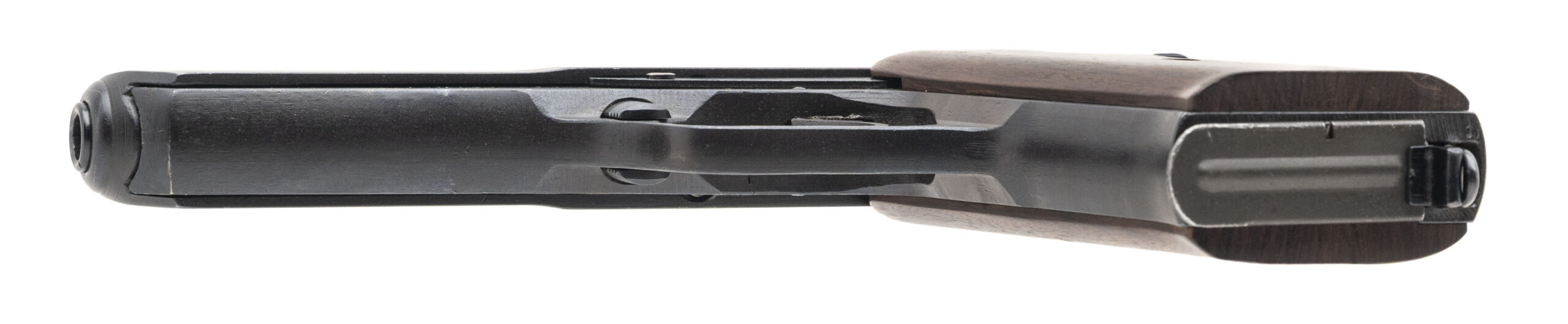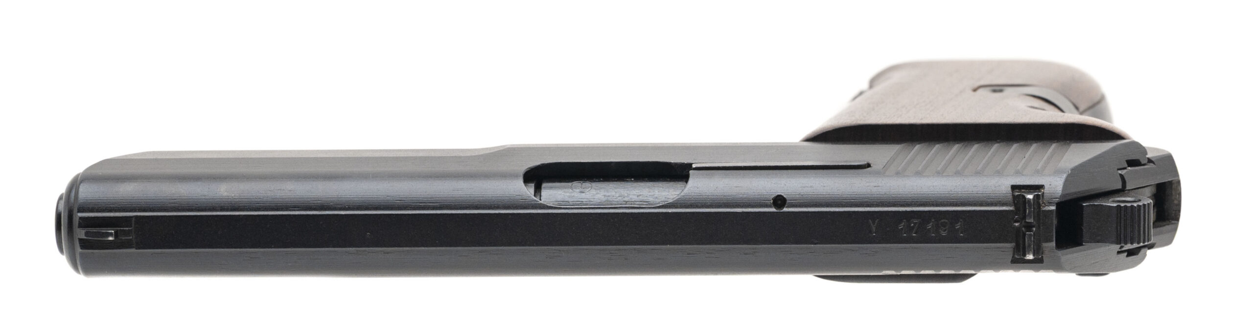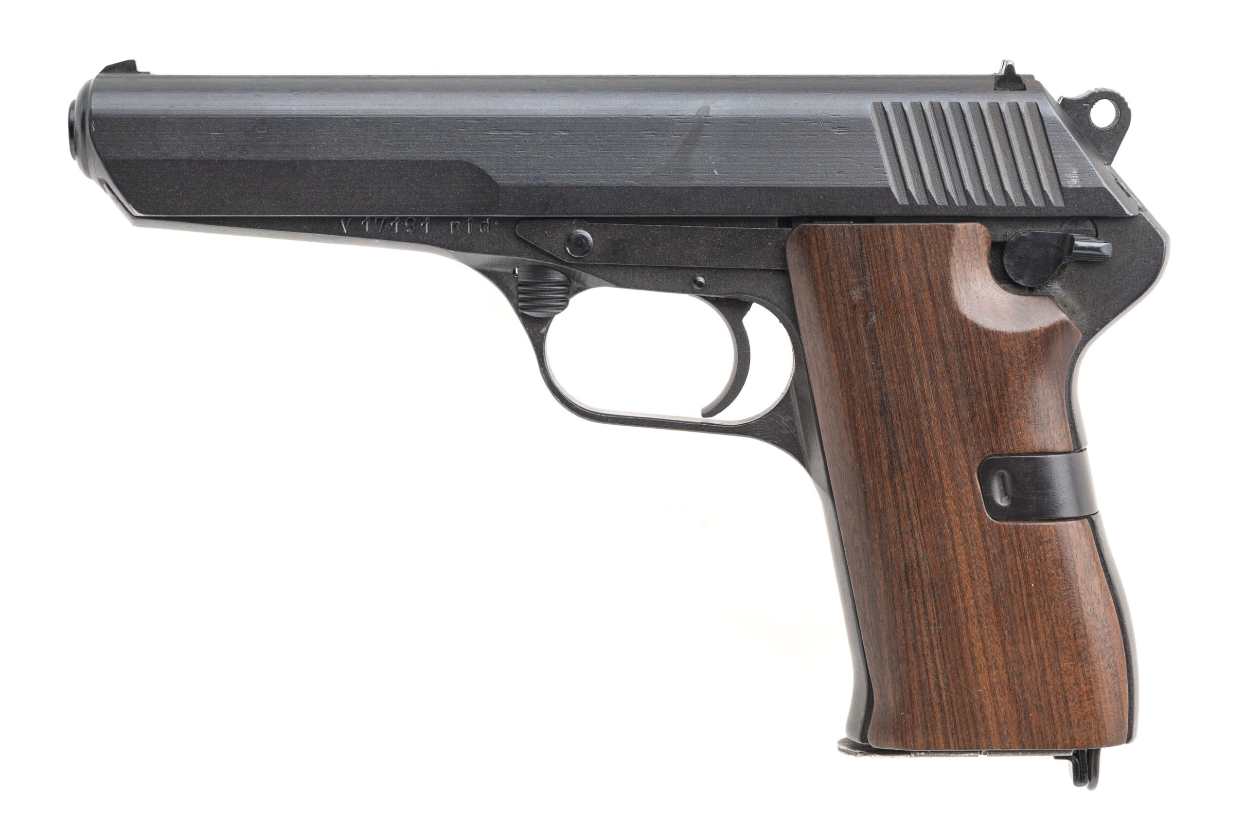 SN: V17191. Made in 1953 by Česká Zbrojovka Strakonice with a 4.7-inch barrel that has a bright bore with strong rifling that has some frosting between the grooves. This Cold War era roller-locked short recoil-operated military service pistol is in excellent condition with original factory phosphate finish across the metallic parts & a handsome pair of wood grips. Comes with cleaning rod, two 8-round magazines & a leather flap holster.