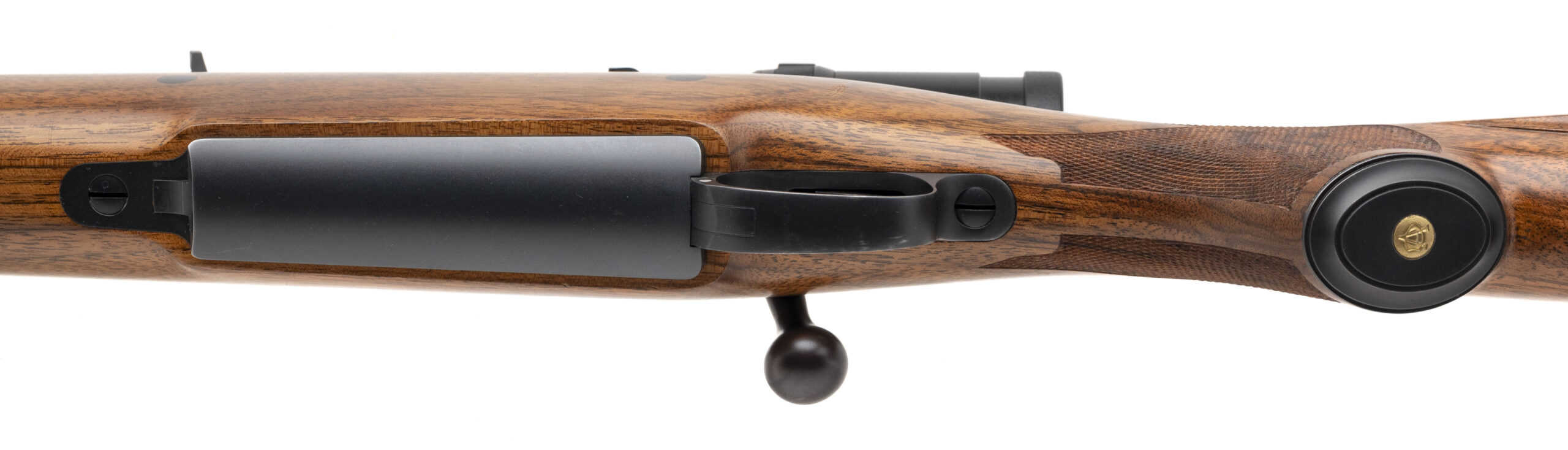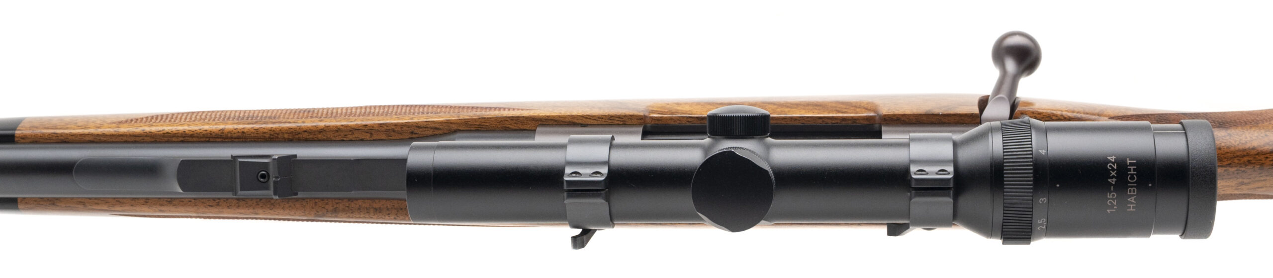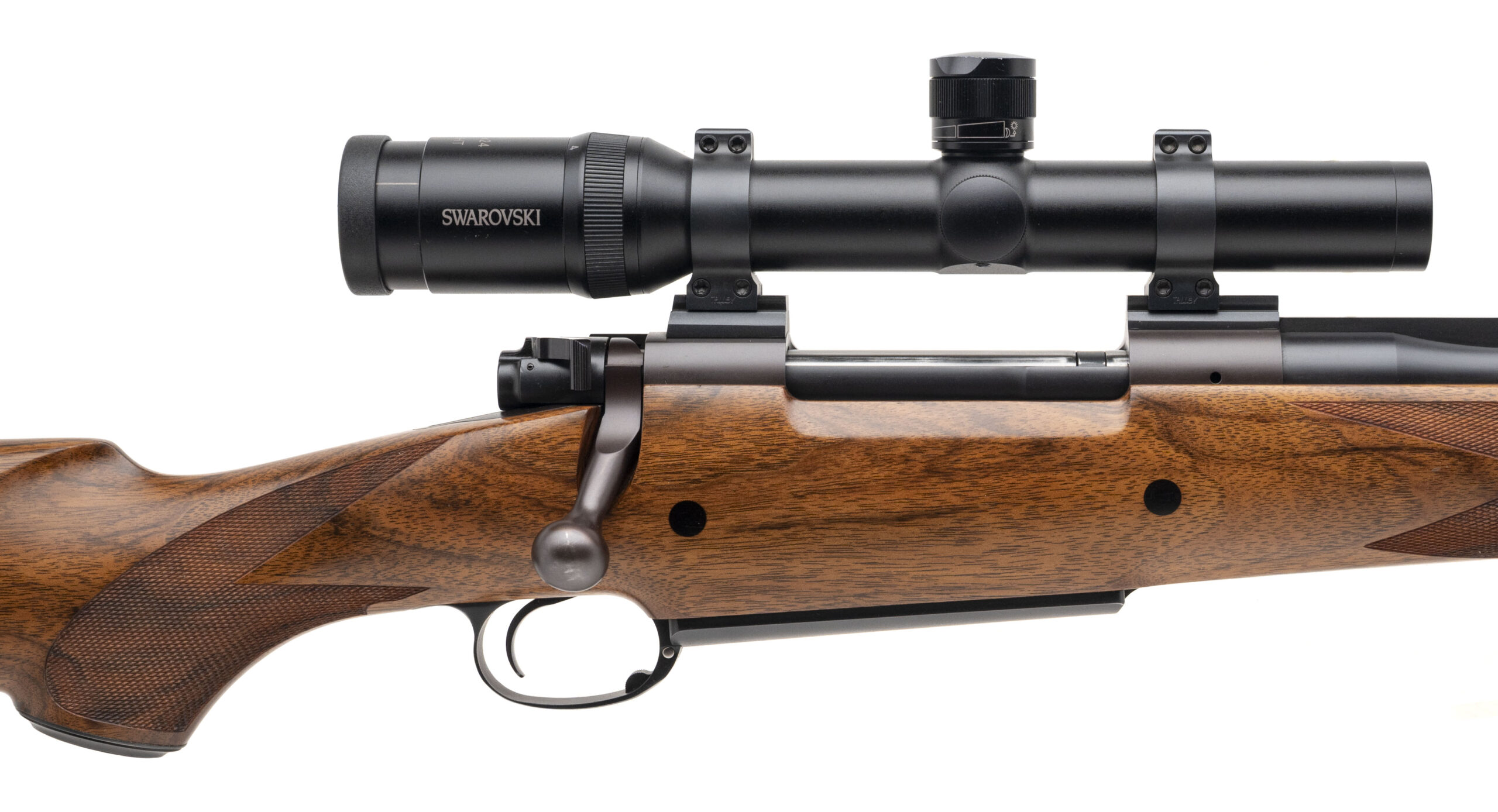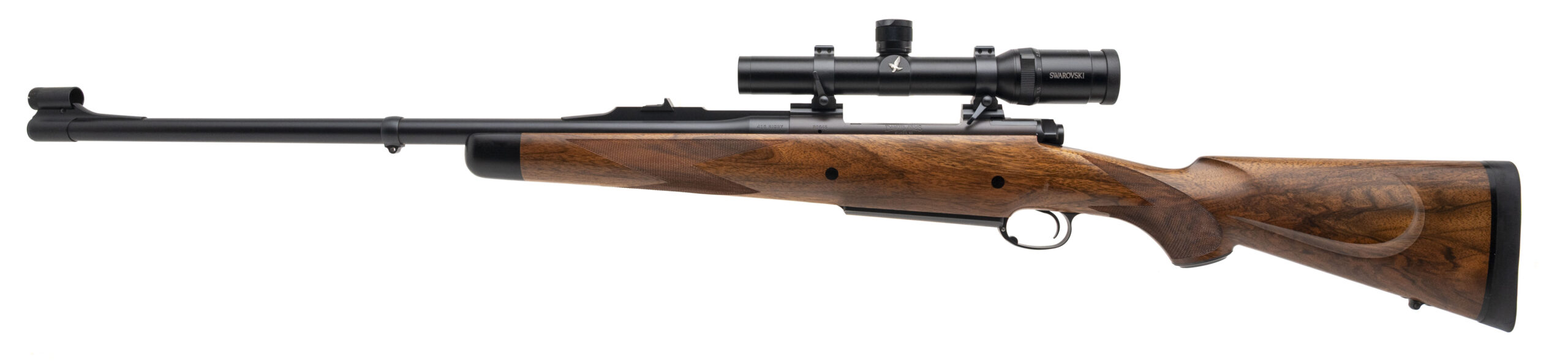 SN: R0648 modern custom built big bore bolt action African Safari dangerous game hunting rifle chambered in 416 Rigby with a 24" round barrel, banded ramp front sight with sight hood, barrel band sling swivel, quarter rib with rear express sight and Talley mounts holding a Swarovski Habicht 1.25-4x24 scope. Custom built action, control round feed with full length claw extractor with a Winchester 70 style 3 position safety and hinged bottom metal. Custom hand made checkered walnut stock with ebony forend tip, 2 recoil bolts, capped pistol grip with gold engraved button, inlaid rear sling swivel and a rubber recoil pad. Some light hangling marks, overall in very good condition with an excellent bore. A beautiful true hand made classic safari rifle in a classic caliber.