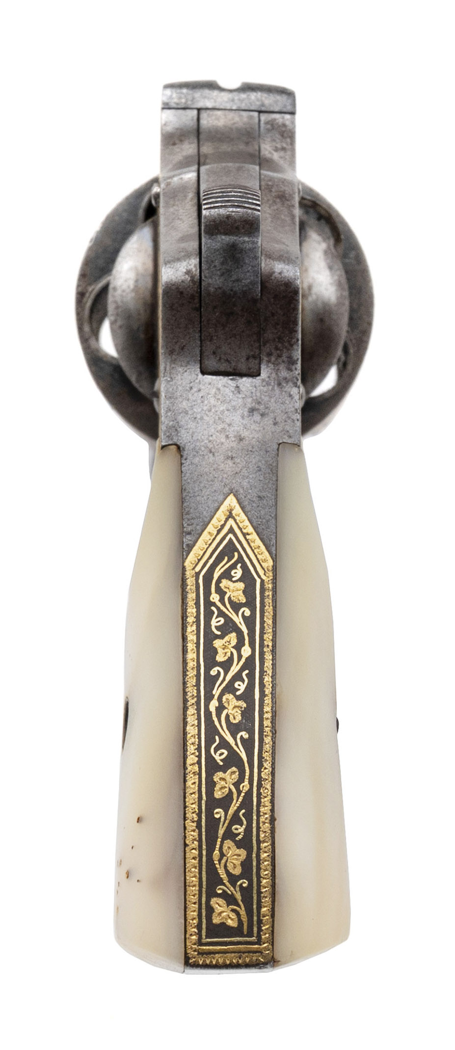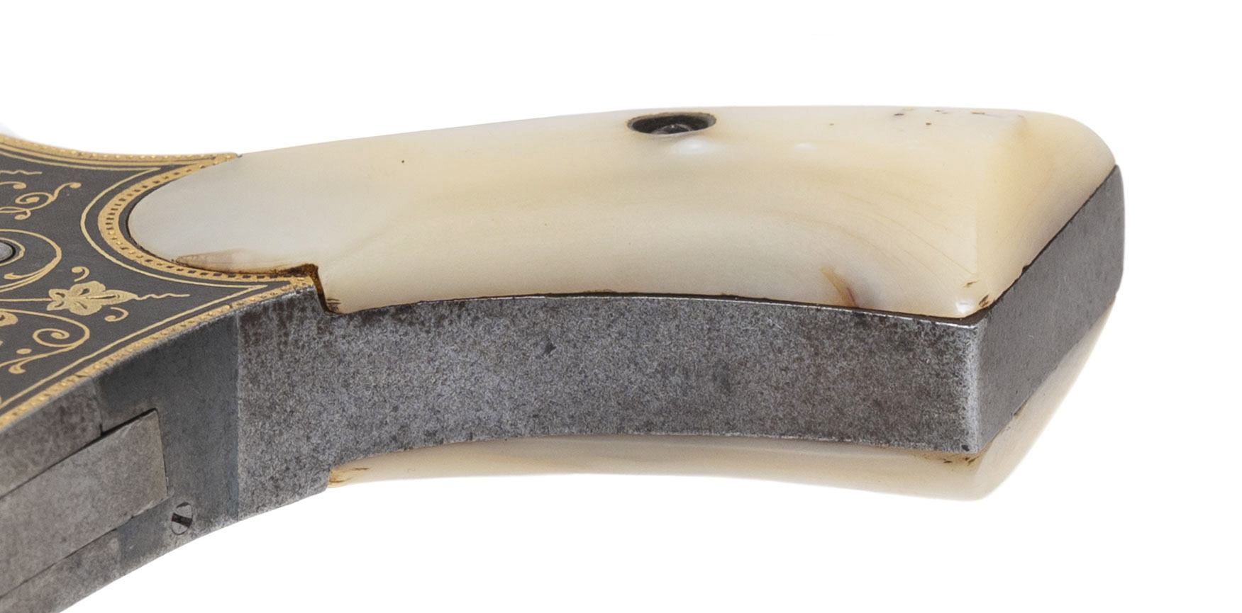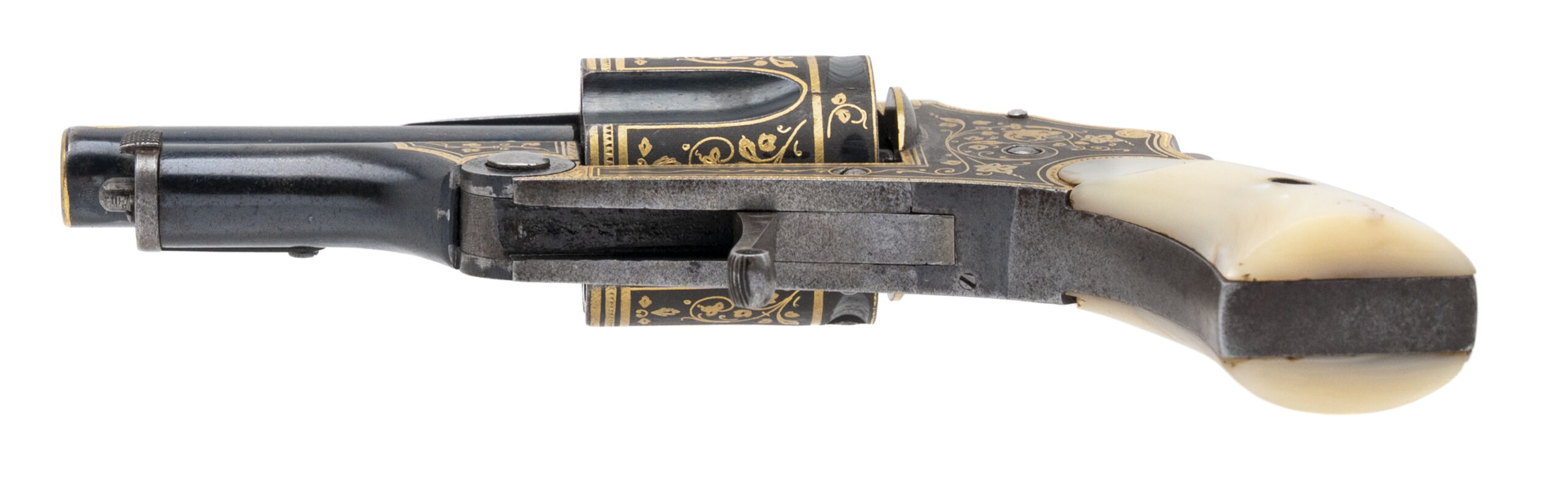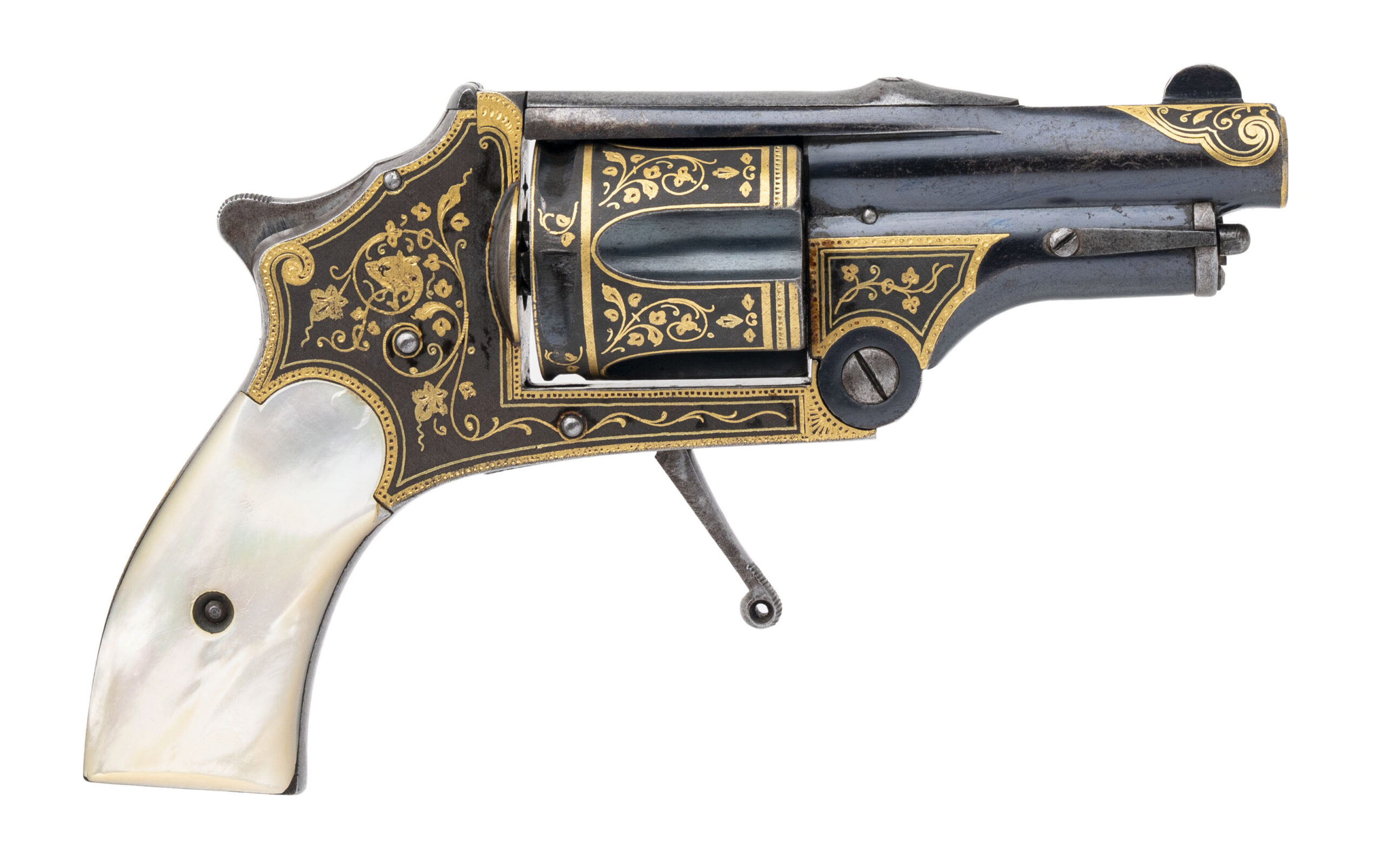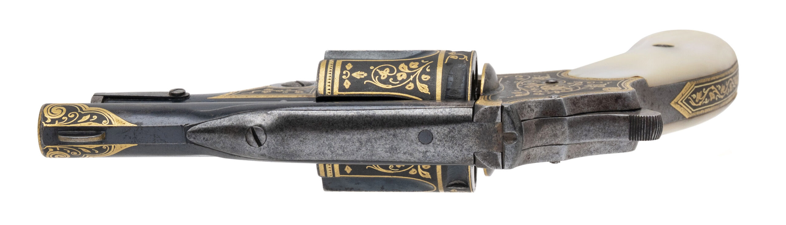 NSN. Made circa 1890s. 32 caliber with a 2.5” barrel. This gun is in excellent condition with 70% of the original blue and gold damascened finish. The grips are excellent two piece pearls.