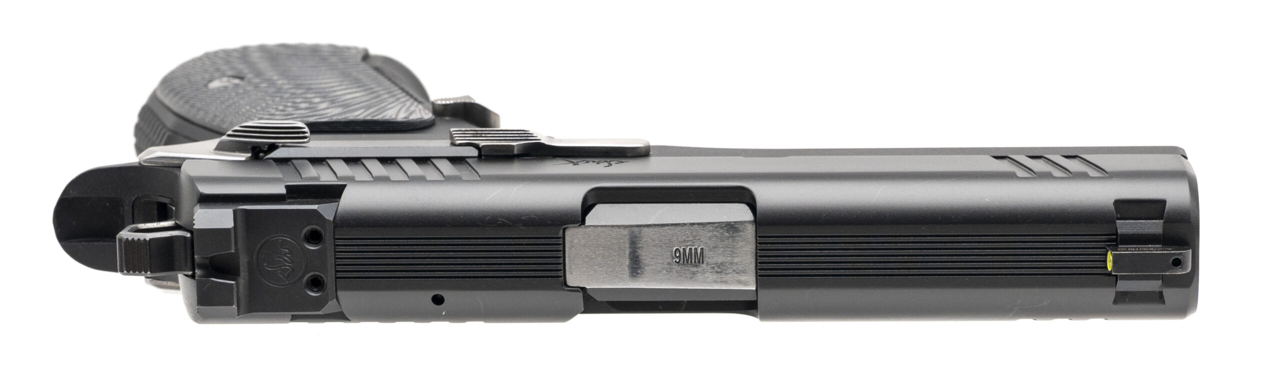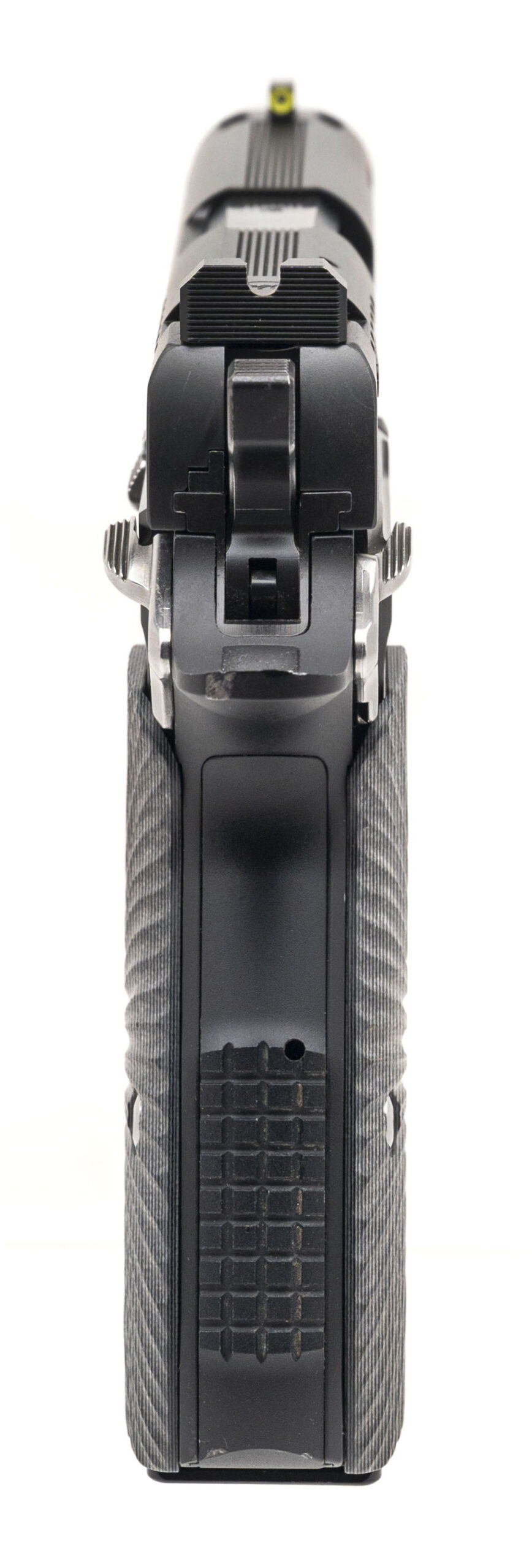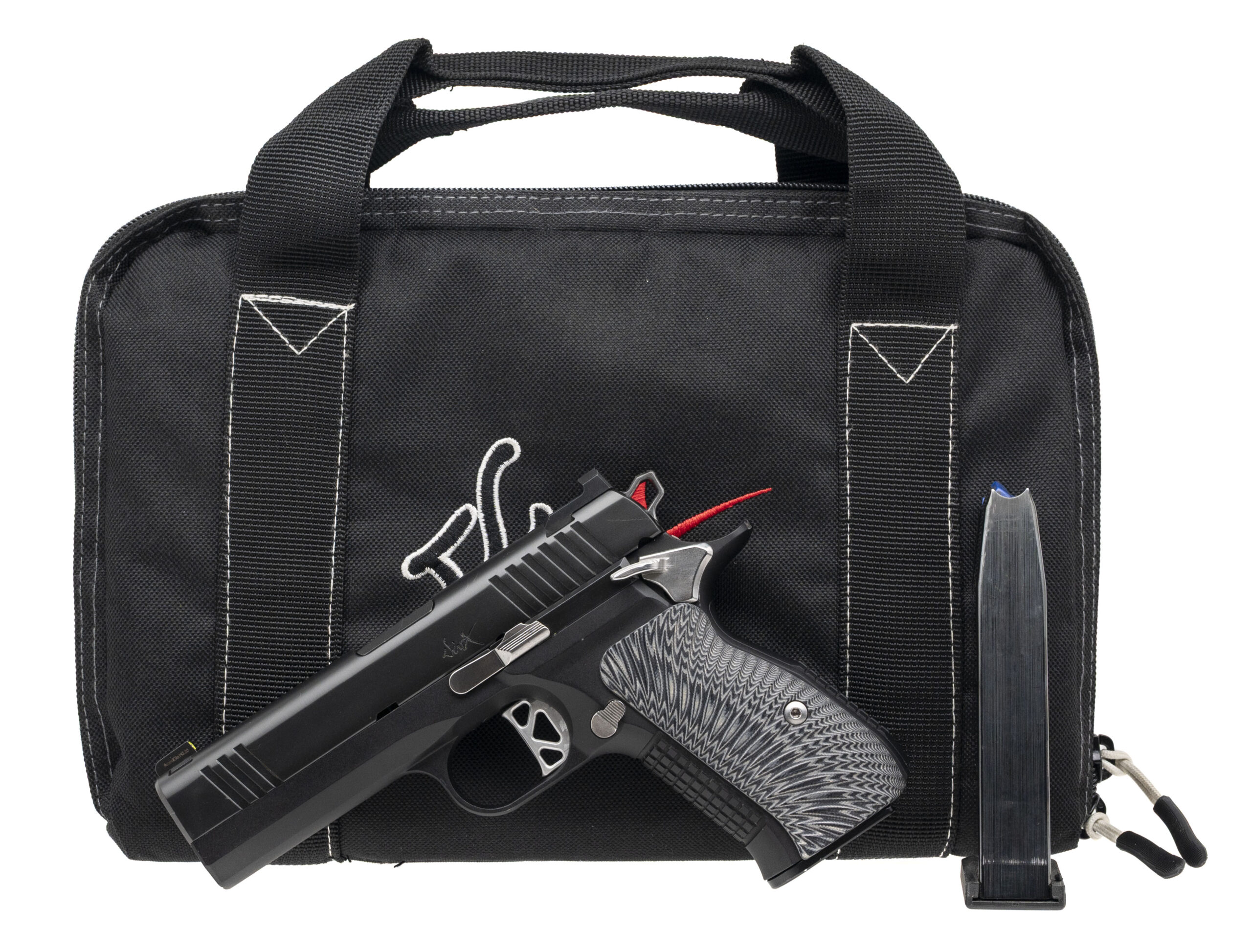 SN: X2201358. Modern production, 9mm with a 4" match grade bull barrel. Bore is bright with strong rifling. Compact alloy frame double stack 1911 style pistol with stainless accents, g10 grips, and a tritium front sight. Near excellent condition overall. Comes with DW carry bag and an extra magazine.