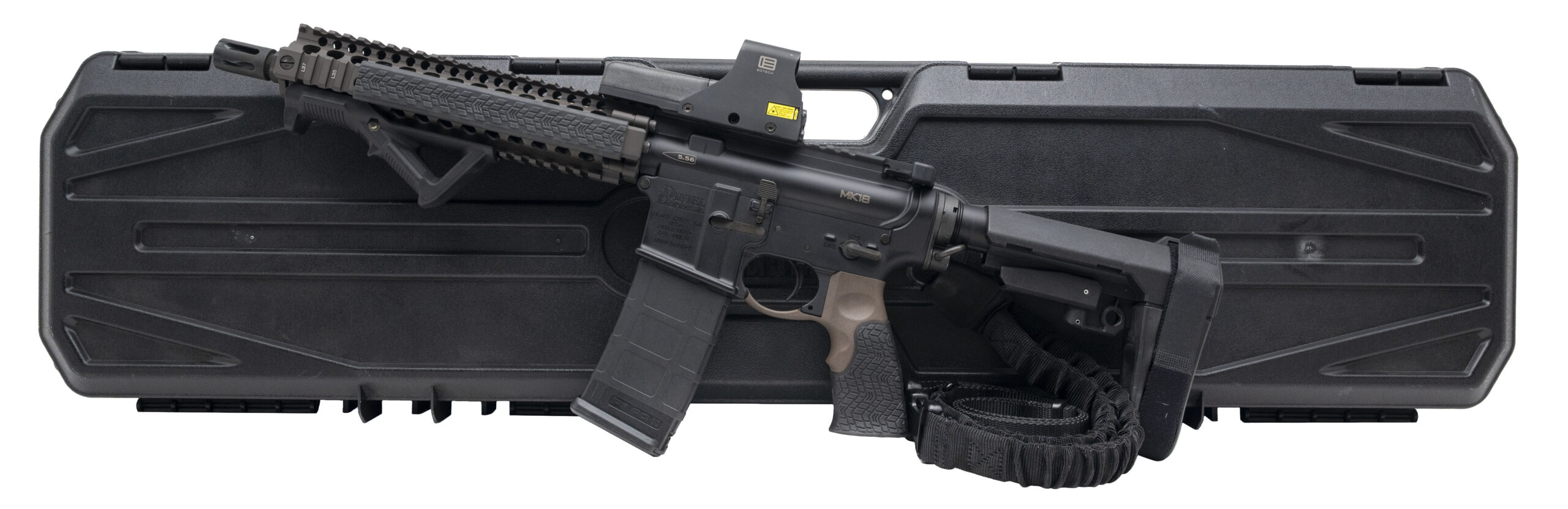 SN: DDM4360848. Modern production, 5.56 NATO with a 10.5" barrel. Bore is bright with strong rifling. Semi-auto tactical pistol with an Eotech 512 holographic weapon sight w/red circle dot, Magpul angled grip, and a one-point bungee sling. Overall condition is very good. Comes with case.
