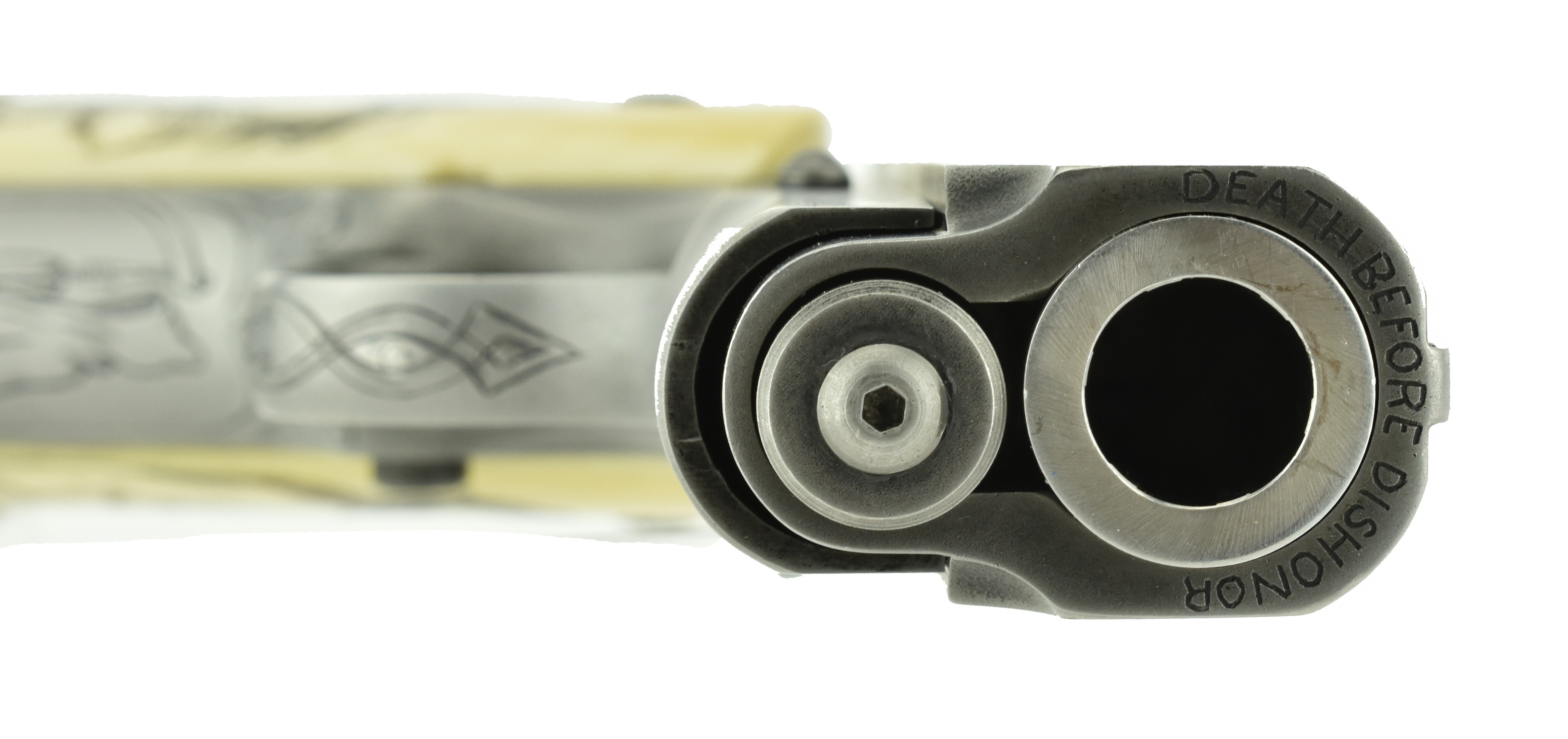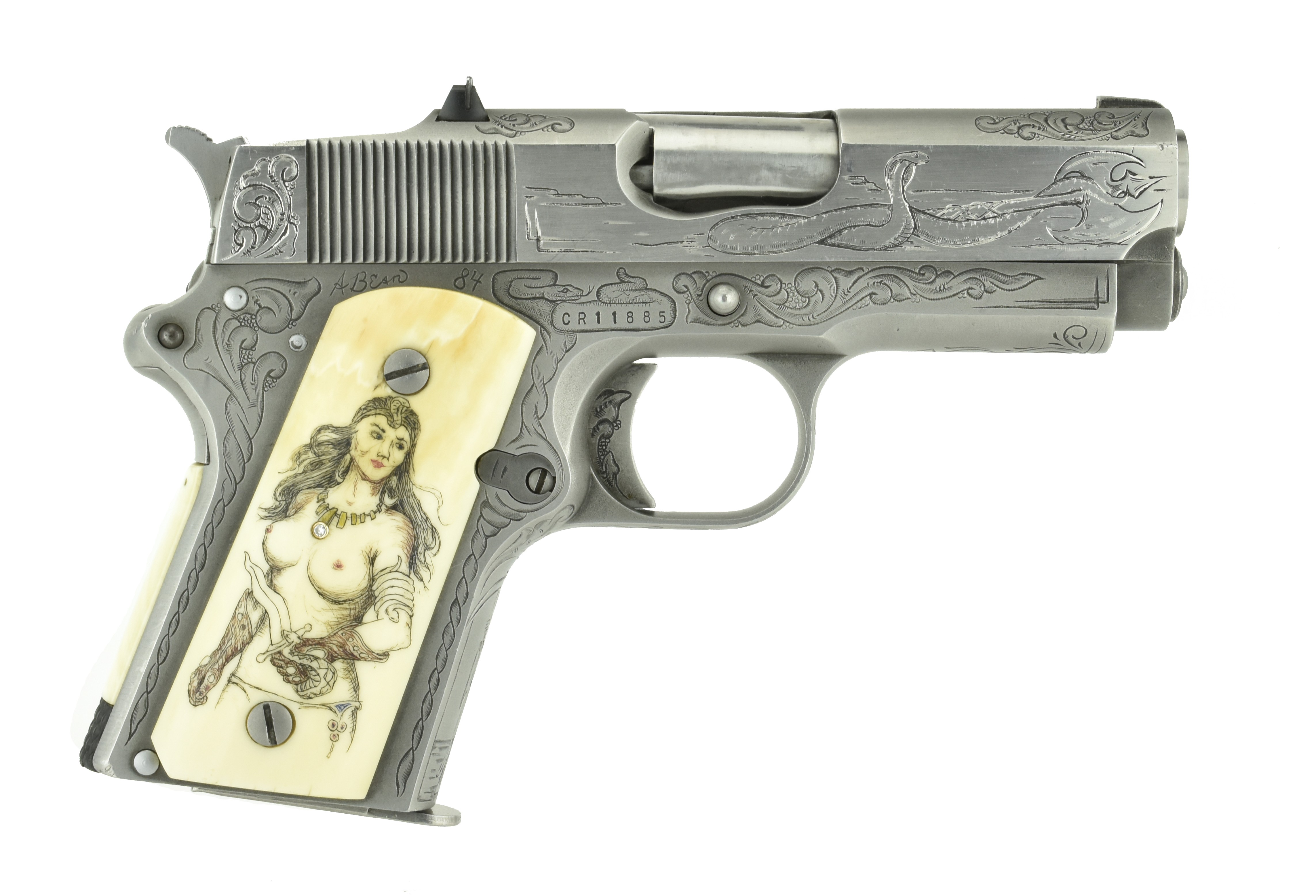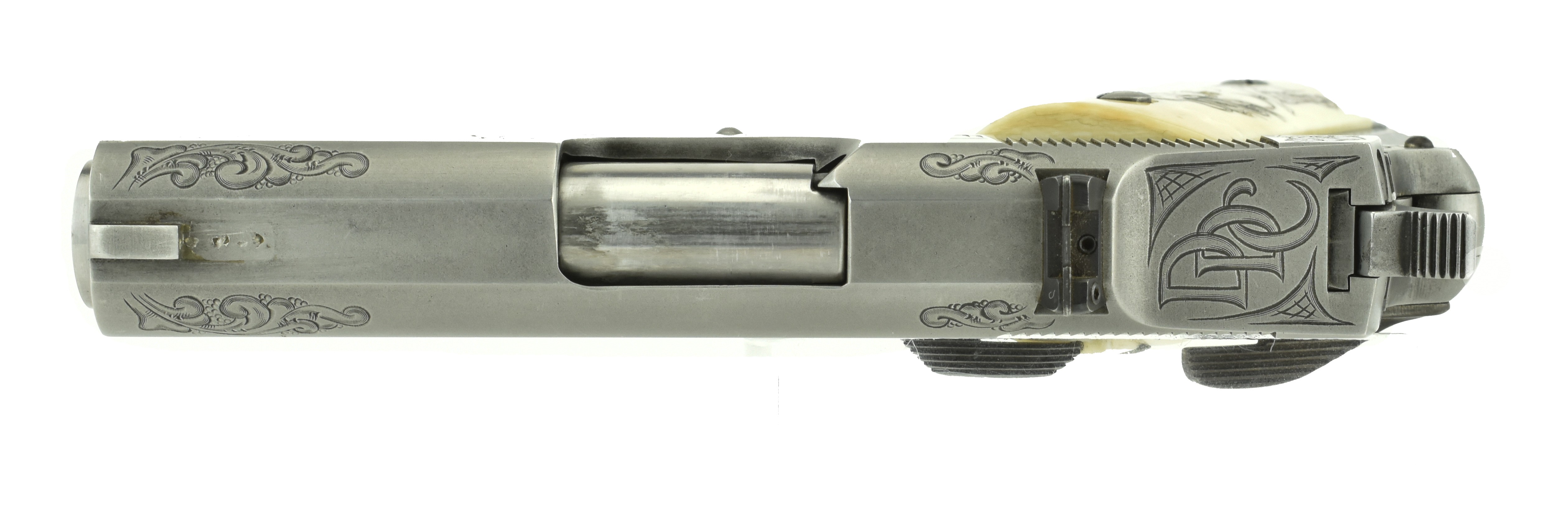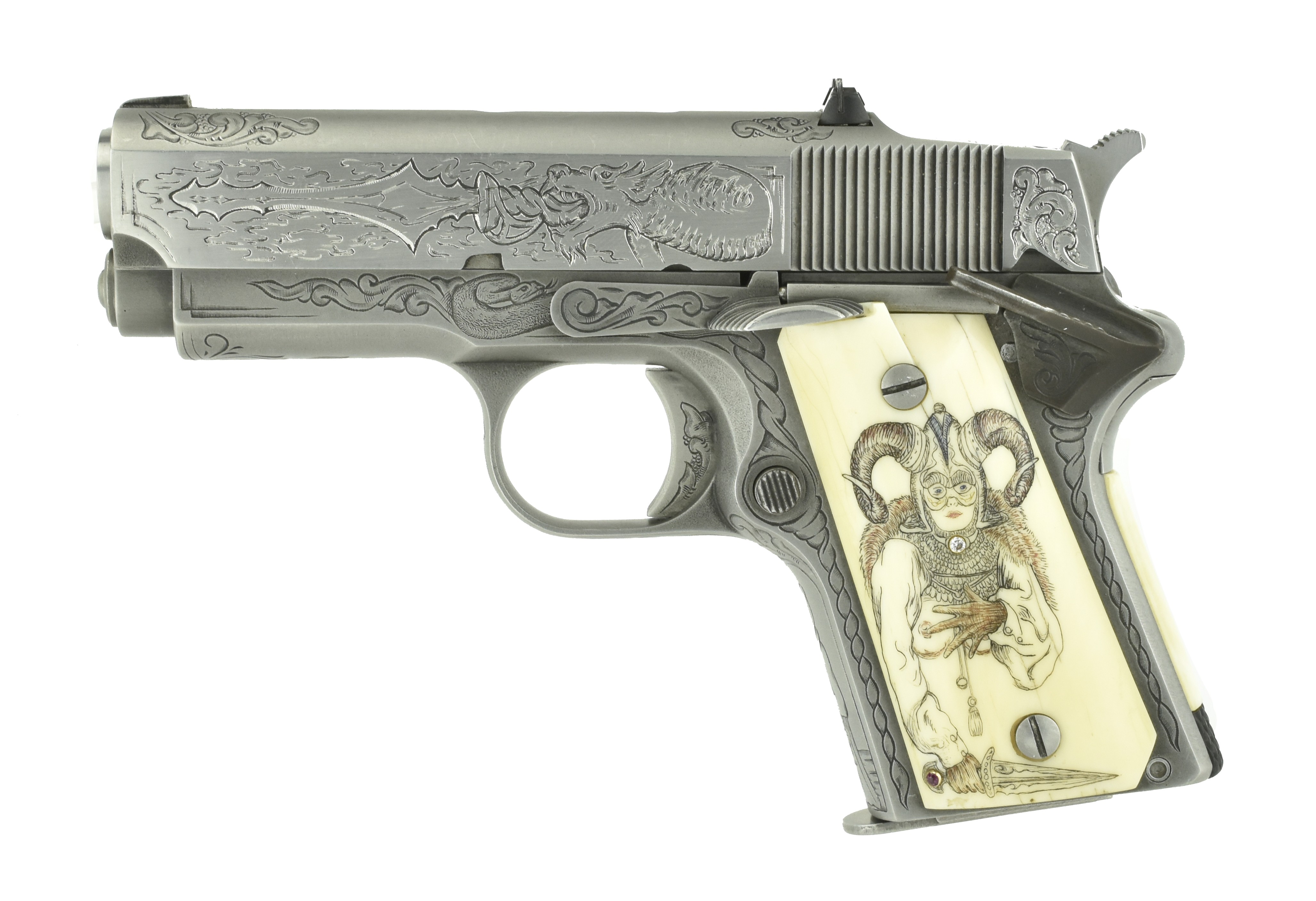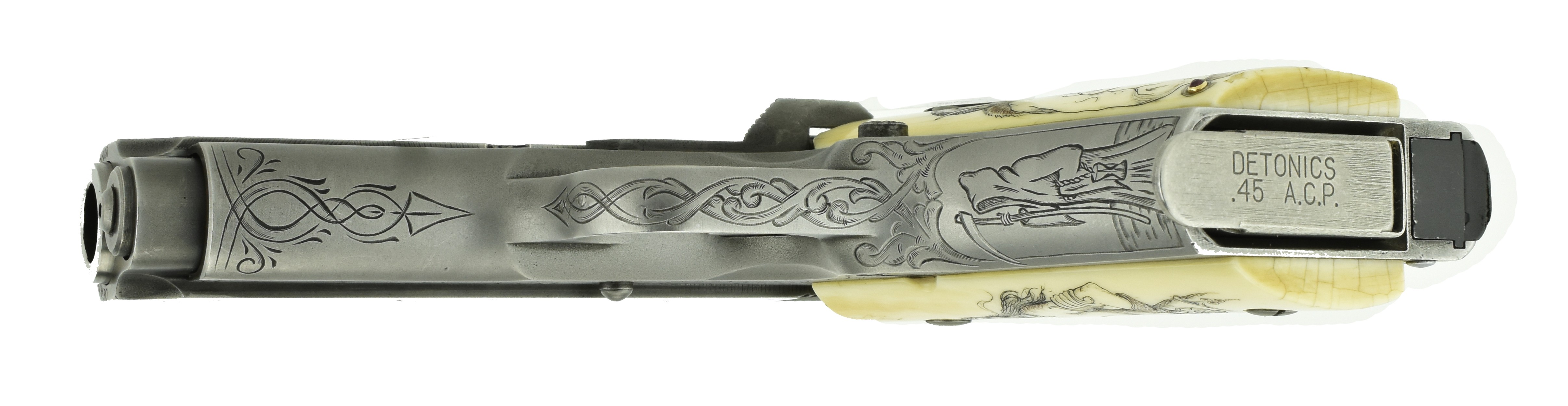 Detonics Combat Master .45 ACP caliber pistol. Beautiful custom engraved Detonics. Has fantasy themed scenes on the gun & carved in grips, which are genuine Ivory. A fancy piece!