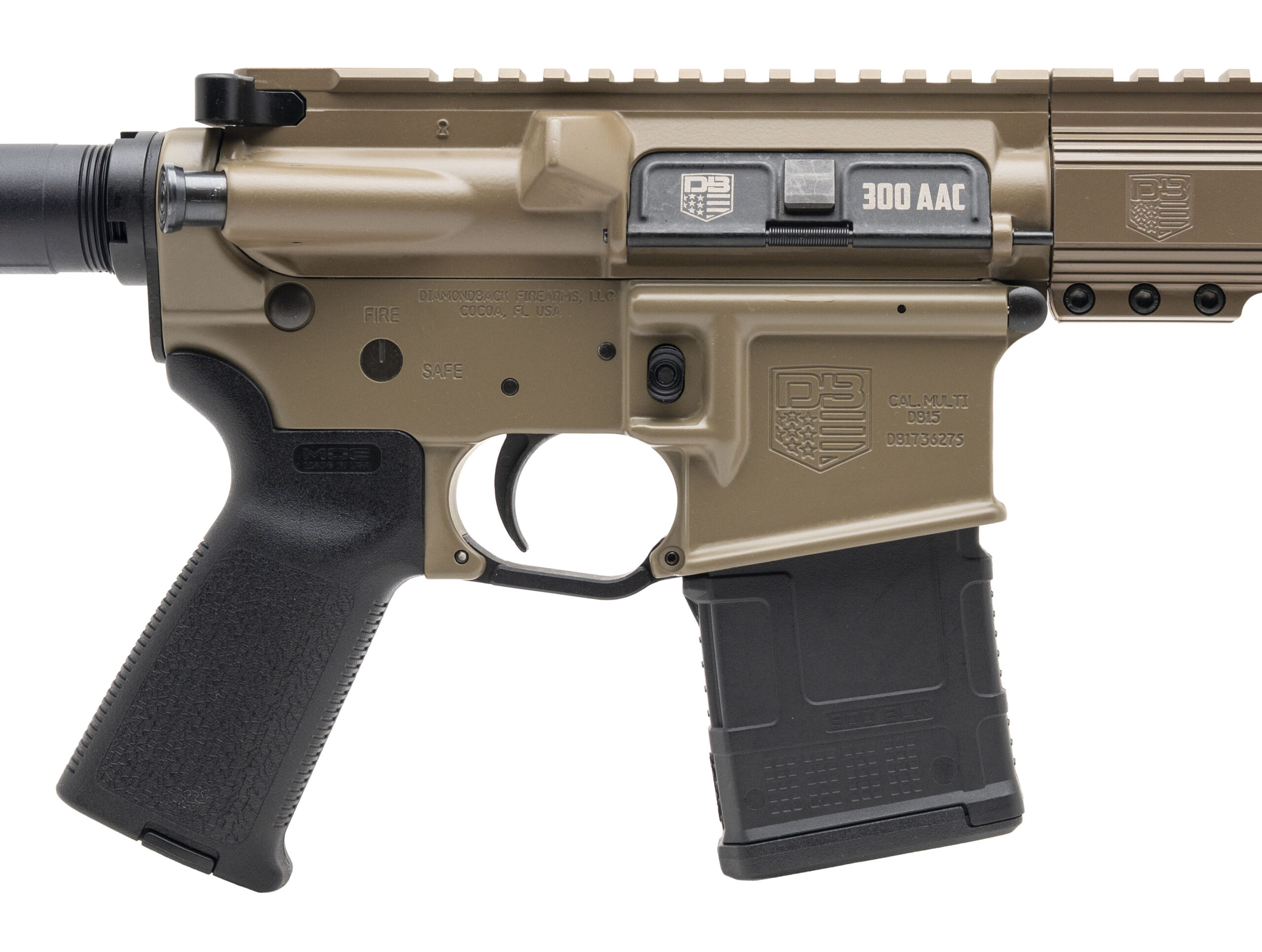 SN: DB1736275. Modern production, .300 Blackout with a 16" barrel. FDE finished semi-auto tactical rifle with a key mod/m-lok handguard. Overall condition is very good.