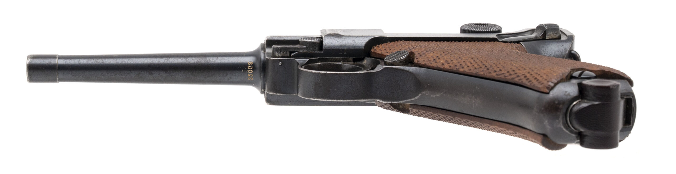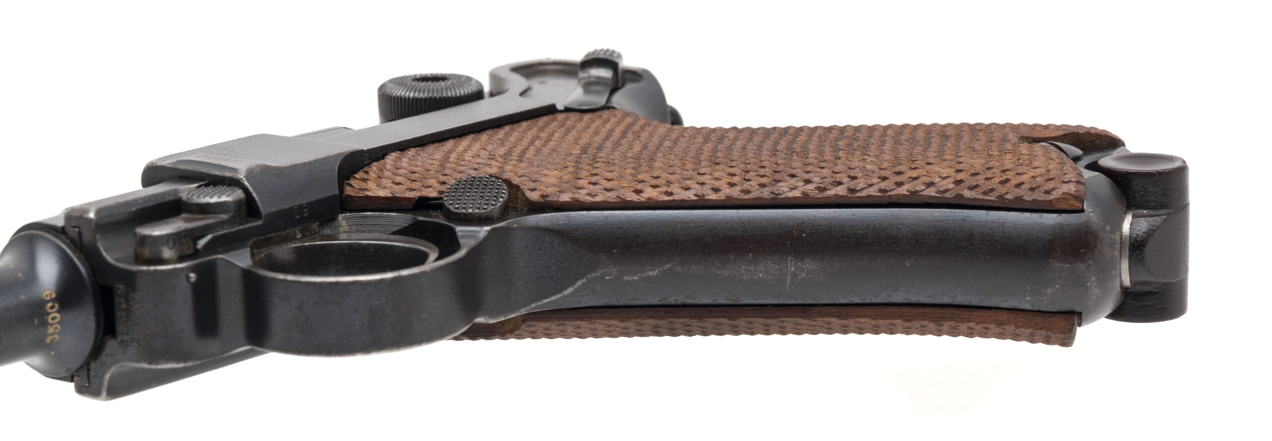SN: 35009. Early 1900's .30 Luger with a 4.75" barrel. Bore is good, evenly frosted with good rifling. Commercial American Eagle Luger made for import into the U.S. The metal is good with marks and wear throughout and about 80% blue mixed with patina. The grips are later replacements and are very good.