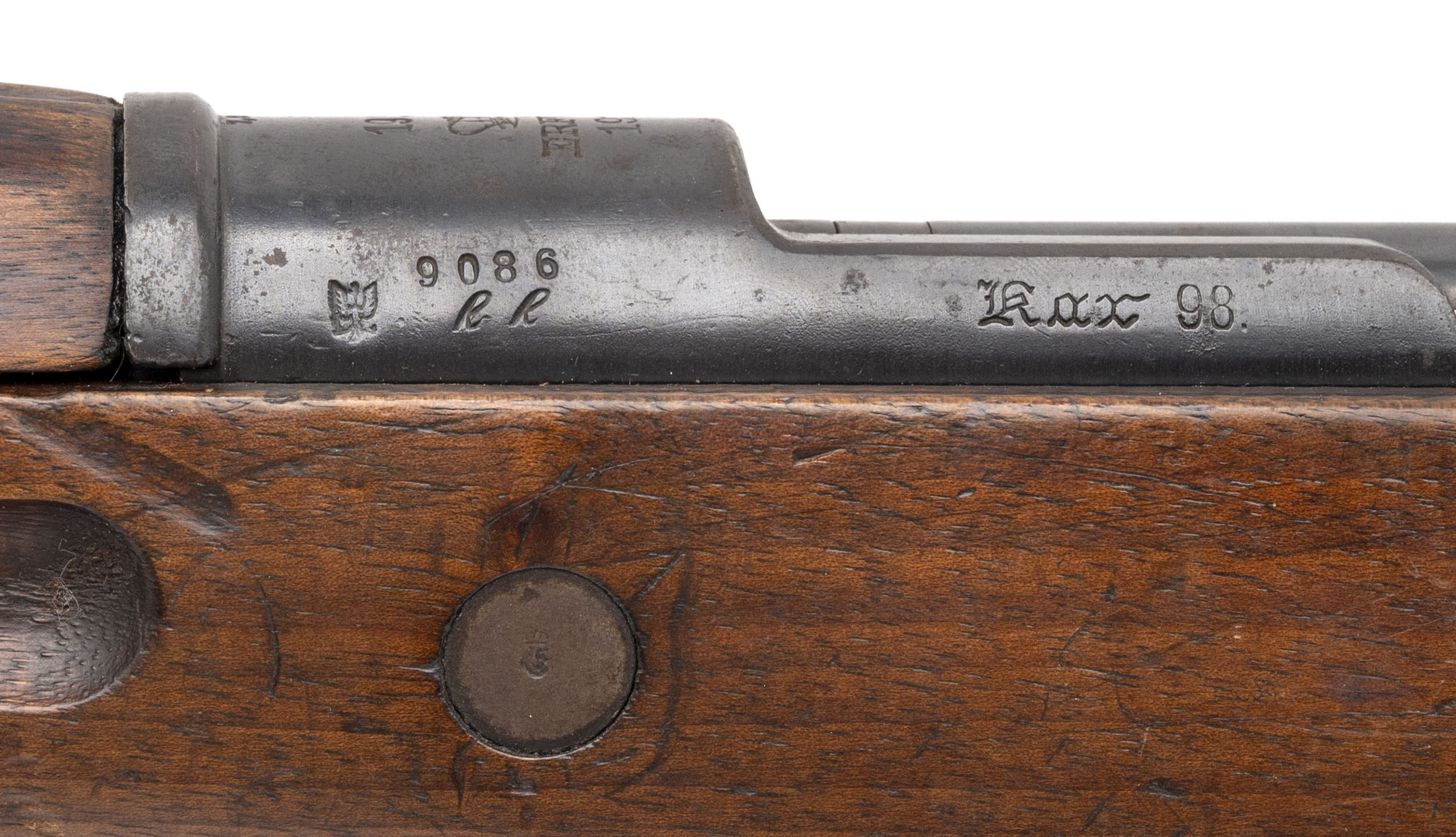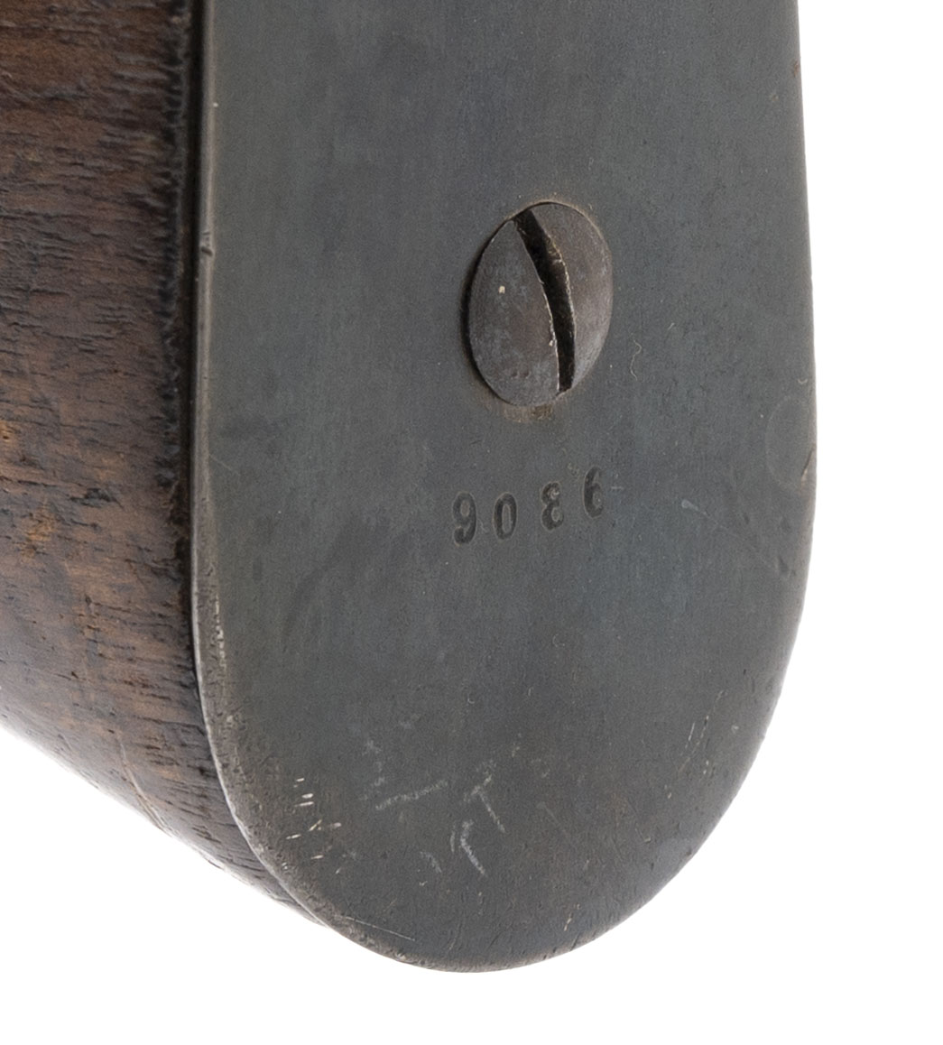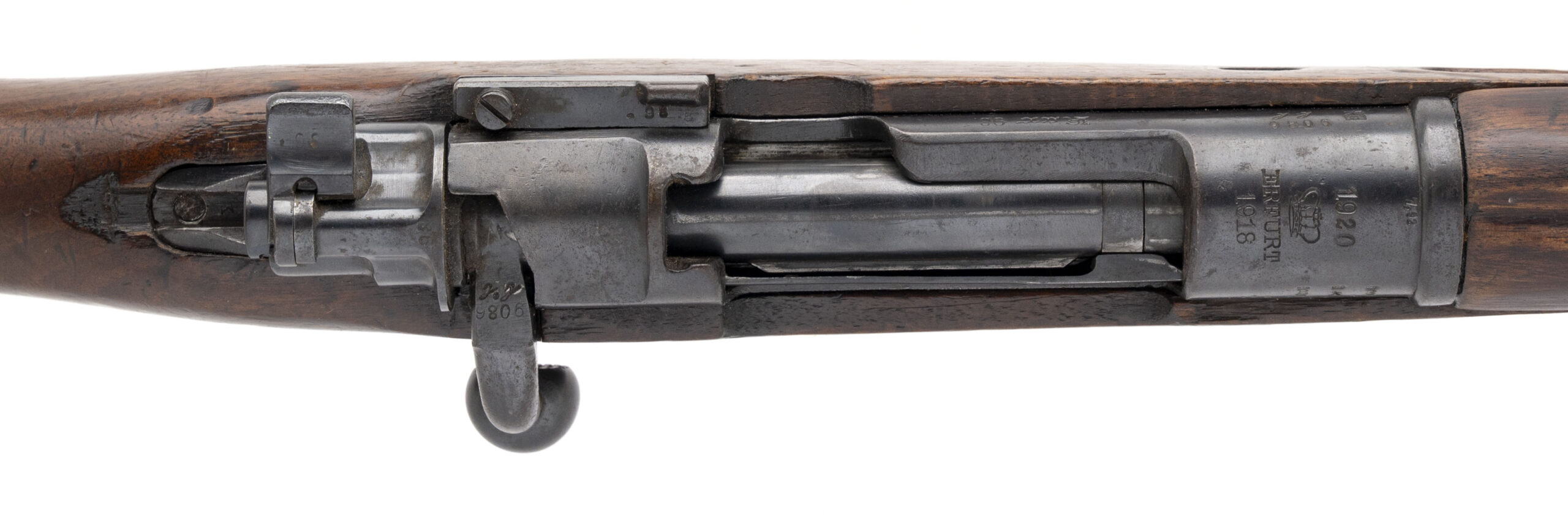 Serial No. 9086rr, manufactured in 1918 by the Royal Prussian Arsenal at Erfurt, chambered in 8mm Mauser with a 23.75-inch round barrel. This example represents a late-war production Karabiner 98aZ, one of the final carbines manufactured for Imperial German forces before the Armistice. The double-date receiver, marked “1918 / 1920,” indicates that the rifle remained in official German military service following World War I, as required under the Treaty of Versailles, which permitted a limited rearmed Reichswehr to retain designated small arms for police and military use. All serial numbers are matching throughout, including the screws. Metal finish retains a high percentage of the original factory blue, showing light wear and scattered brown patina from service use. Factory markings and Imperial proofs remain sharp and legible on the receiver and barrel shank. The walnut stock shows light handling and impression marks with well-defined cartouches visible along the wrist and butt. Action is smooth and functions correctly.