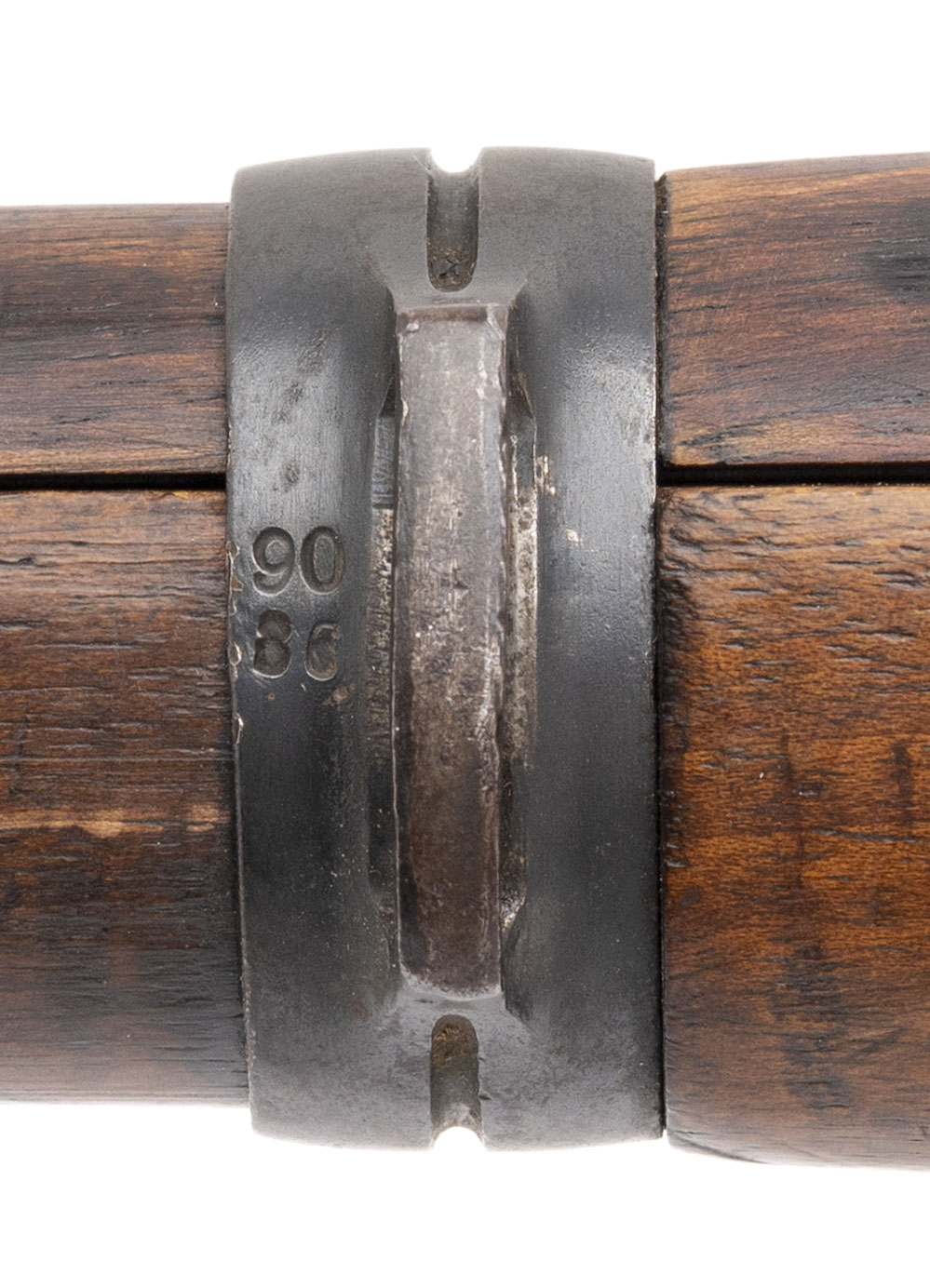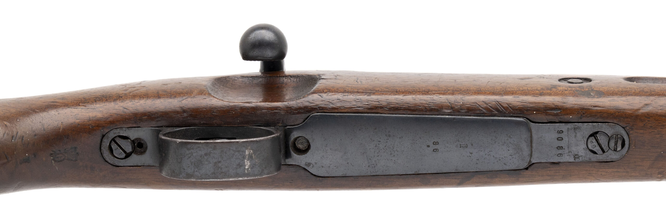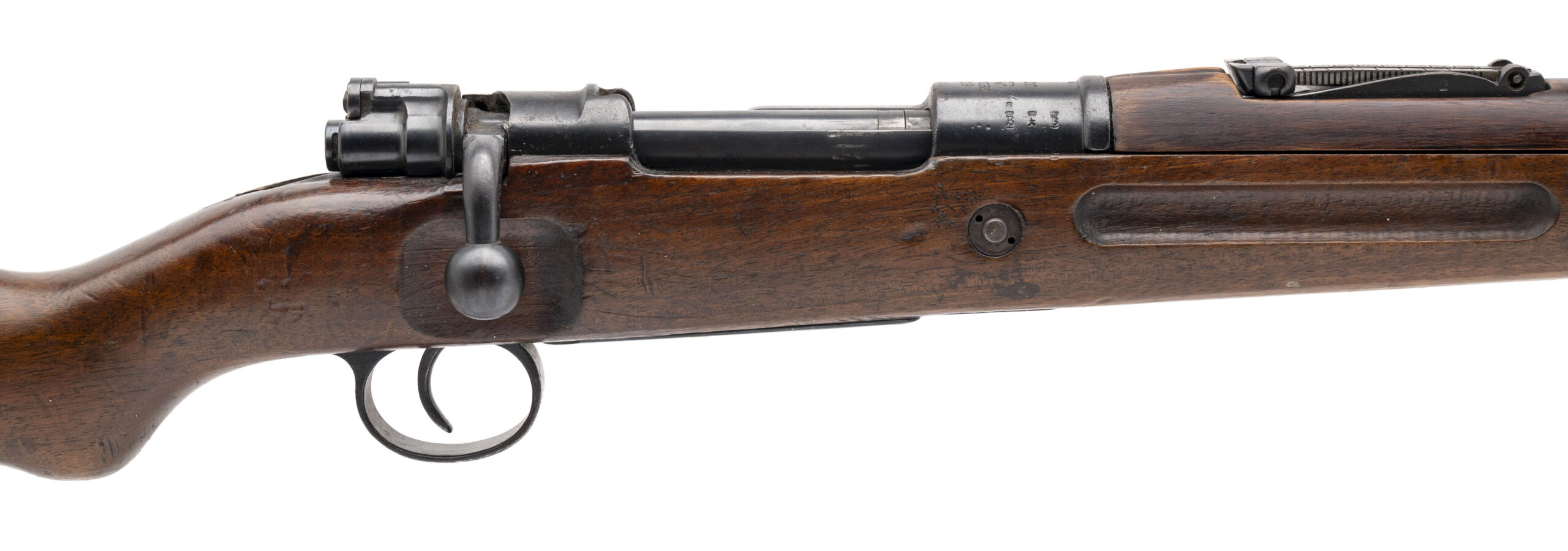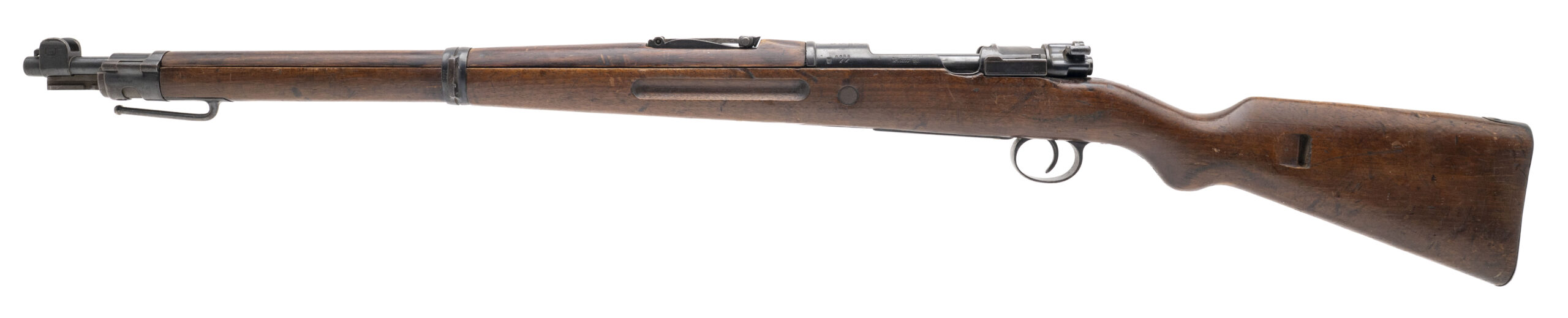 Serial No. 9086rr, manufactured in 1918 by the Royal Prussian Arsenal at Erfurt, chambered in 8mm Mauser with a 23.75-inch round barrel. This example represents a late-war production Karabiner 98aZ, one of the final carbines manufactured for Imperial German forces before the Armistice. The double-date receiver, marked “1918 / 1920,” indicates that the rifle remained in official German military service following World War I, as required under the Treaty of Versailles, which permitted a limited rearmed Reichswehr to retain designated small arms for police and military use. All serial numbers are matching throughout, including the screws. Metal finish retains a high percentage of the original factory blue, showing light wear and scattered brown patina from service use. Factory markings and Imperial proofs remain sharp and legible on the receiver and barrel shank. The walnut stock shows light handling and impression marks with well-defined cartouches visible along the wrist and butt. Action is smooth and functions correctly.