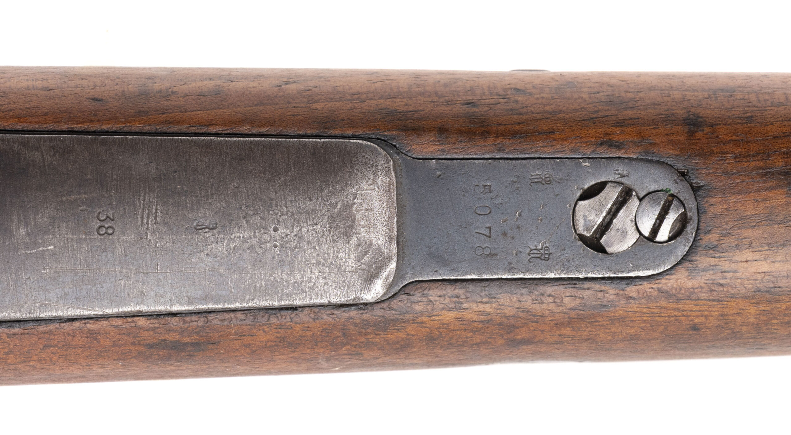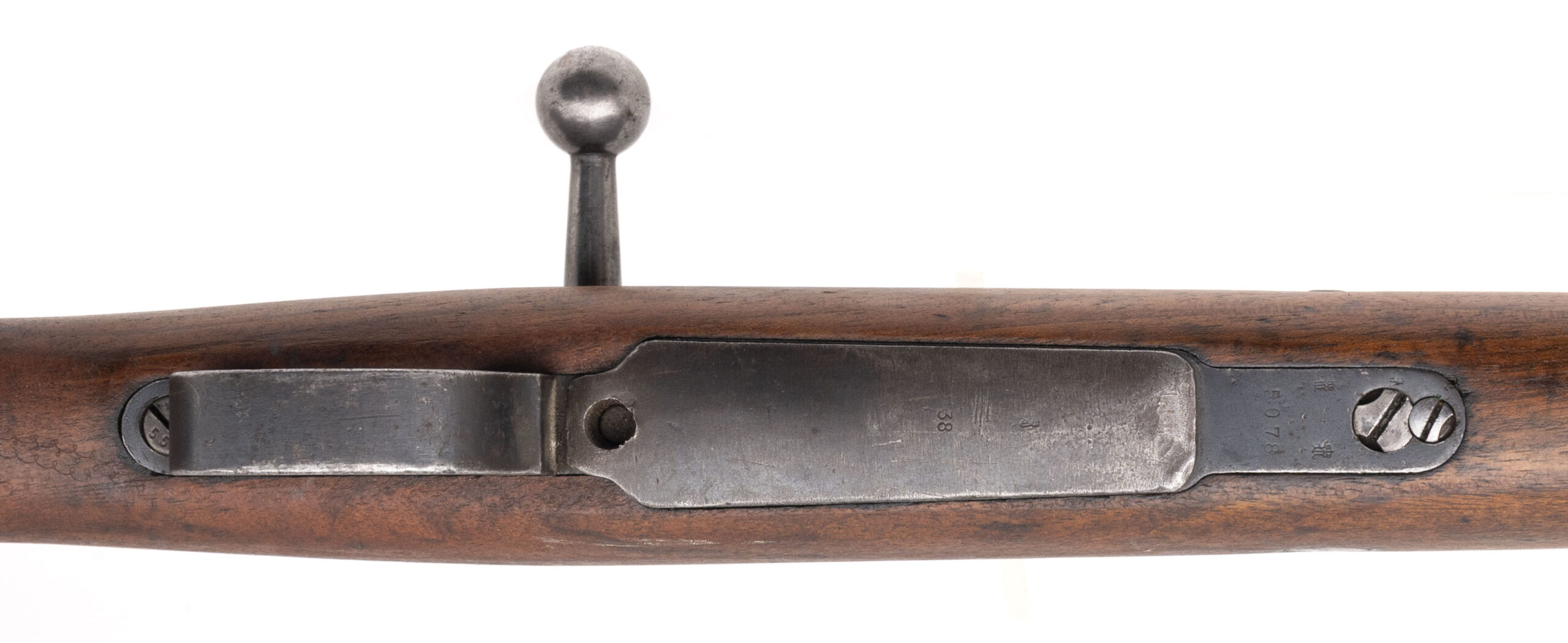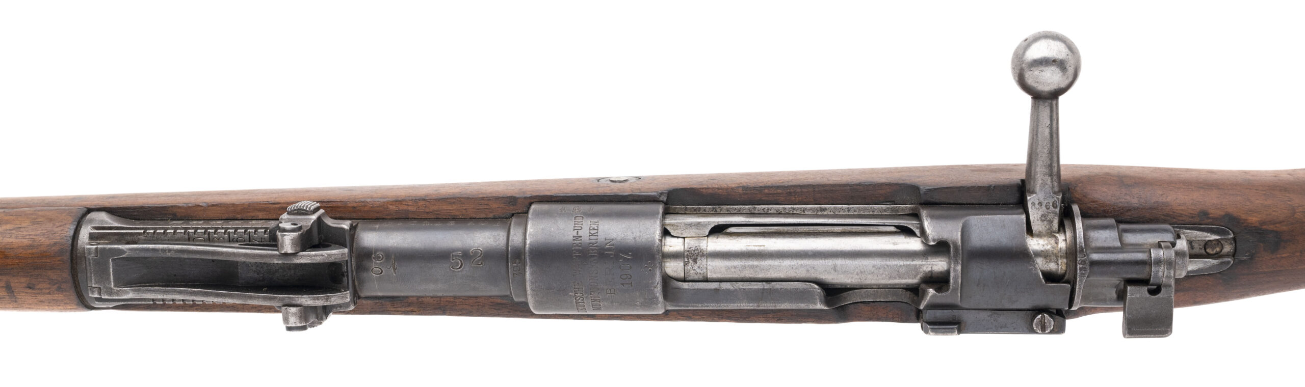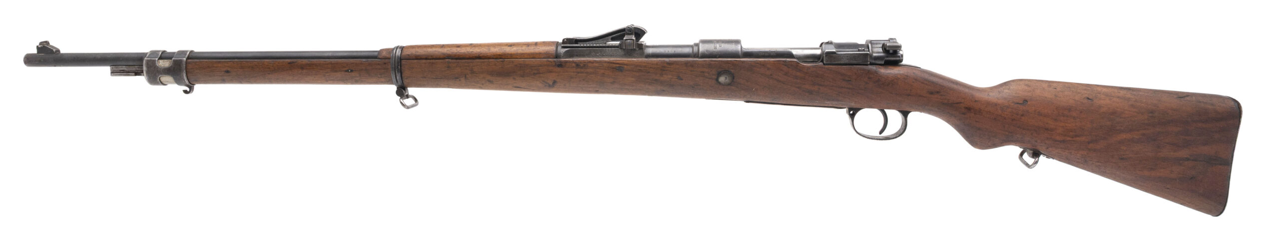 Serial number 3945. Made by Deutsche Waffen-und Munitionsfabriken ("DWM") in 1907 with a 29-inch barrel that has strong visible rifling. Although this is a mismatched Mauser Gew98, it is nevertheless in very good condition with thinning original factory blued finish across the metal parts & wood furniture that exhibits only minor handling wear. The right side of the receiver is marked "FOX STUDIO" & the stock is similarly marked as well indicating that the rifle was acquired by the studio's armory during the interwar years. Equipped with the famous lange vizier "roller coaster" adjustable rear sight assembly. An excellent example of the rifle that fought for the Kaiser's army during the Great World War & then served on in the motion picture industry.