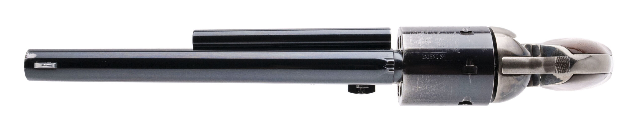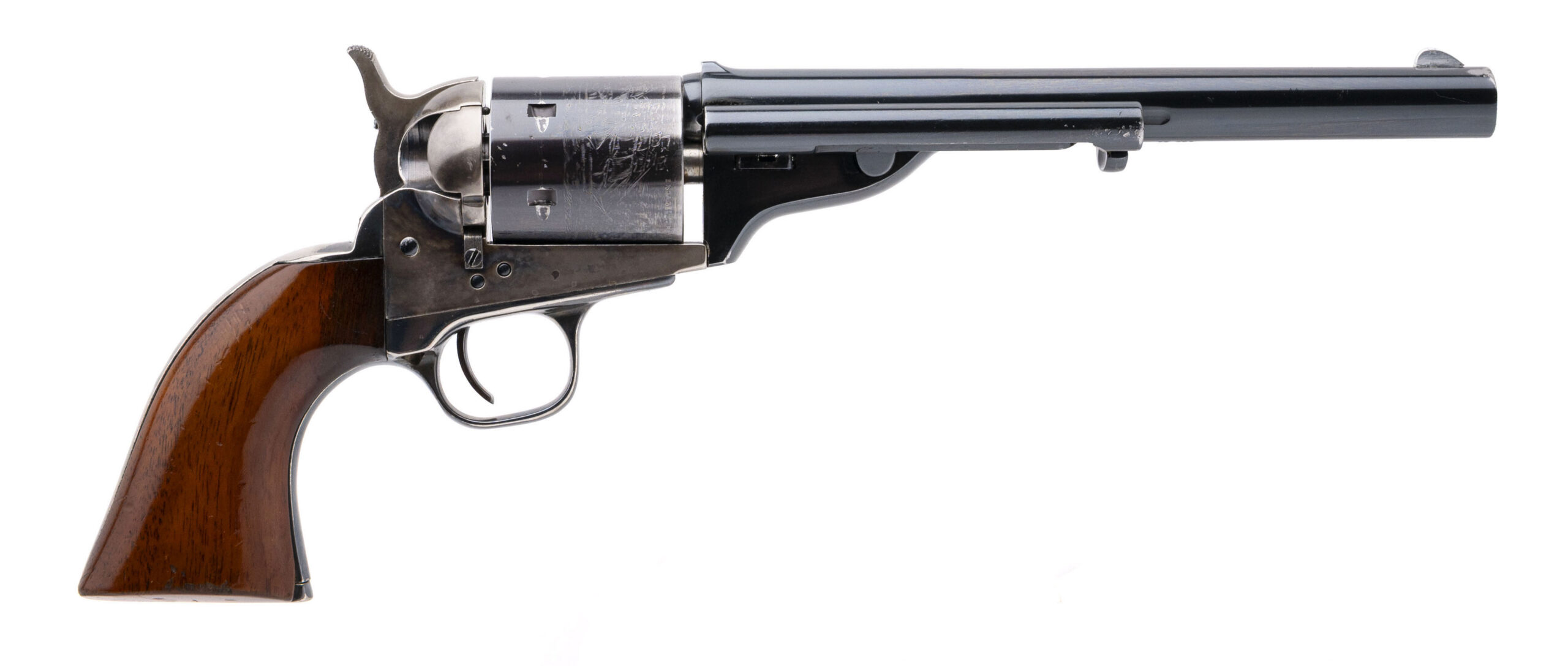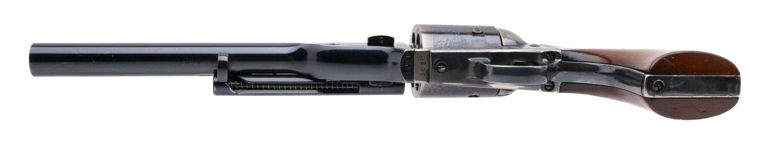 SN: 3021. 1990s vintage, .38 SPL. with a 7.5" barrel. Bore is excellent. Italian made modern reproduction single-action only revolver imported by E.M.F. Company Inc. with a bladed front sight, 6rd cylinder, color-case hardened alloy frame, blue finish, and wood grips. Finish shows minor wear with most of the bluing present. Very good condition overall.