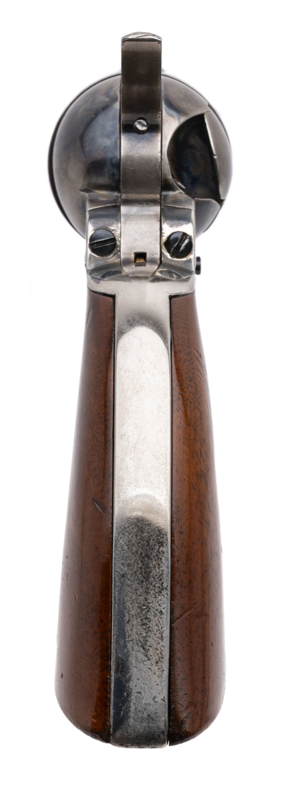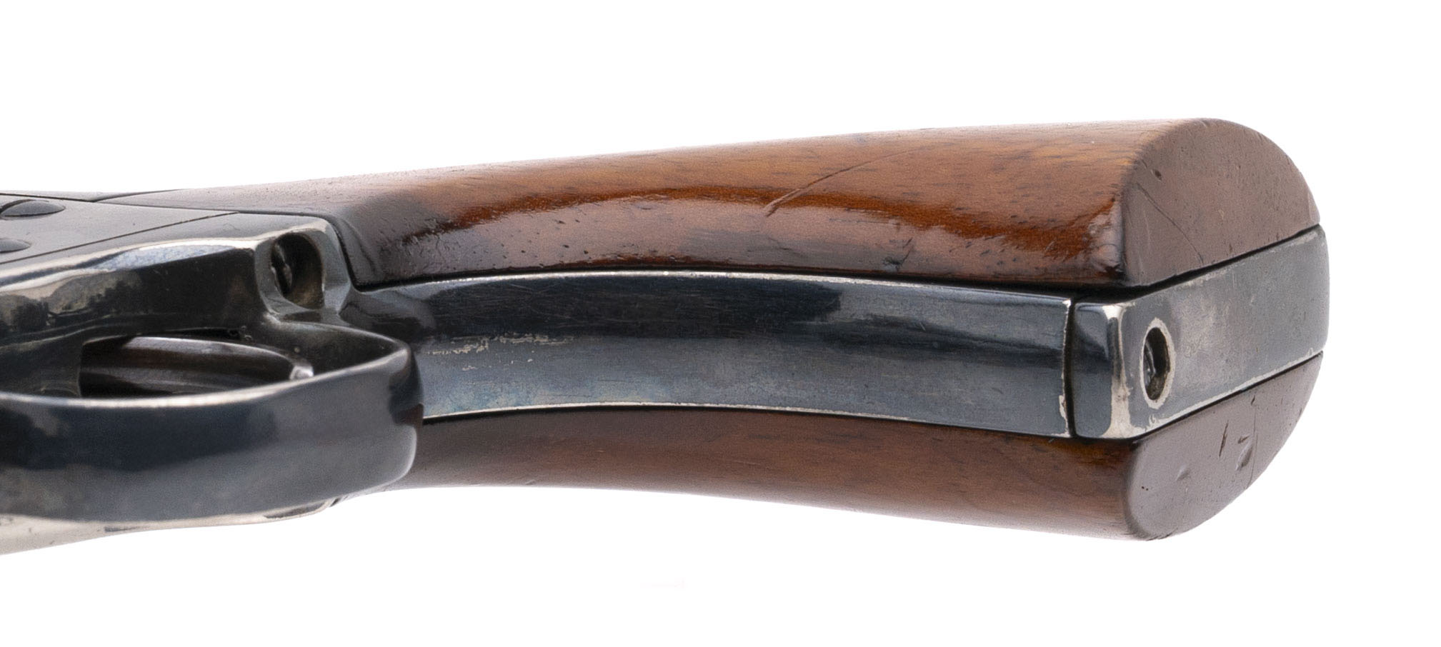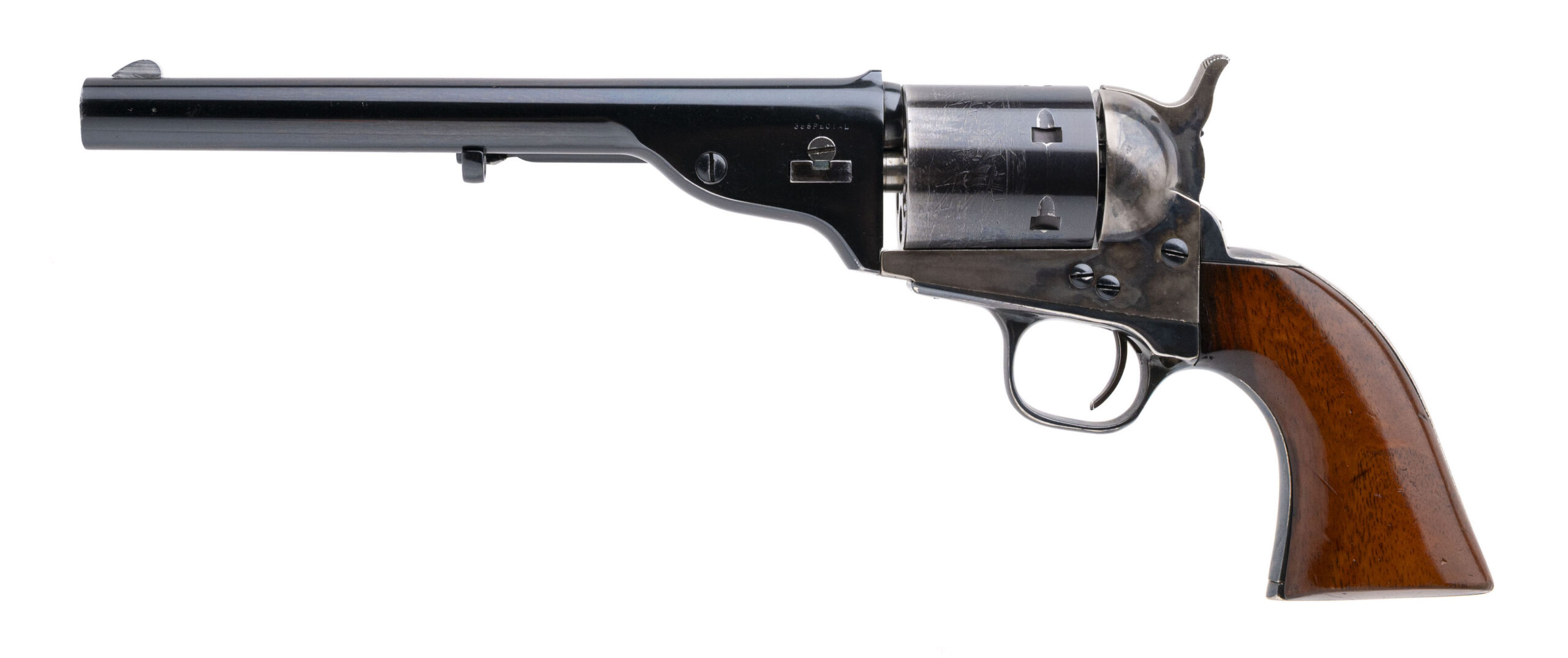 SN: 3021. 1990s vintage, .38 SPL. with a 7.5" barrel. Bore is excellent. Italian made modern reproduction single-action only revolver imported by E.M.F. Company Inc. with a bladed front sight, 6rd cylinder, color-case hardened alloy frame, blue finish, and wood grips. Finish shows minor wear with most of the bluing present. Very good condition overall.