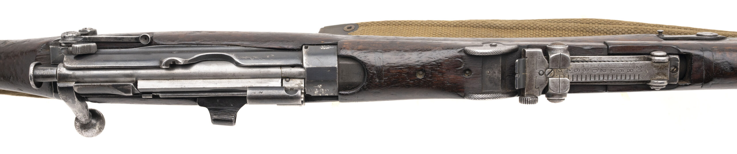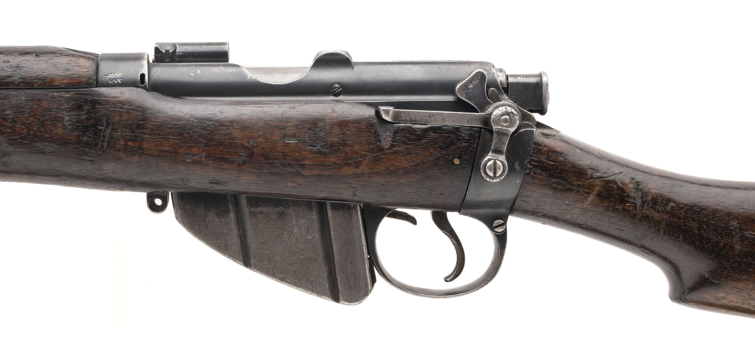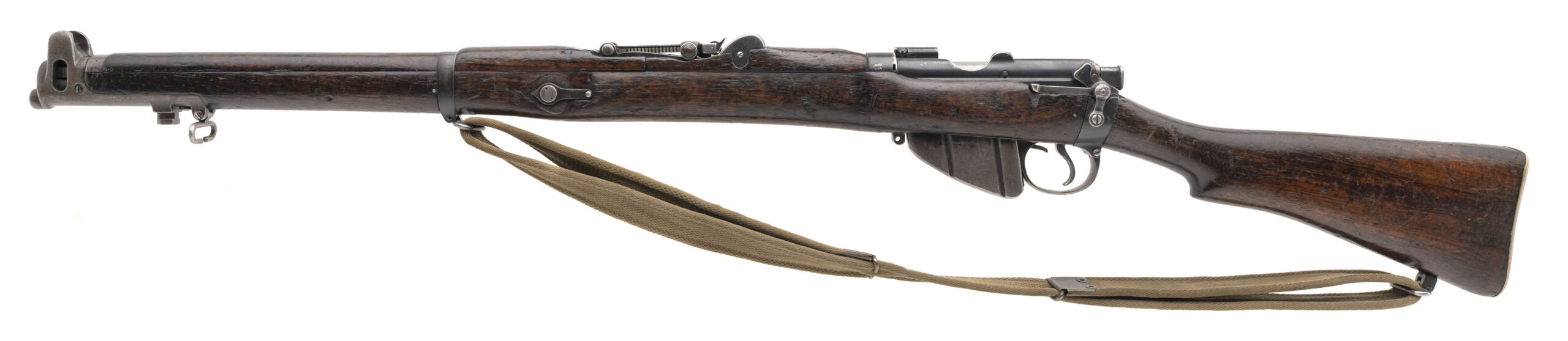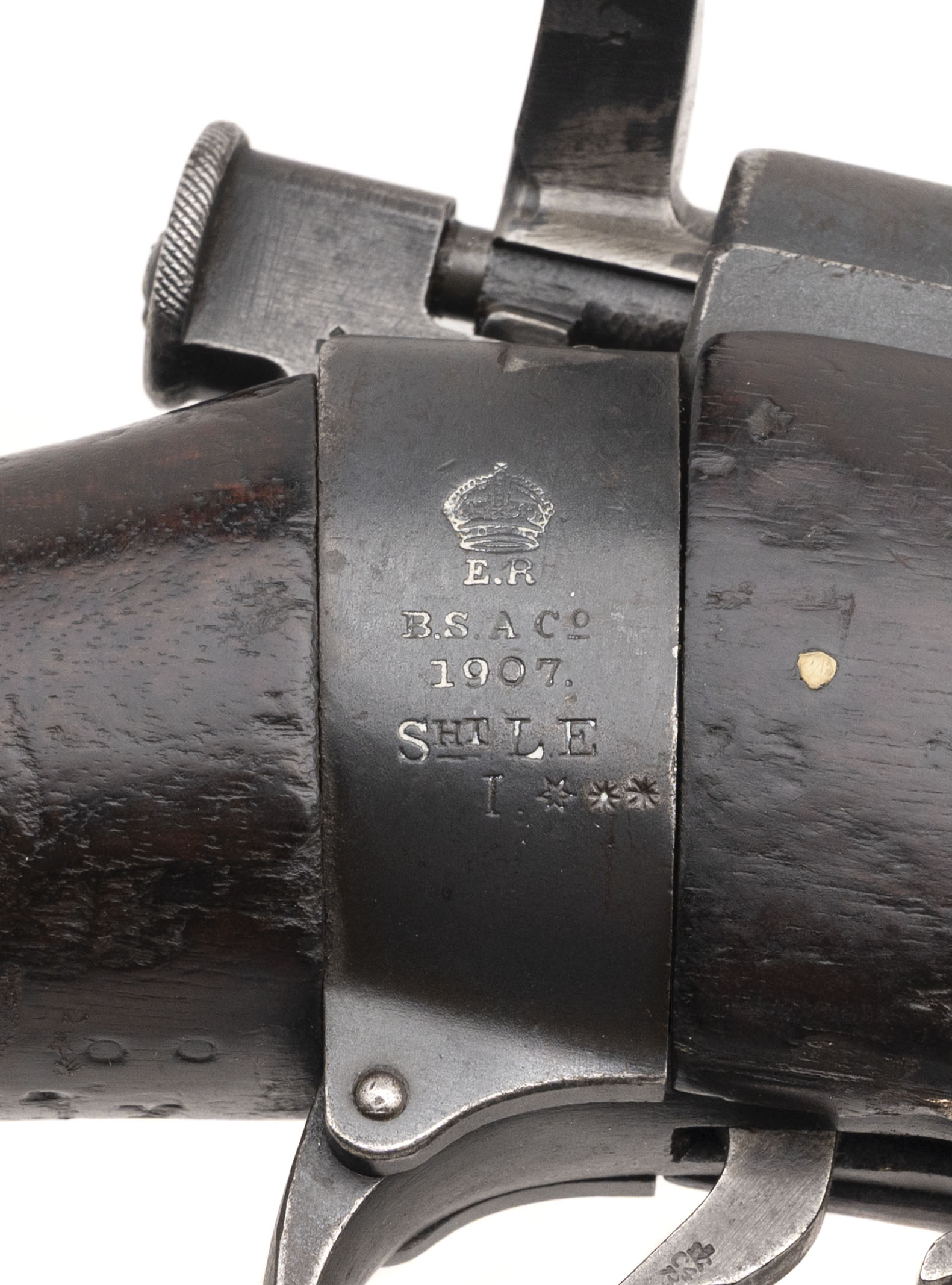 Serial No. ER3140, manufactured in 1907 by B.S.A. Co., chambered in .303 British with a 25" round barrel. The bore is bright with strong, well-defined rifling. Serial numbers are matching throughout, and the magazine is unmarked. This early example retains desirable original features, including the magazine cut-off and volley sights, reflecting its pre-WWI configuration. The stock is in very good condition with expected handling impressions, and the stock disk is marked “HSD / R-E / 4574.” Overall presentation is clean and well preserved for an early Short Magazine Lee-Enfield. Action is smooth and functions correctly.
