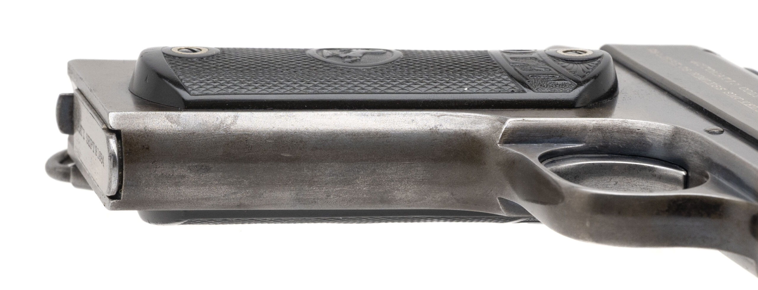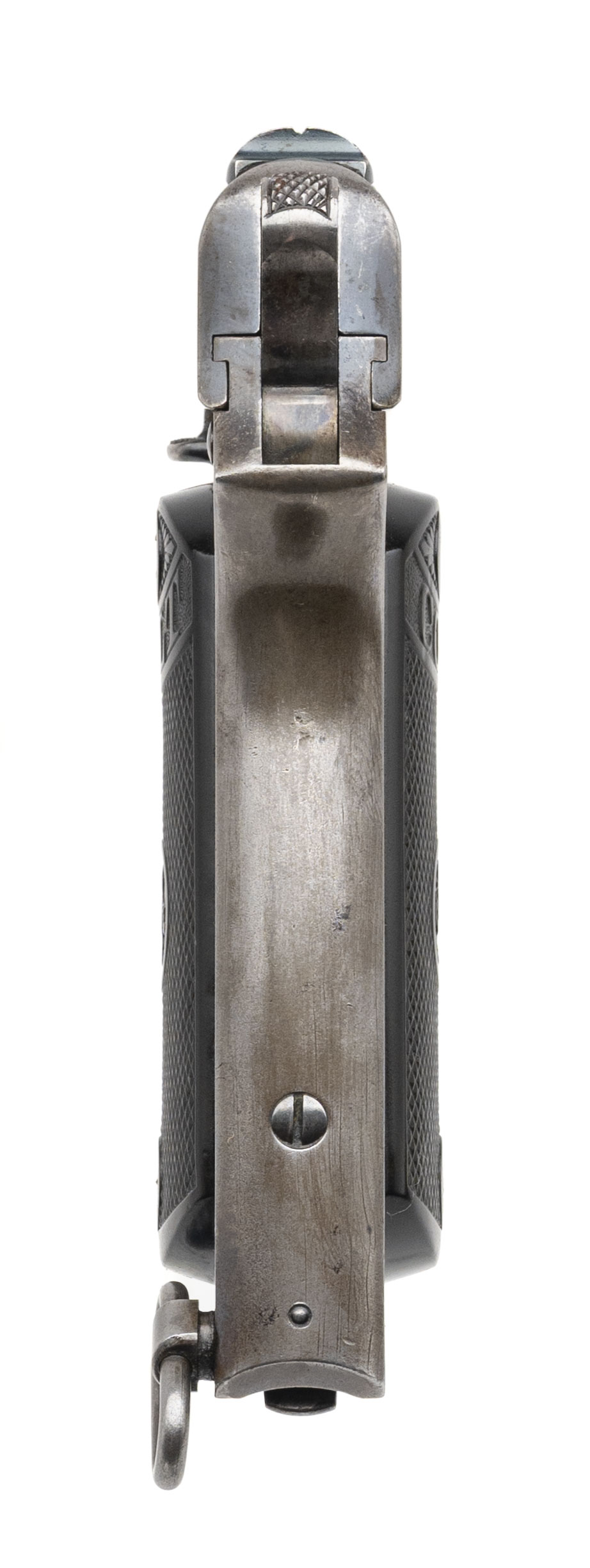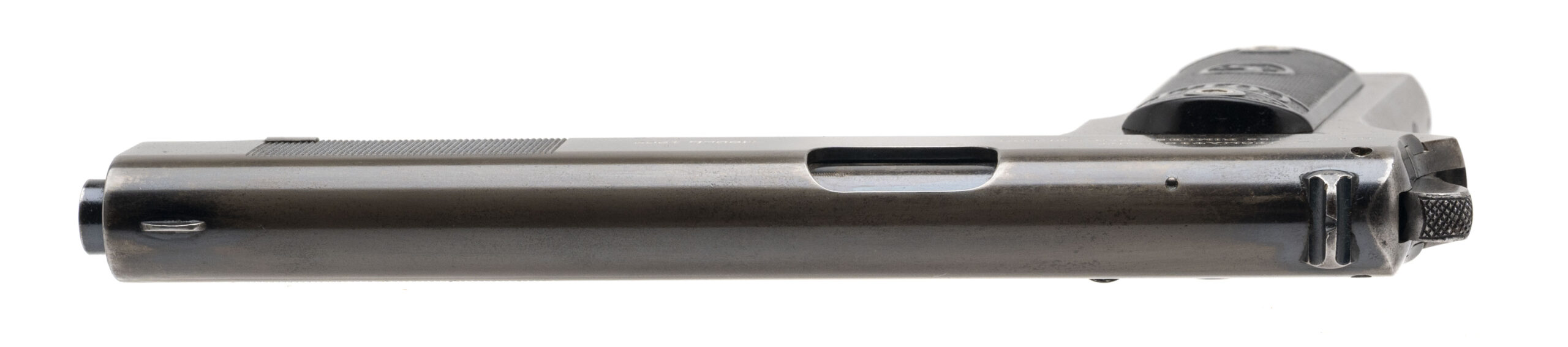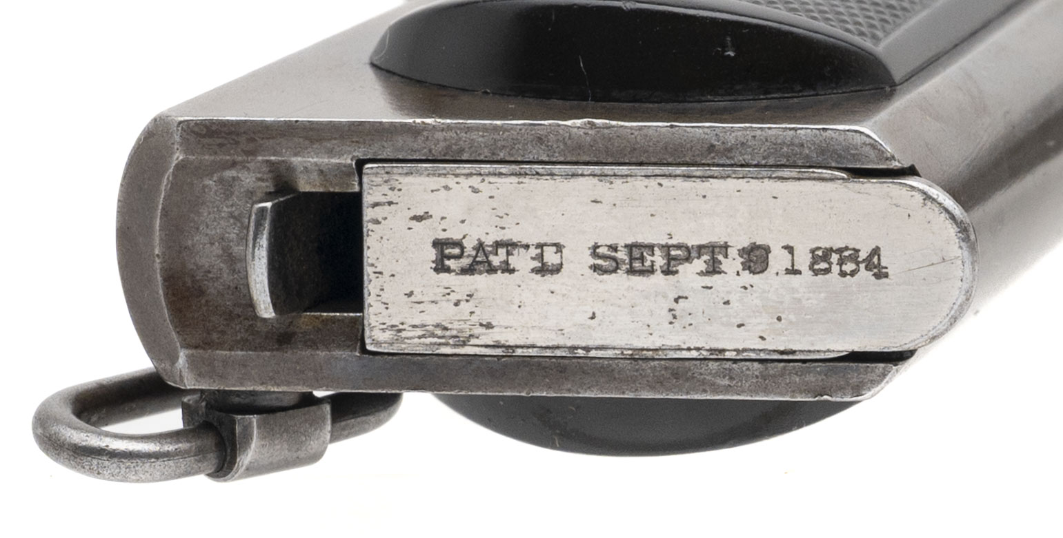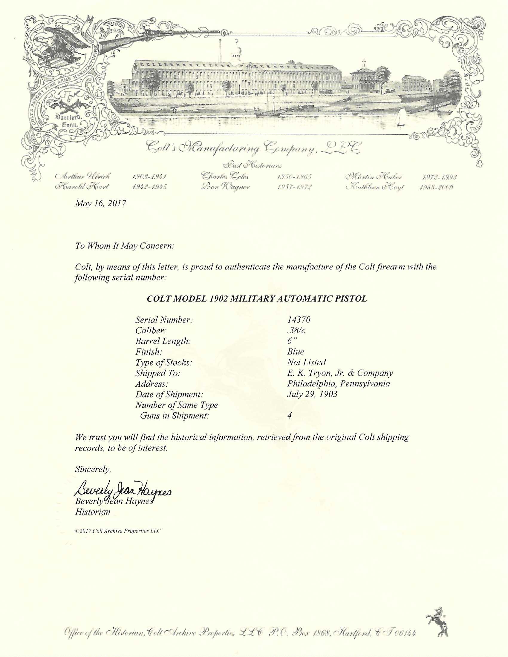 Serial number 14370. Made in 1903. 38 ACP caliber with a 6” barrel. This is an early Model with the checkered slide. This gun has `30% of the original blue mixed worth a dark gray to brown patina. This gun has good clear markings. The grips are excellent. Accompanying this gun is a factory letter confirming all features. It was shipped to E. K. Tryon & Company in Philadelphia.