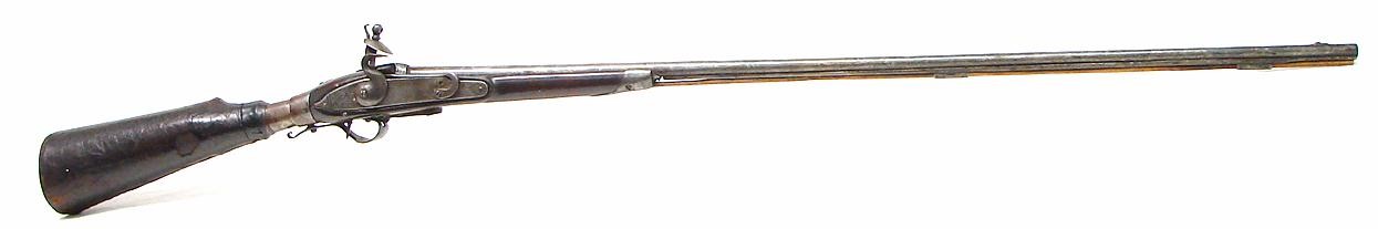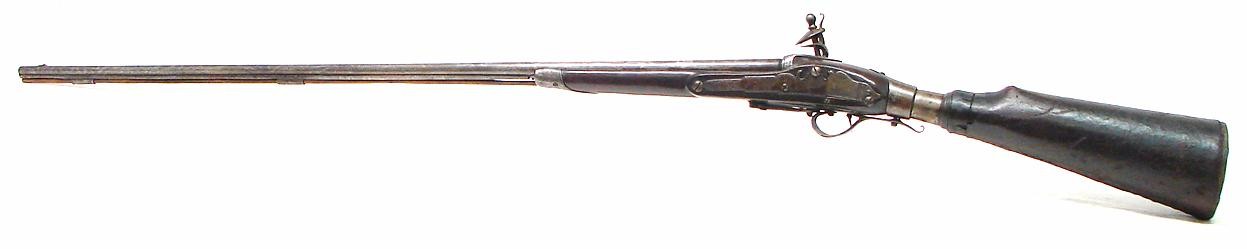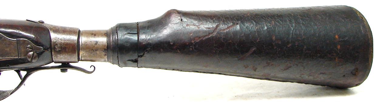 Early English Air Rifle. Circa about 1750. This is a unique piece that one does not encounter often. The air tank is the butt stock of the gun and it is covered in original leather. The barrel is 39" long and approximately 45 caliber. One unusual feature on this gun is the flintlock type hammer. Most hammers on air guns bear no resemblance to a normal gun. Well made gun and the name "Bell" is marked in the lock plate. Very neat unique piece.