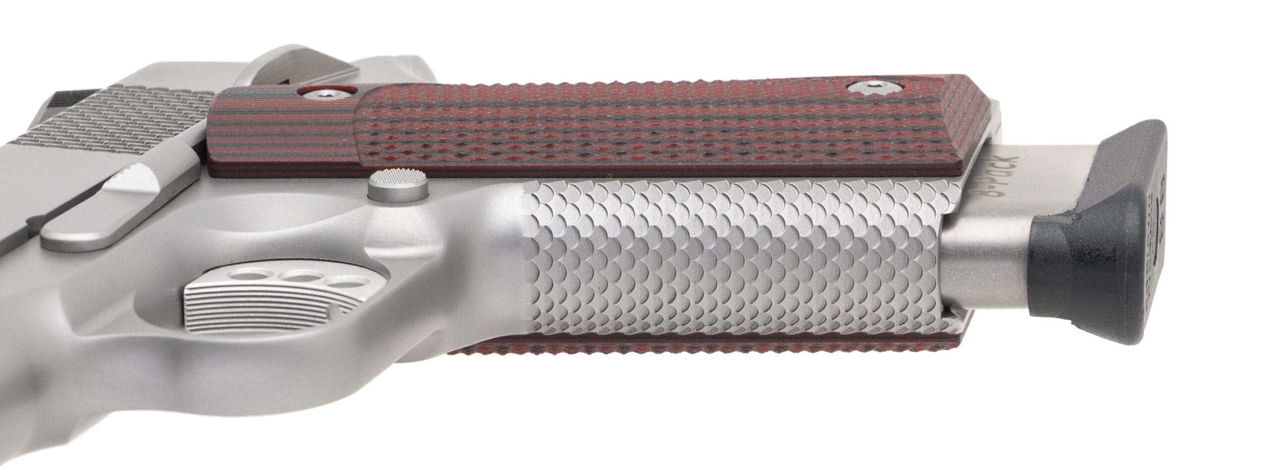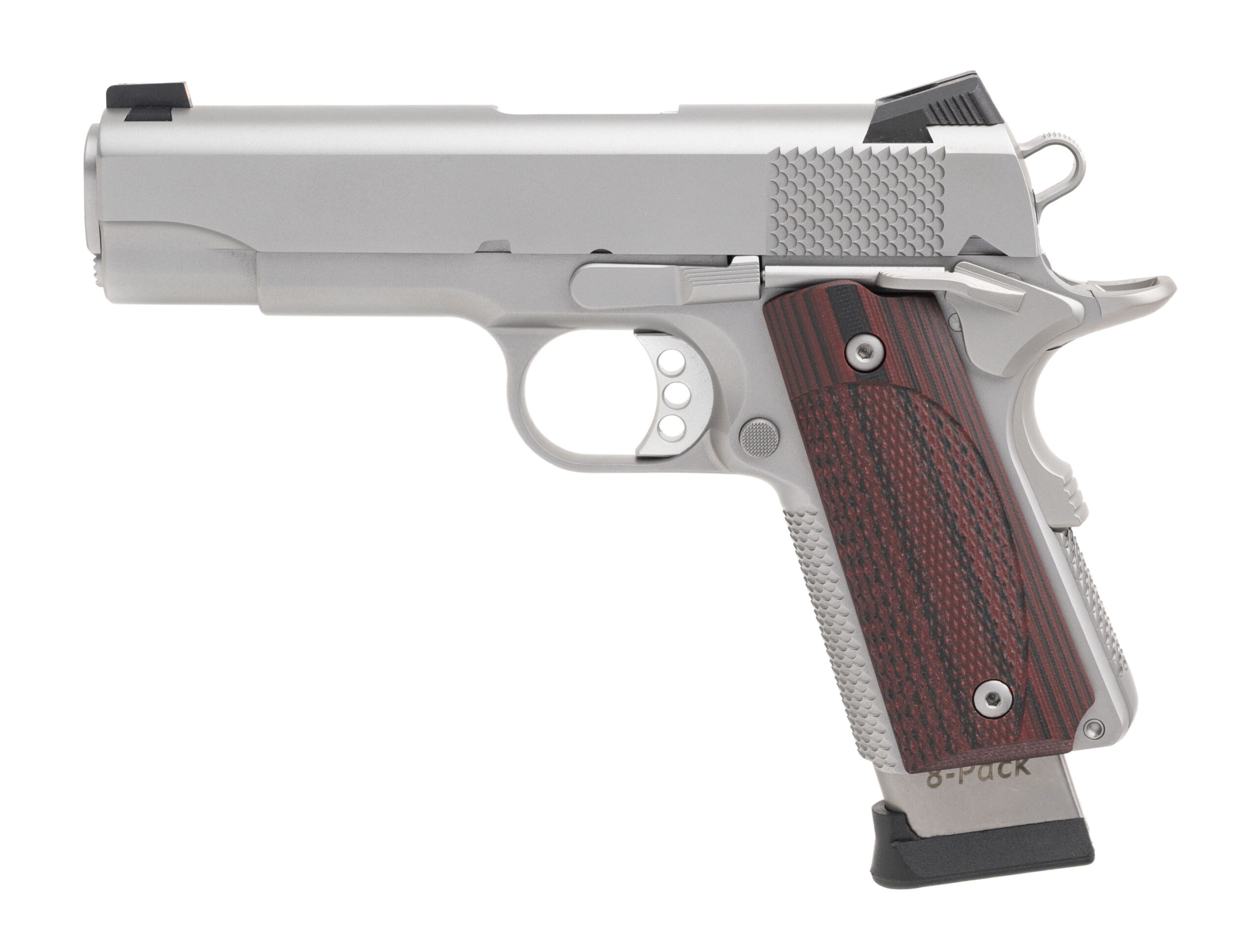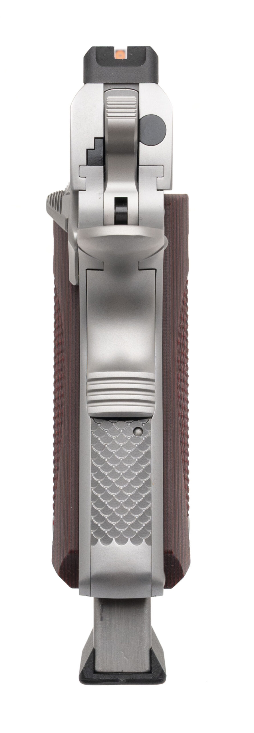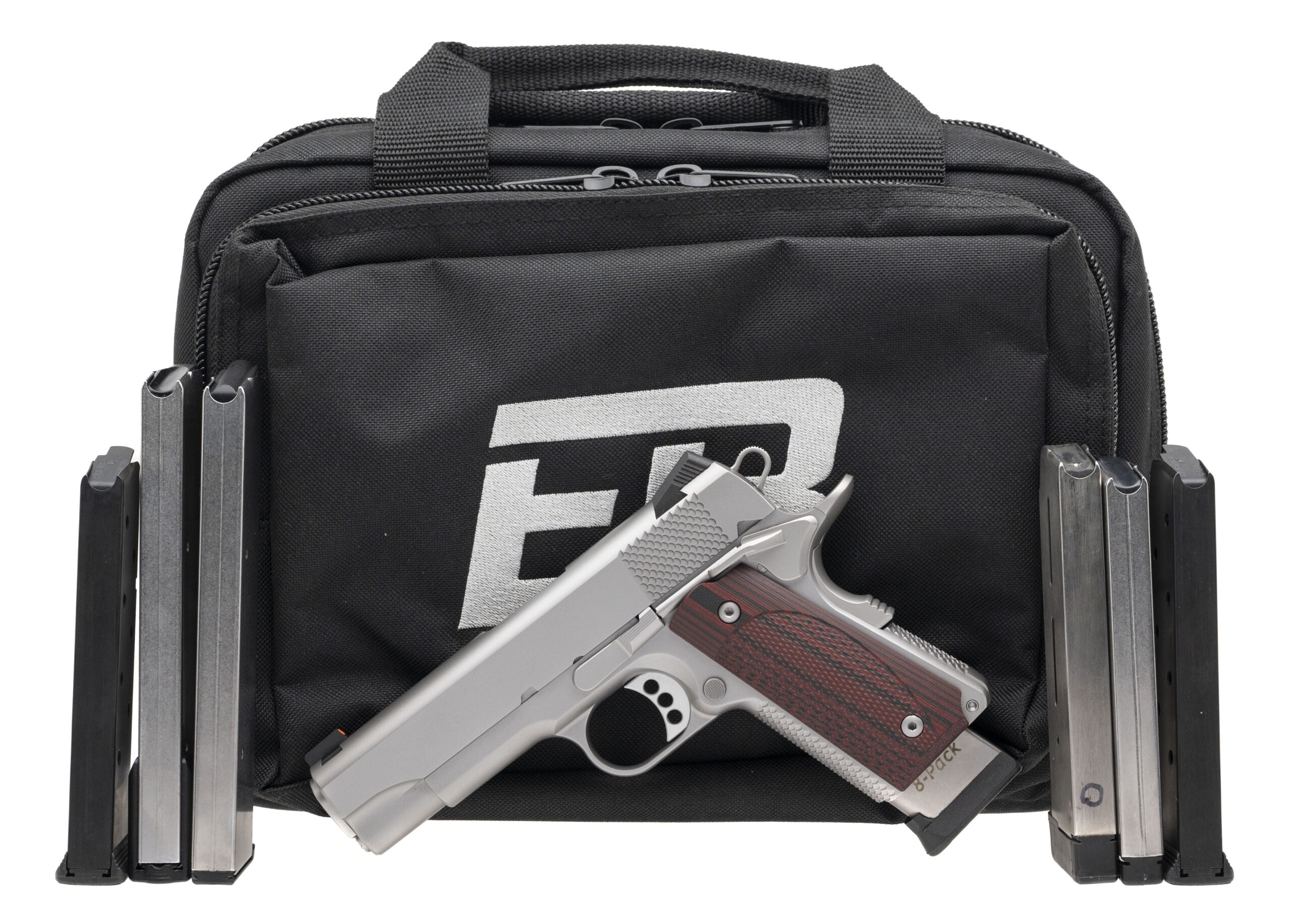 SN: 29505. modern production, .45 Auto with an 4.25" stainless steel crowned barrel. Custom stainless steel commander size 1911 style pistol with snakeskin serrations, ETC black cherry G10 grips, Trijicon tritium front sight, and non-bobtail frame. Like new condition with signature carry bag and 6 extra magazines.