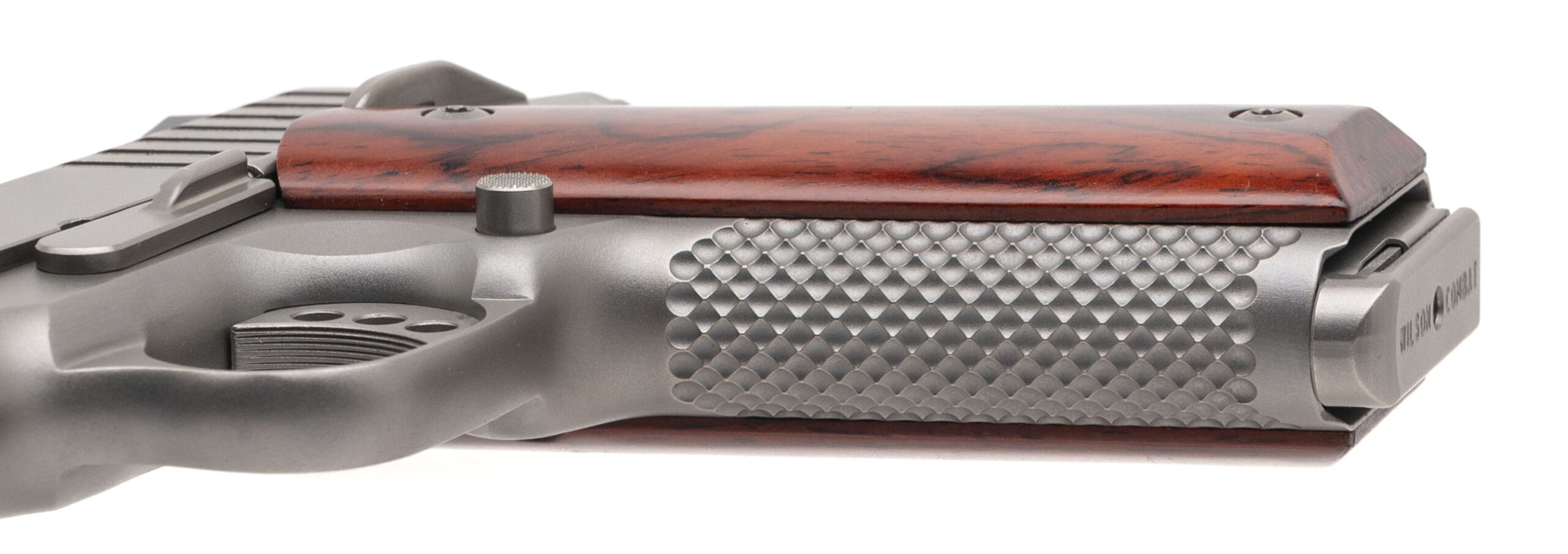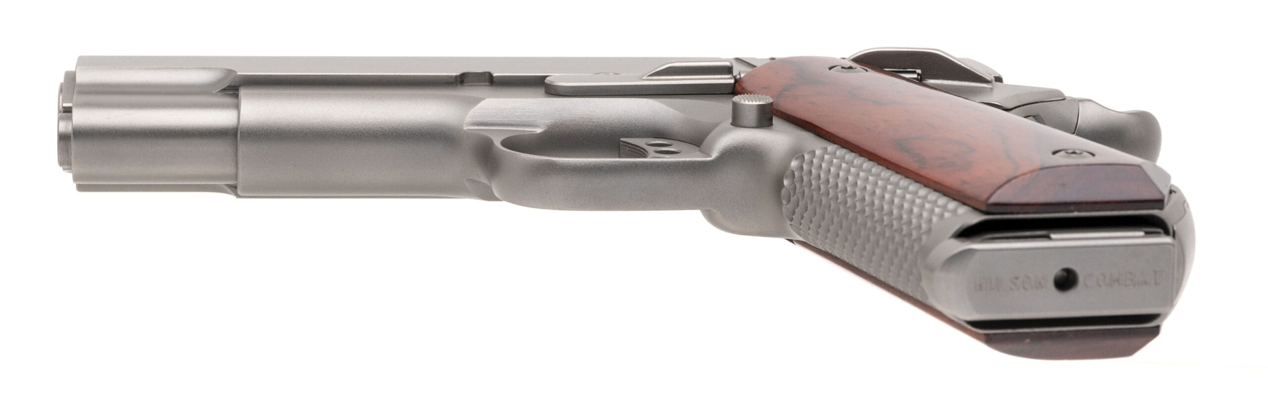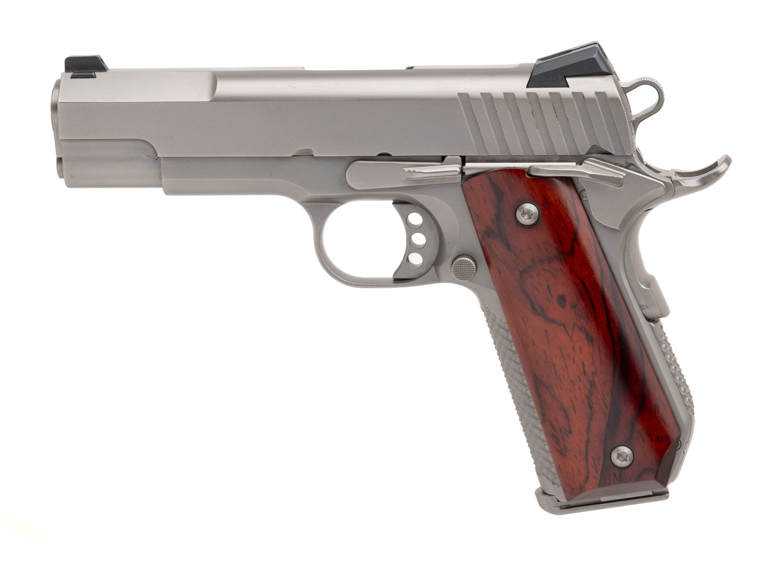 SN: CU04738E. Modern production, .38 Super with an 4.25" barrel. Custom Commander size 1911 with an STI slide, Trijicon night sights, and custom cocobolo grips by Esmeralda O'Sheehan. Custom work by Houston's renowned pistolsmith Eddie Jimenea. Custom features includes satin nickel finish, milled slide, Ed Brown style bobtail, custom stippling, perfectly fitted safety control, and trigger job with the smoothest action built on a Colt LW Commander frame. Like new condition.