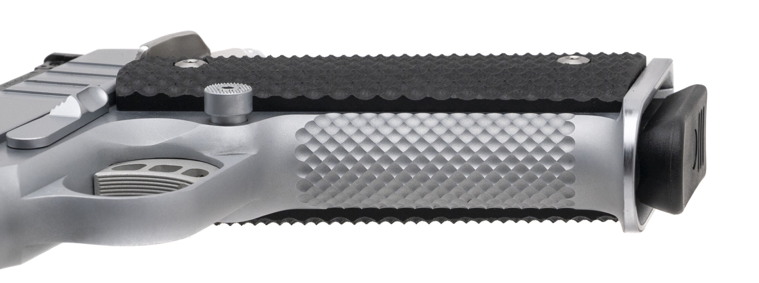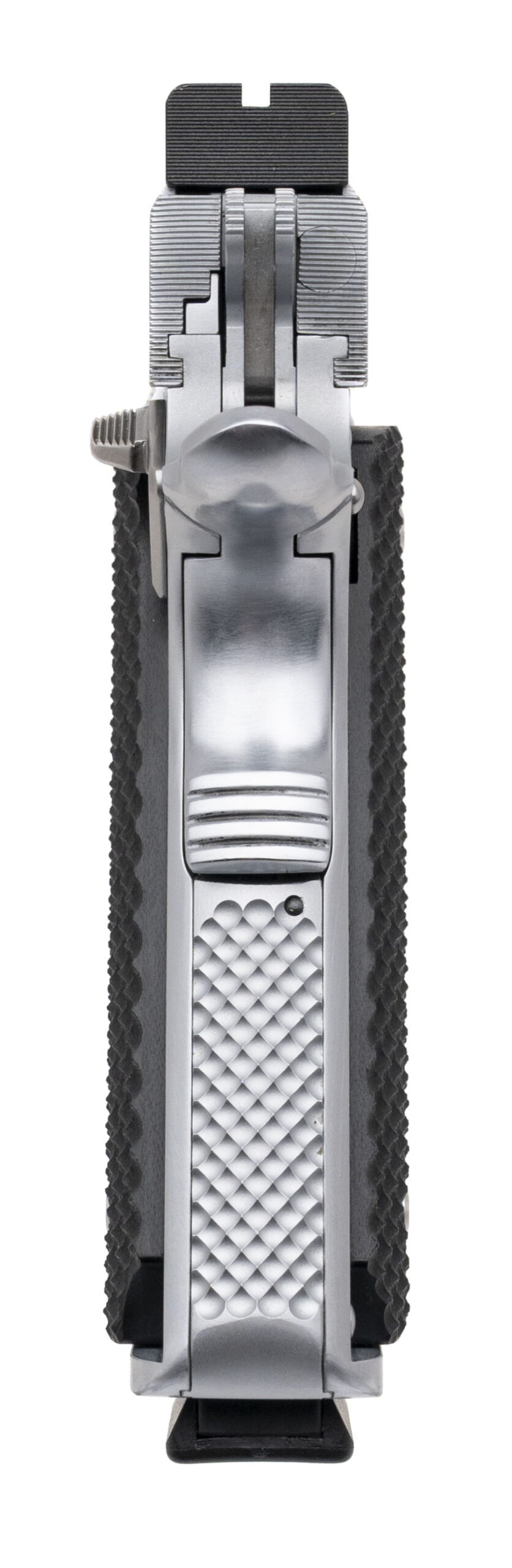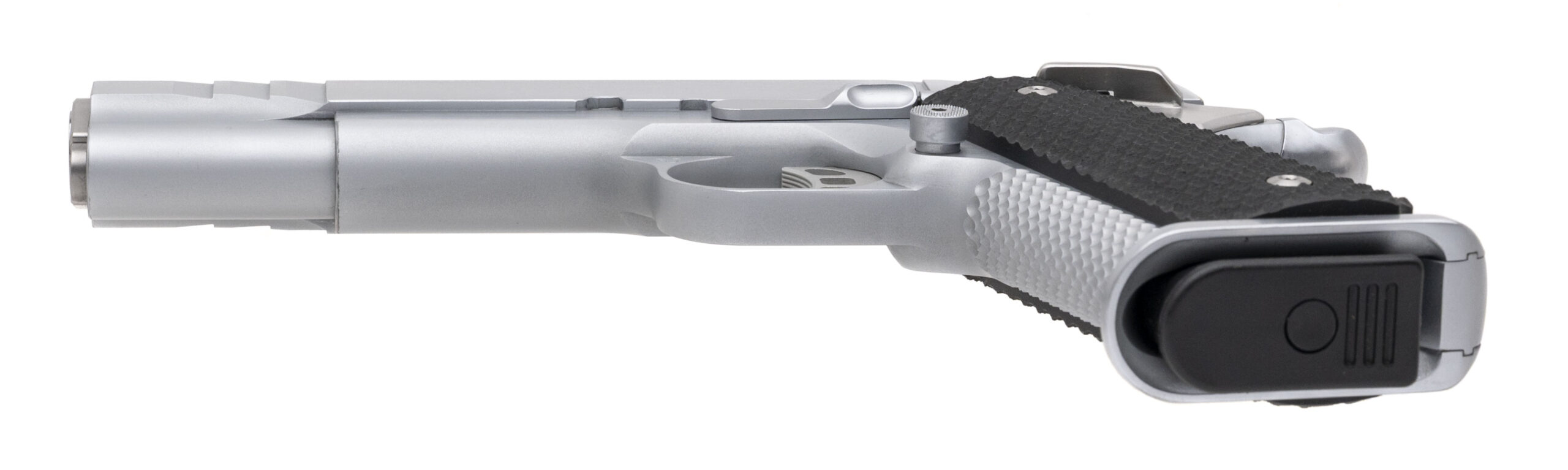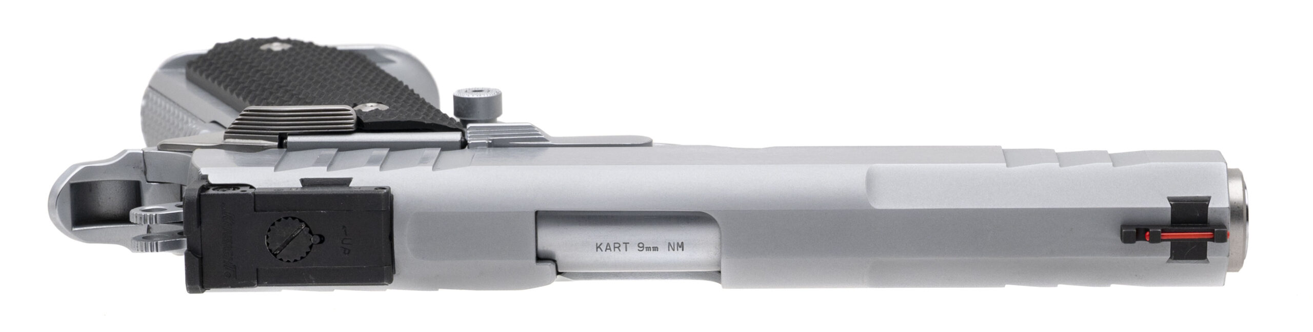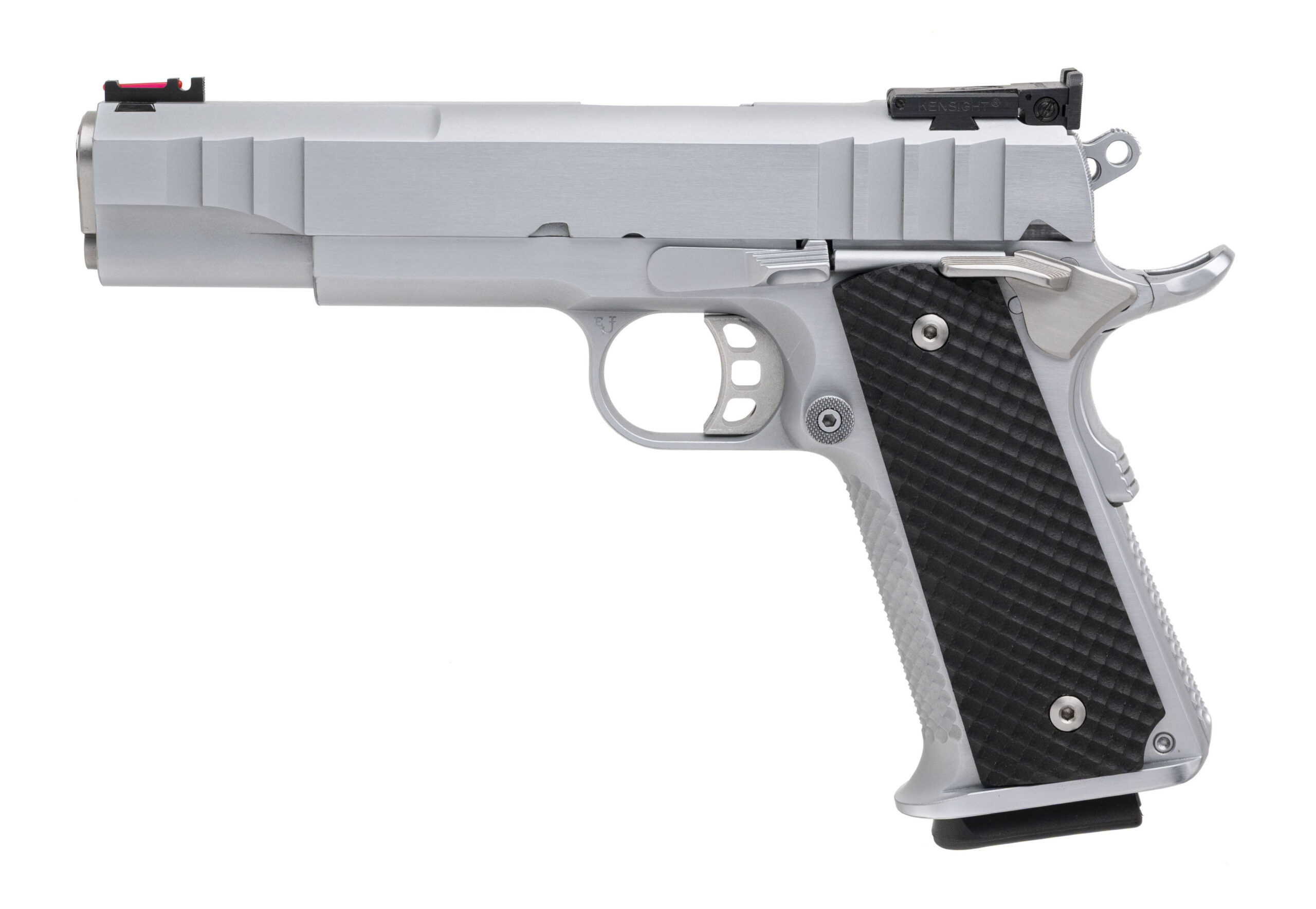 SN: LAW9. Modern production, 9mm with an 5" stainless steel Kart barrel. Custom stainless steel Government size 1911 pistol with Kensight target sights and VZ G10 grips. Custom work by Houston's renowned pistolsmith Eddie Jimenea. Custom features includes milled slide, flared integral magwell, custom stippling & serrations, perfectly fitted safety control, and trigger job with the smoothest action built on a Caspian frame. Like new condition.