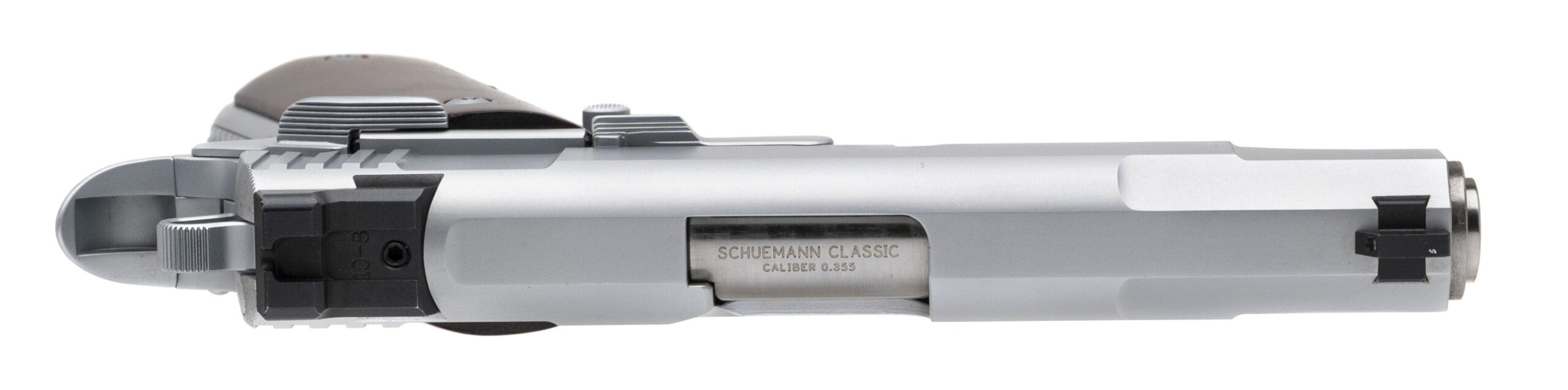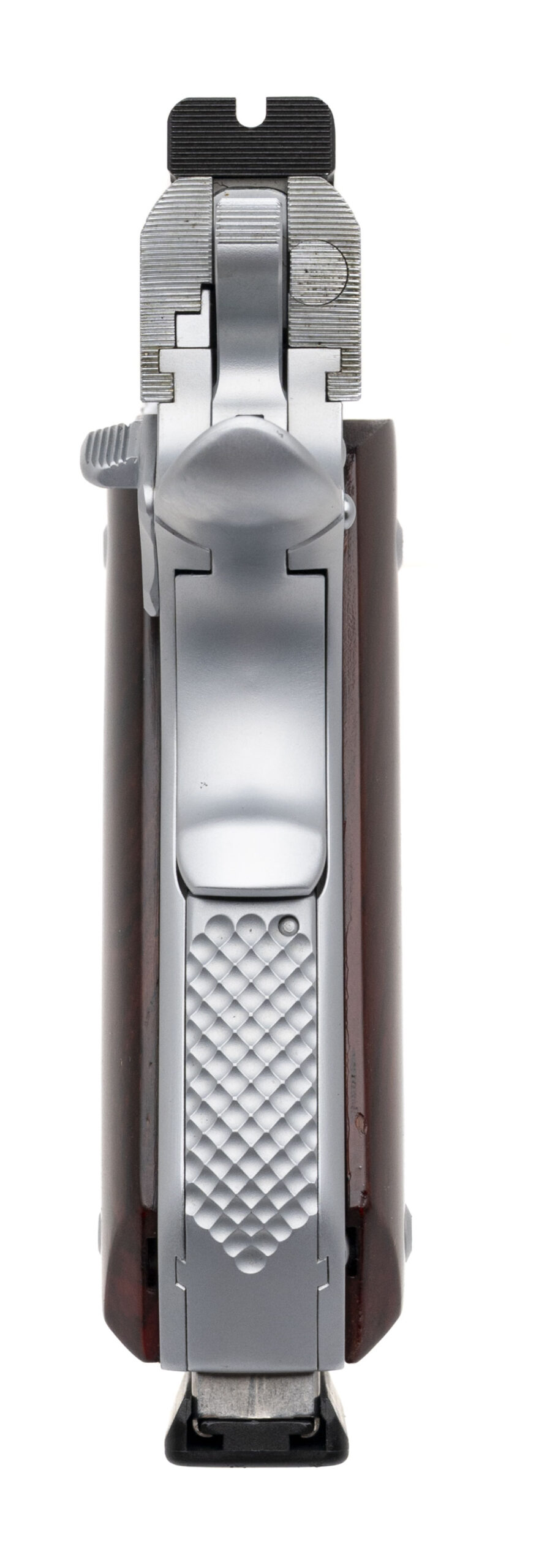 SN: TALON9. Modern production, 9mm with an 4.25" stainless steel Schuemann Classic barrel w/bushing. Custom stainless steel Commander size 1911 pistol with a Tritium front sight, and custom cocobolo grips by Esmeralda O'Sheehan. Custom work by Houston's renowned pistolsmith Eddie Jimenea. Custom features includes milled slide, Ed Brown style bobtail, custom stippling & serrations, perfectly fitted safety control, and trigger job with the smoothest action built on a Caspian frame. Like new condition.