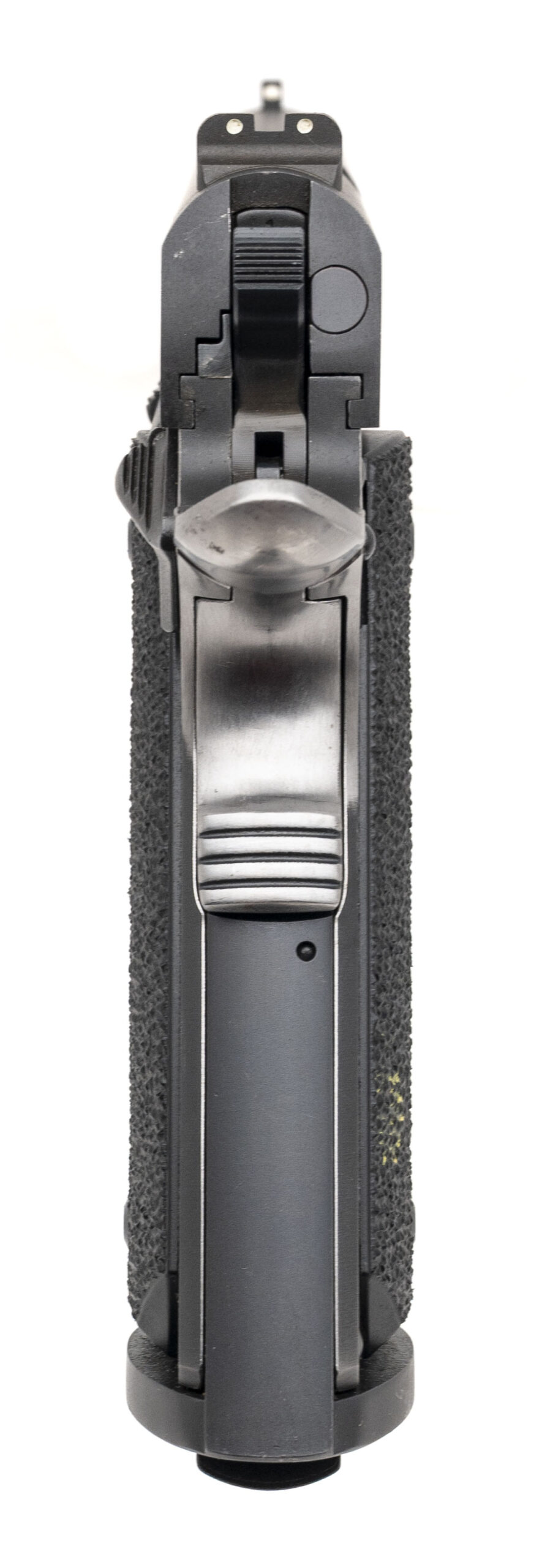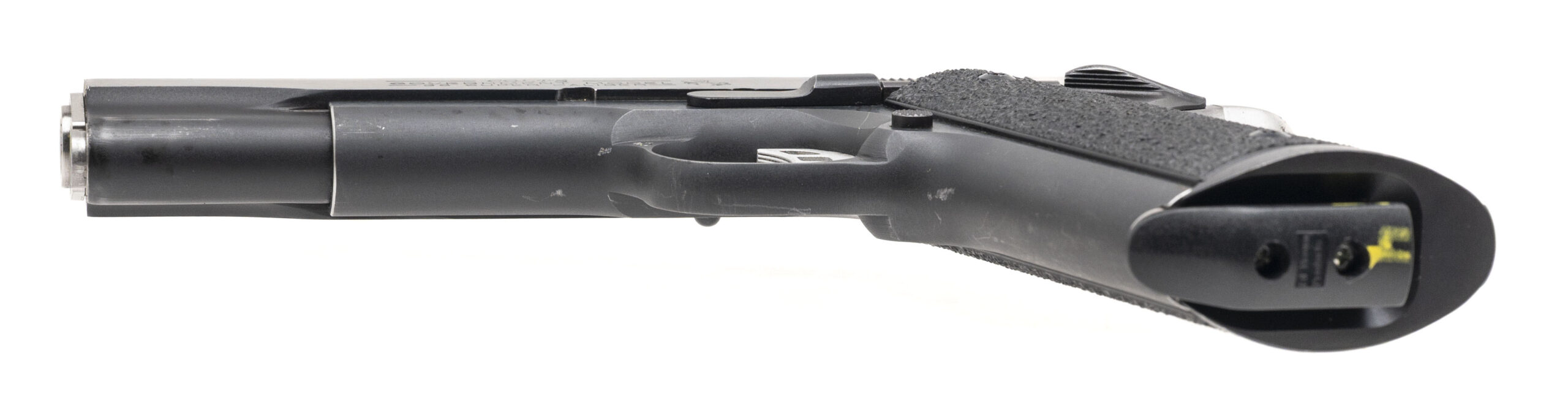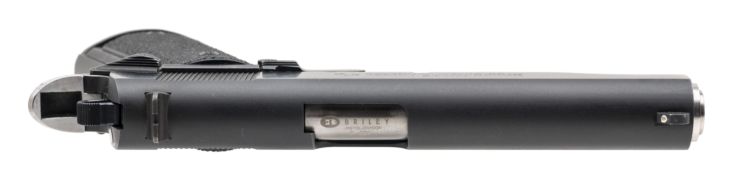 SN: 2825590. 2009 production, 9mm with a 5" stainless steel Briley barrel system. Bore is bright with strong rifling. Custom steel frame series 80 Government 1911. Custom work by Houston's renowned pistolsmith Eddie Jimenea. Custom features includes tuned action, trigger job, and perfectly fitted safety control. Very good condition overall.