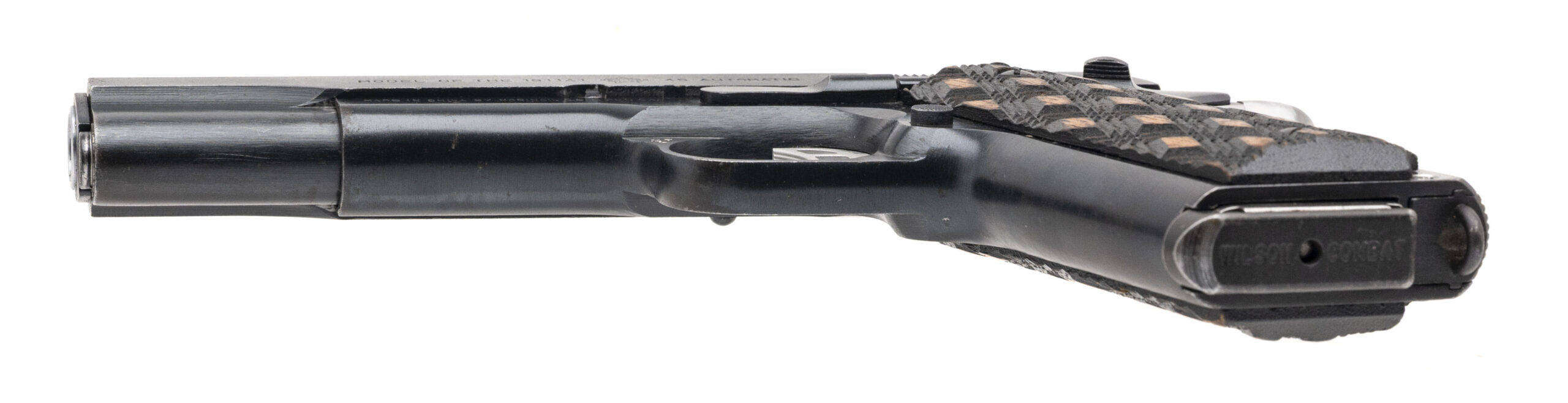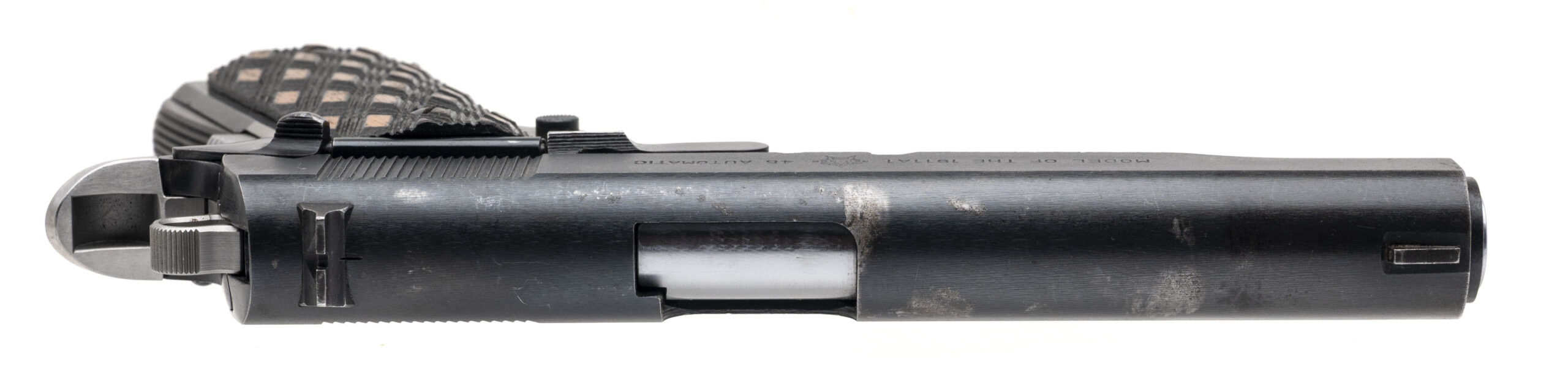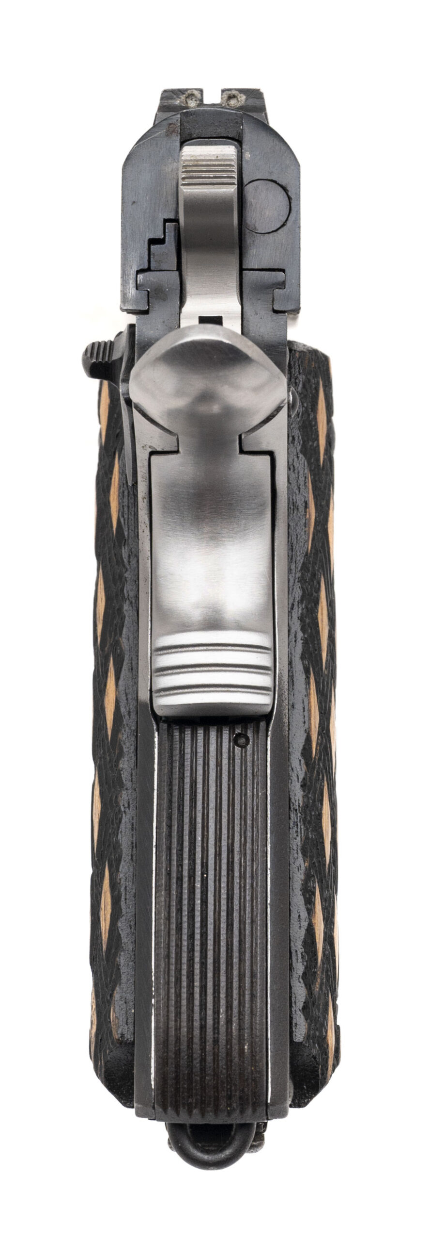 SN: 522308. Early 1990s production, .45 Auto with a 5" barrel. Bore is bright with good rifling. Custom Chinese made 1911 style pistol with diamond checkered wood grips. Custom work by Houston's renowned pistolsmith Eddie Jimenea. Custom features includes tuned action, trigger job, and perfectly fitted safety control. Metal shows wear with most of the finish present, the overall condition is very good.