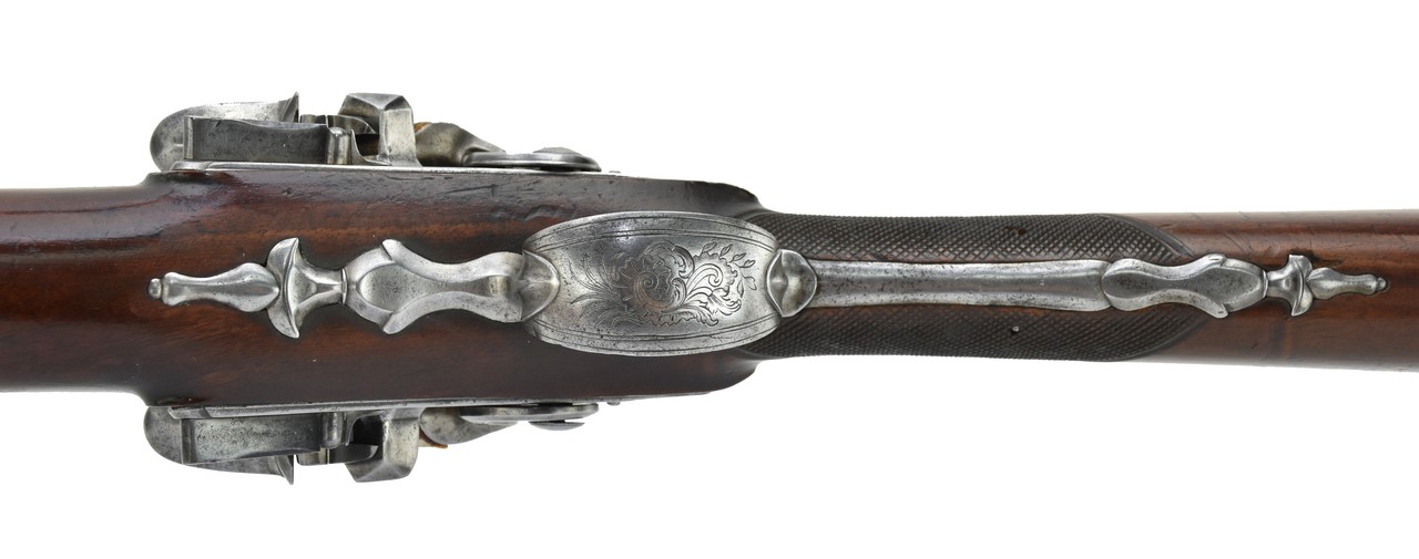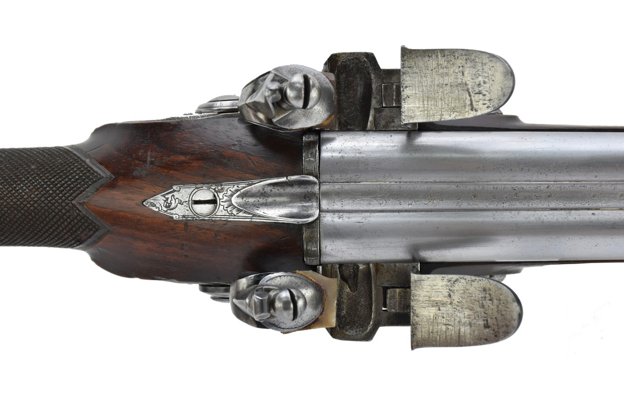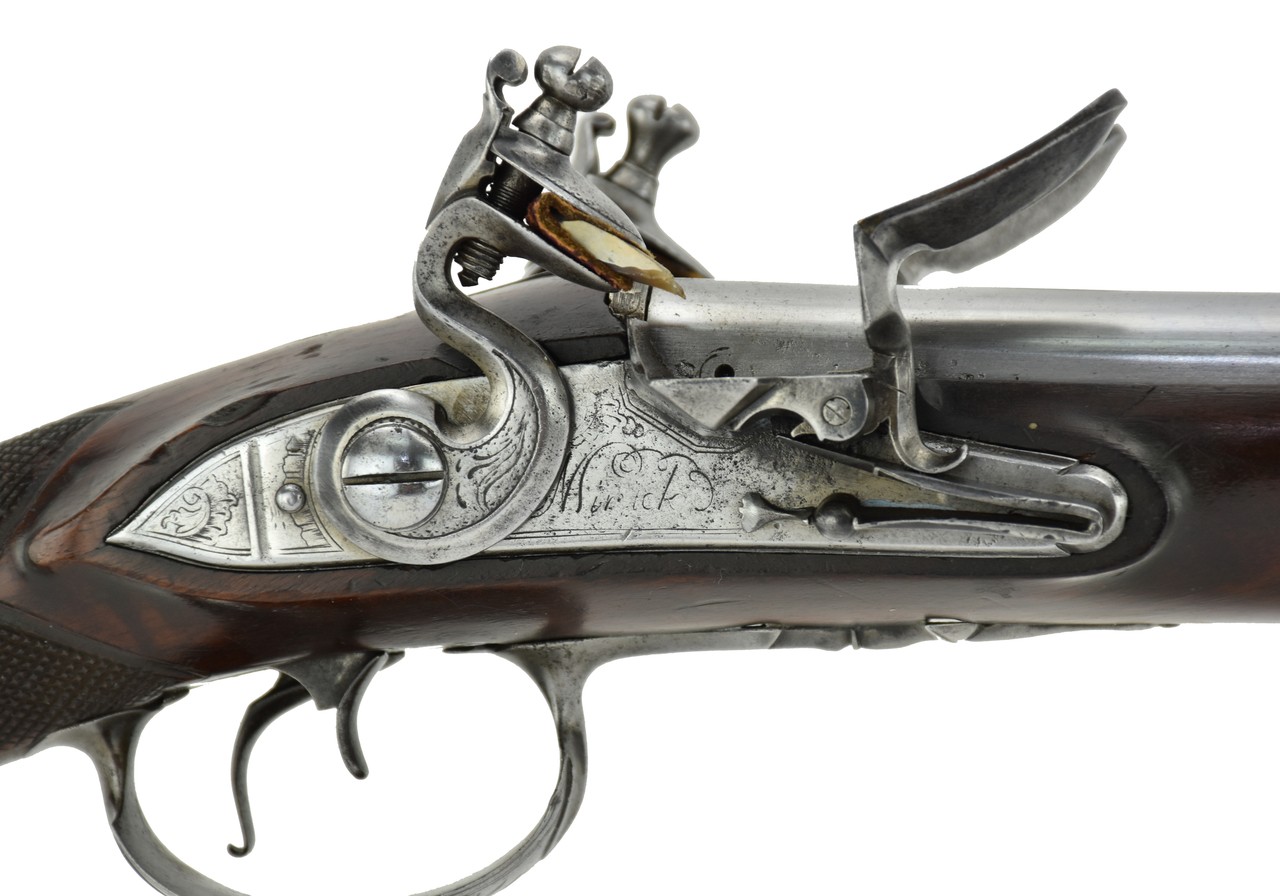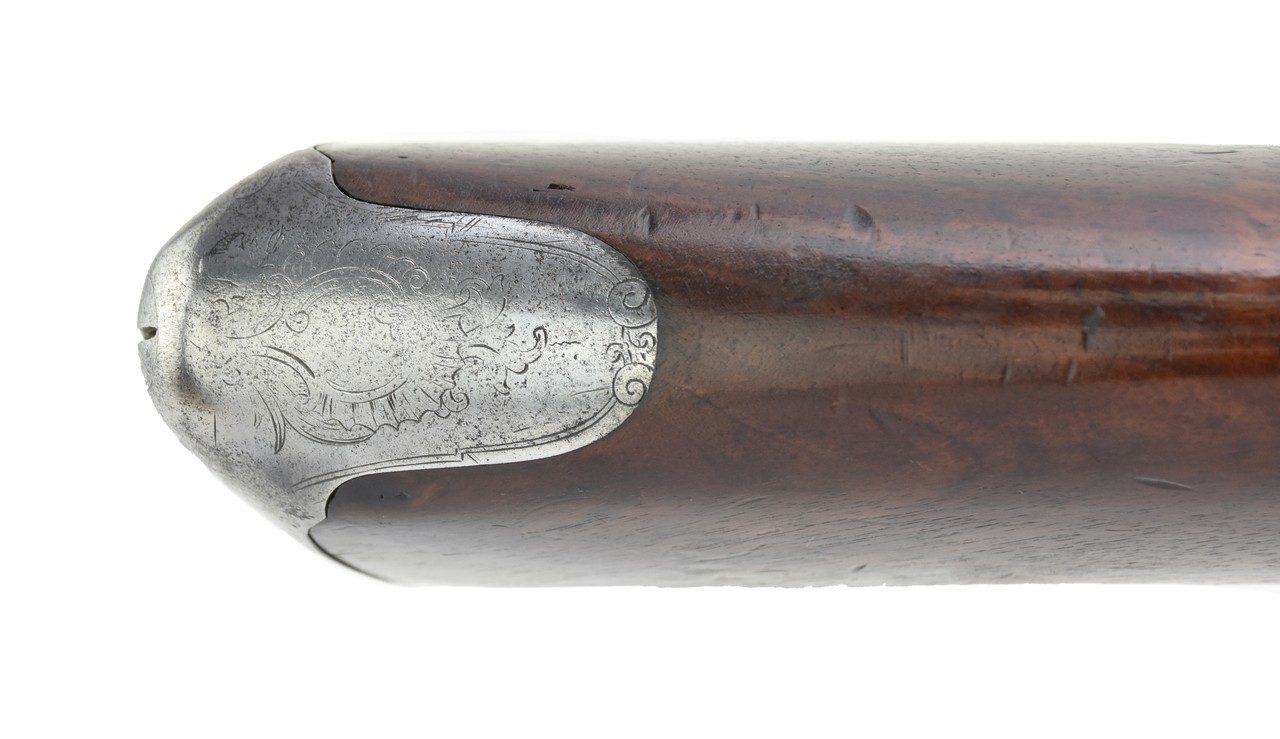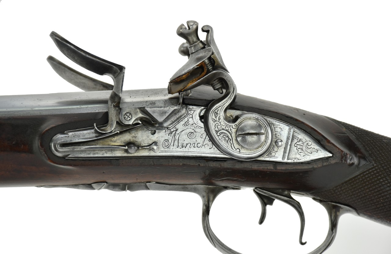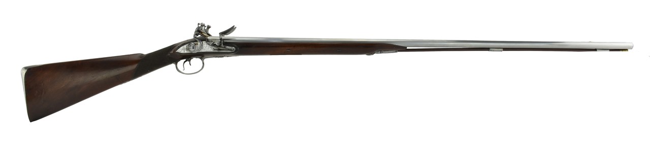 English Double Barrel Flintlock Shotgun. Barrel measures .709 at the muzzle. Made by Minick a London maker. Barrels are 40”, overall length is 56½”. The metal parts are very good plus. The stock is also very good plus, no chips cracks. Very fine classic Flintlock Flower!