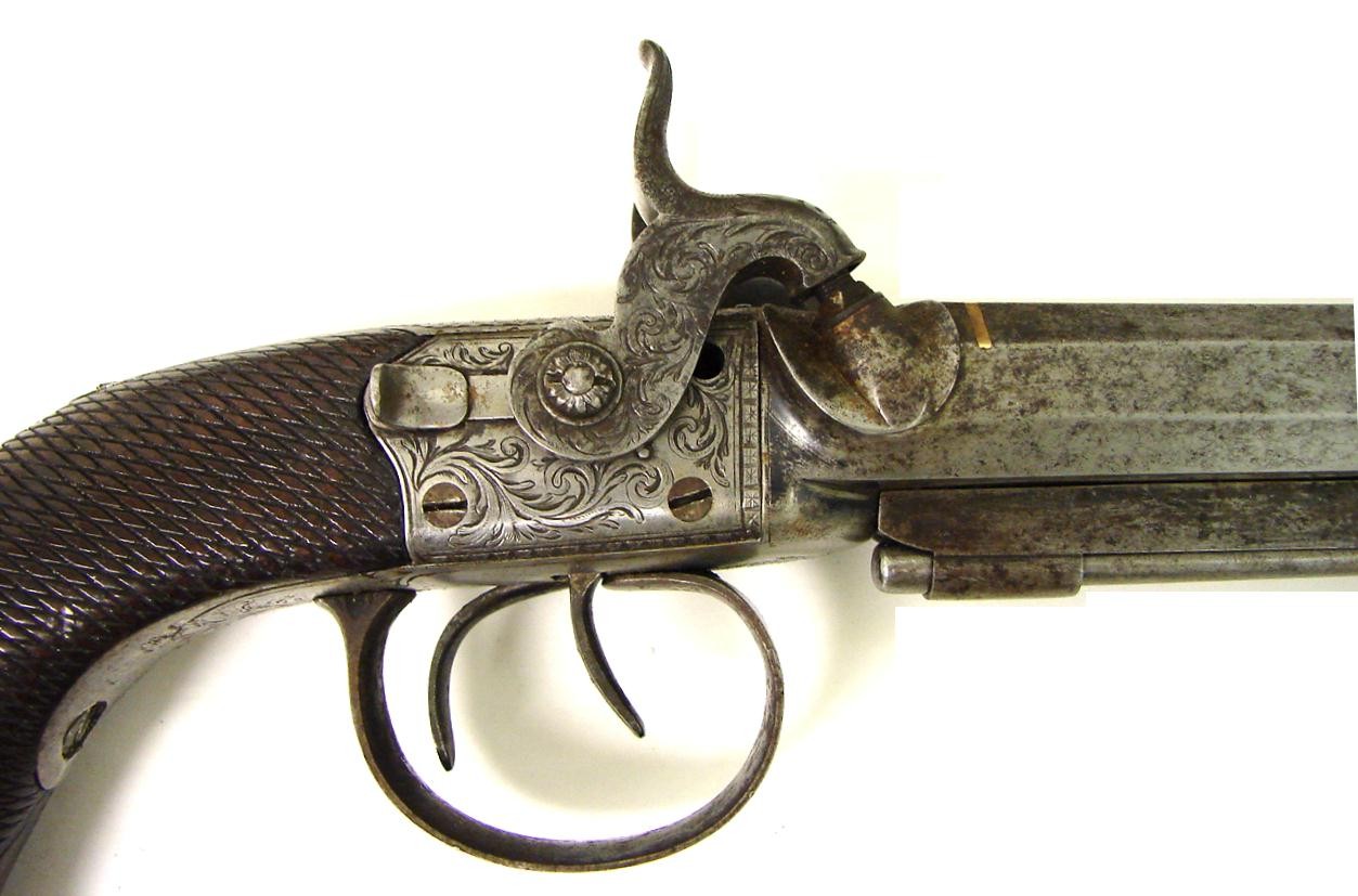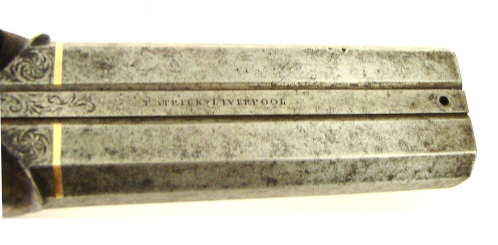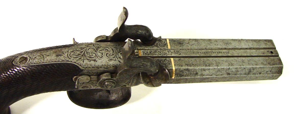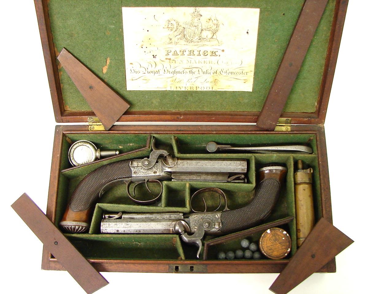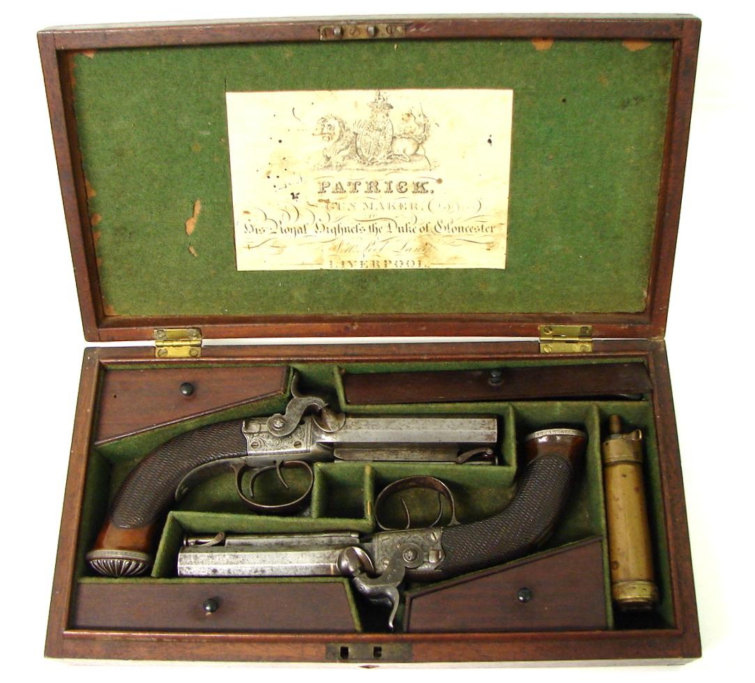 English Double Barrel Percussion approximately .48 caliber pistols. Pistols by Patrick of Liverpool. Barrels are 3 1/2" long and overall length is 6 1/4". Guns are engraved and barrels have Gold breech bands. Stocks are nicely checkered and have Silver Rims around the butt. Case has the correct trade label. Case has the oil can, cap can and two compartment flasks. Fine cased set.