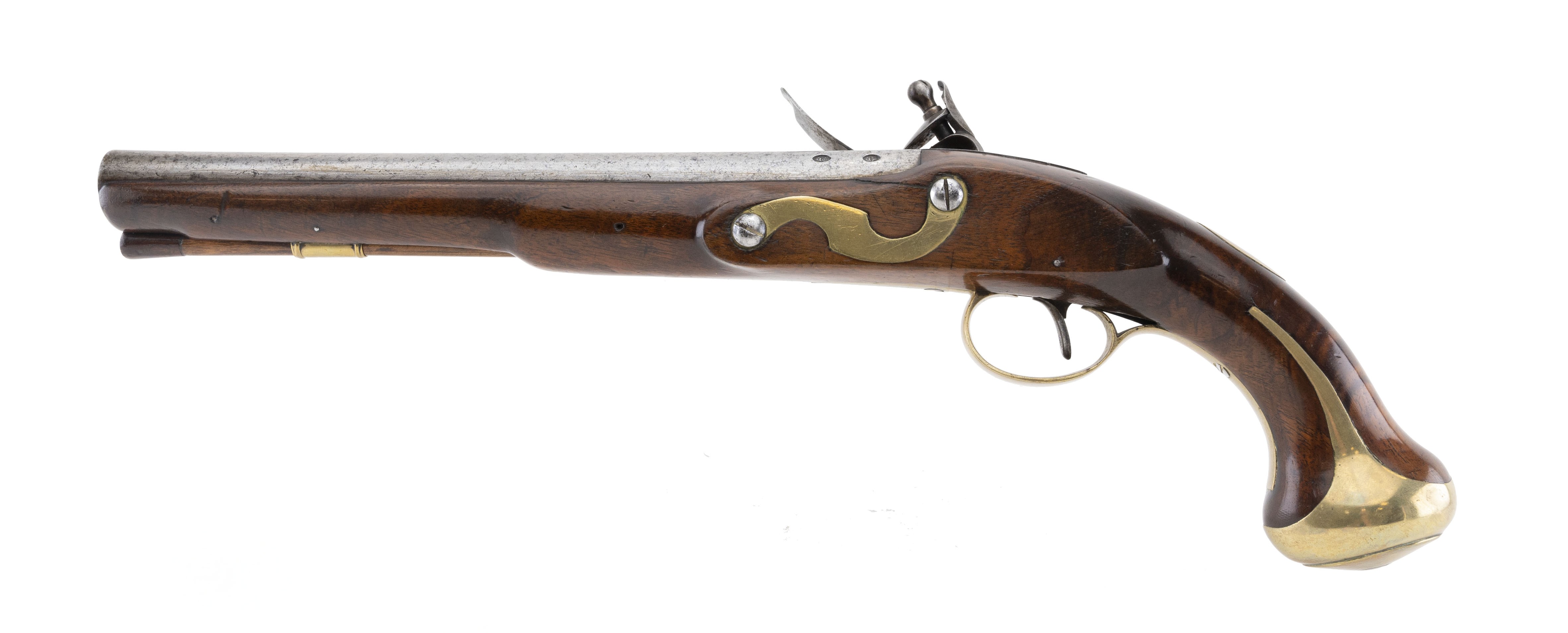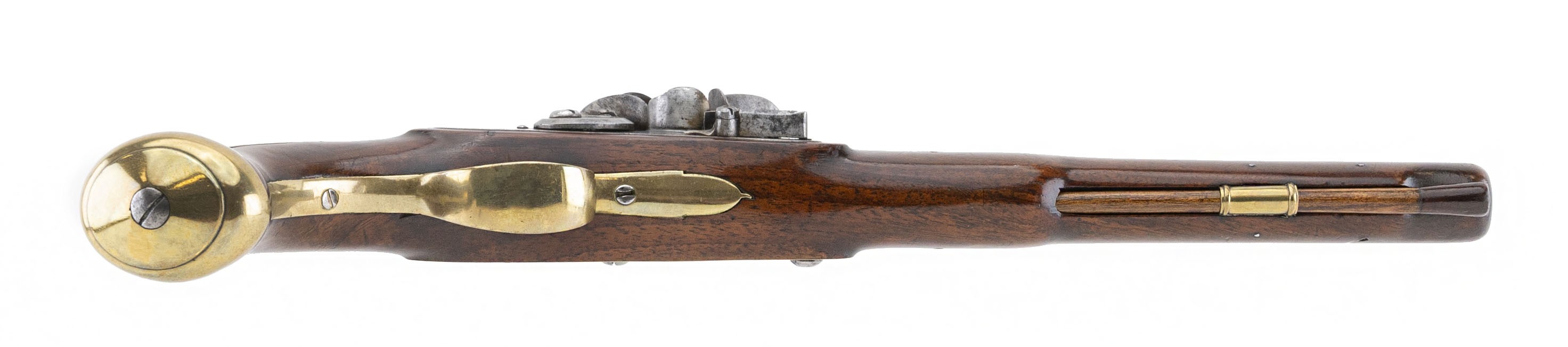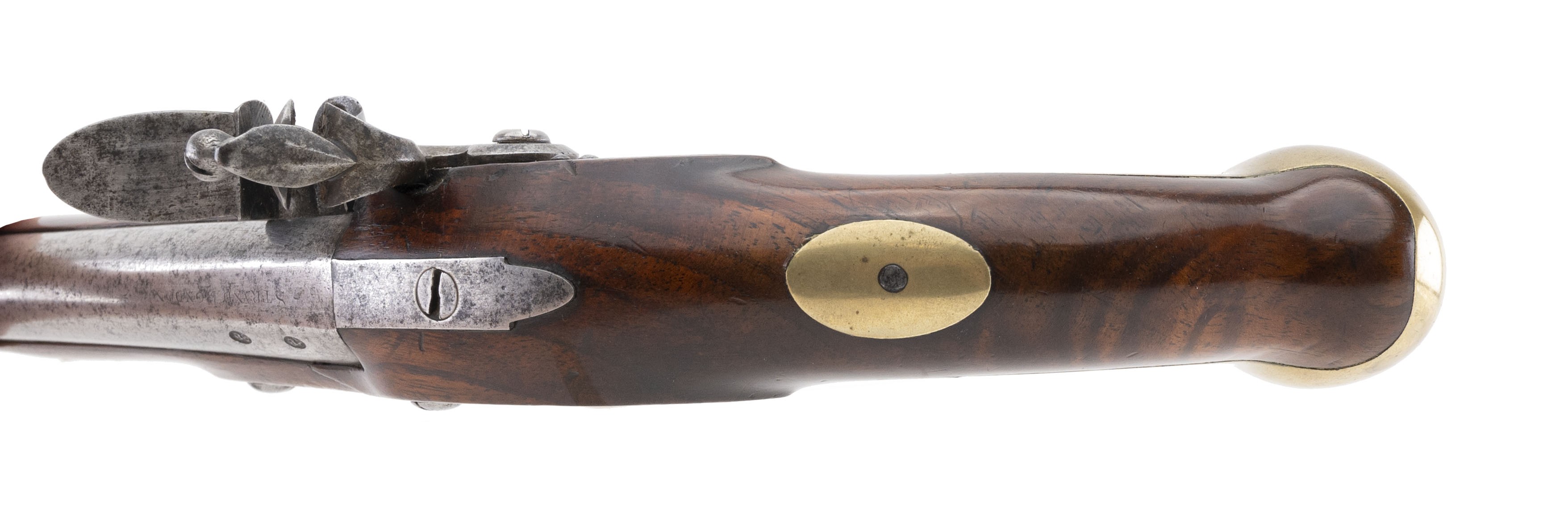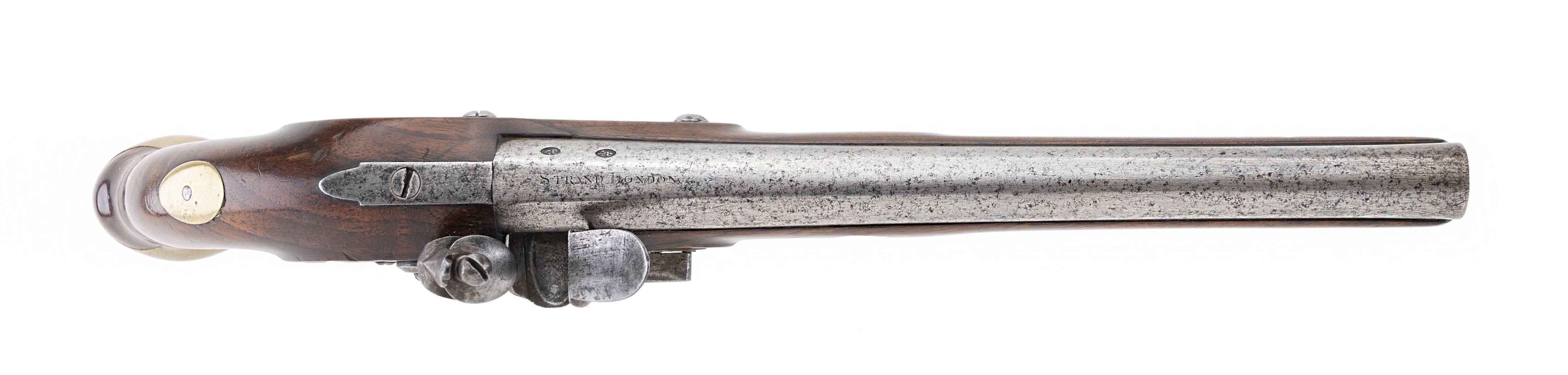 Lock plate is marked T. Richards. Top of barrel is marked "Strand London" at breech end. Trigger guard, butt cap, side plate and ramrod pipe are brass. Barrel length is 10" and .60 caliber. Overall length is 16". Mininmal handling marks. Excellent condition overall and tastefully made officer's pistol.