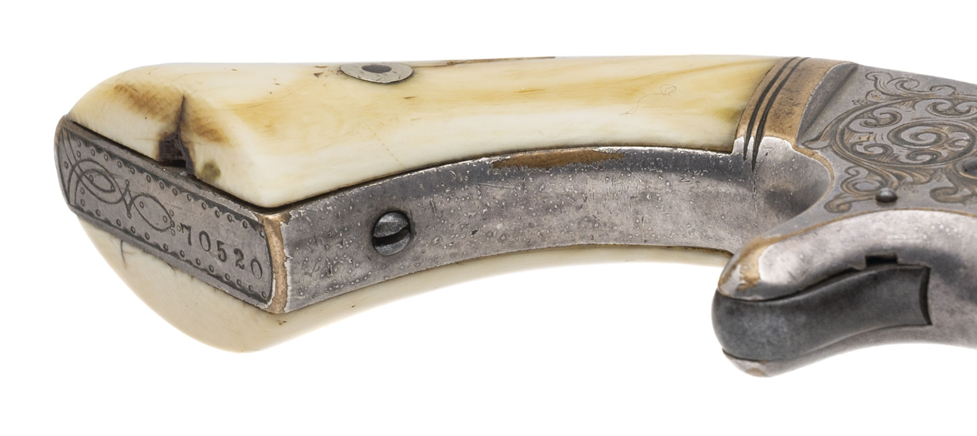 Serial number 70520. Made circa 1860s. 22 caliber with a 3 3/16” barrel. This gun is New York Engraved. The barrel is nice and sharp with a dark gray patina. The frame still retains most of its original silver finish. The back strap is engraved “Maggie”. The grips are ivory and have a chip on the butt on the right side grip missing.