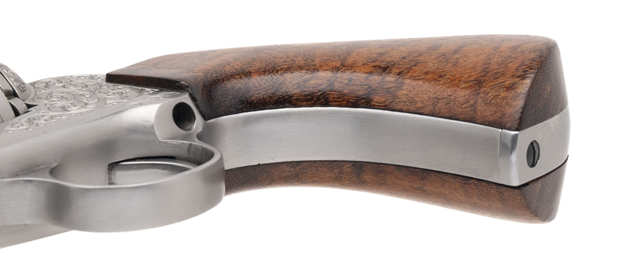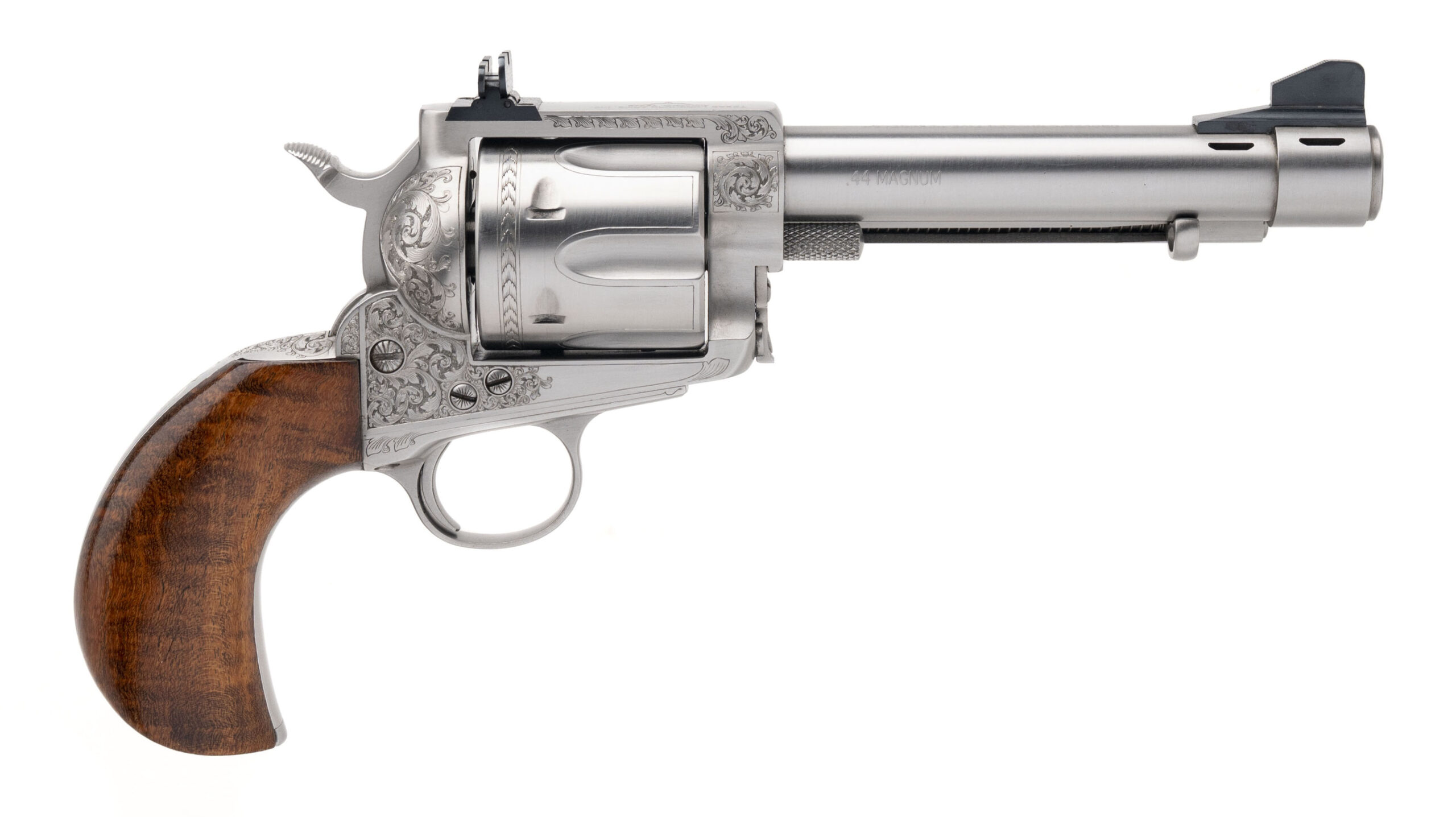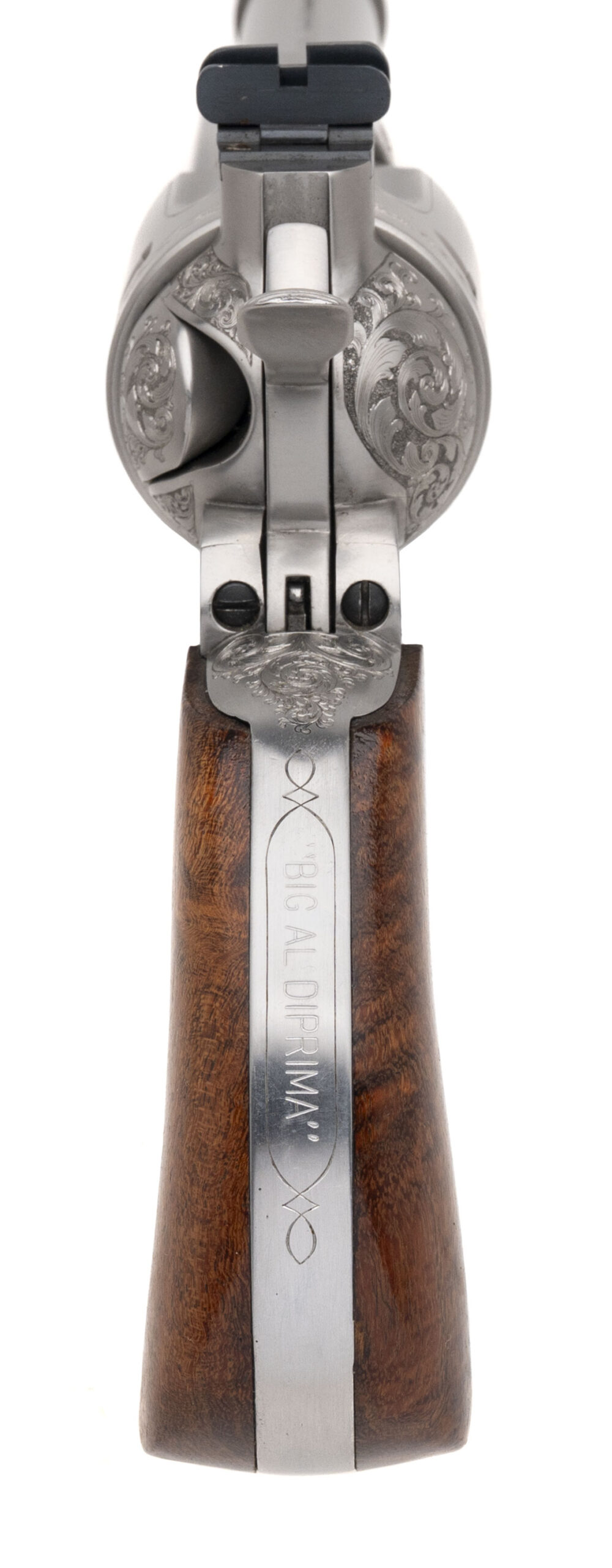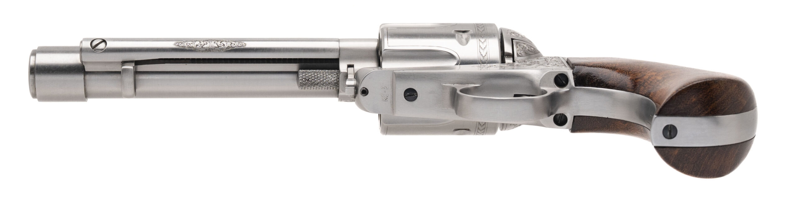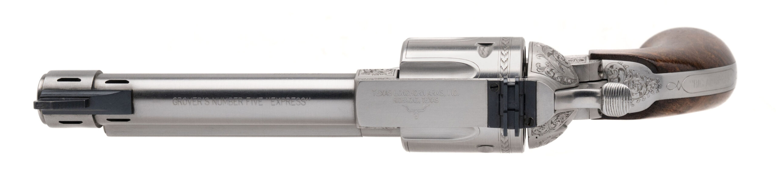 Serial number KE-3. Made circa early 1990s. 44 Magnum caliber with a 5.5” barrel. This is a one of a kind revolver that was made as a prototype for a possible future production. It is in excellent condition with no visible handling wear on either the stainless steel metal or the one piece grips. The grips were made by grip maker Bill Konig. This gun is masterfully engraved by Terry Wallace. The backstrap is inscribed to “Big Al DiPrima” Al Diprima had an ownership interest in Texas Longhorn Arms and came up with this design. He wanted the barrel ported with a ring profile muzzle. He also wanted this to have express adjustable sights similar to a double rifle. The top of the barrel is marked “Grover’s Number Five Express” This gun was being made alongside to copy of Elmer Keith’s No. 5. The Texas Longhorn Arms guns were of the highest quality, but could never get into full production mode. They took the Colt Single Action Army design and postulated this was a continuation of all of the Sam Colt Percussion revolvers with a left hand design and they were going to make a Single Action with a right hand design. This is a one of a kind unique gun with absolutely fantastic engraving.