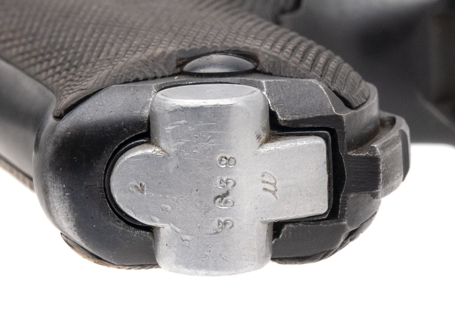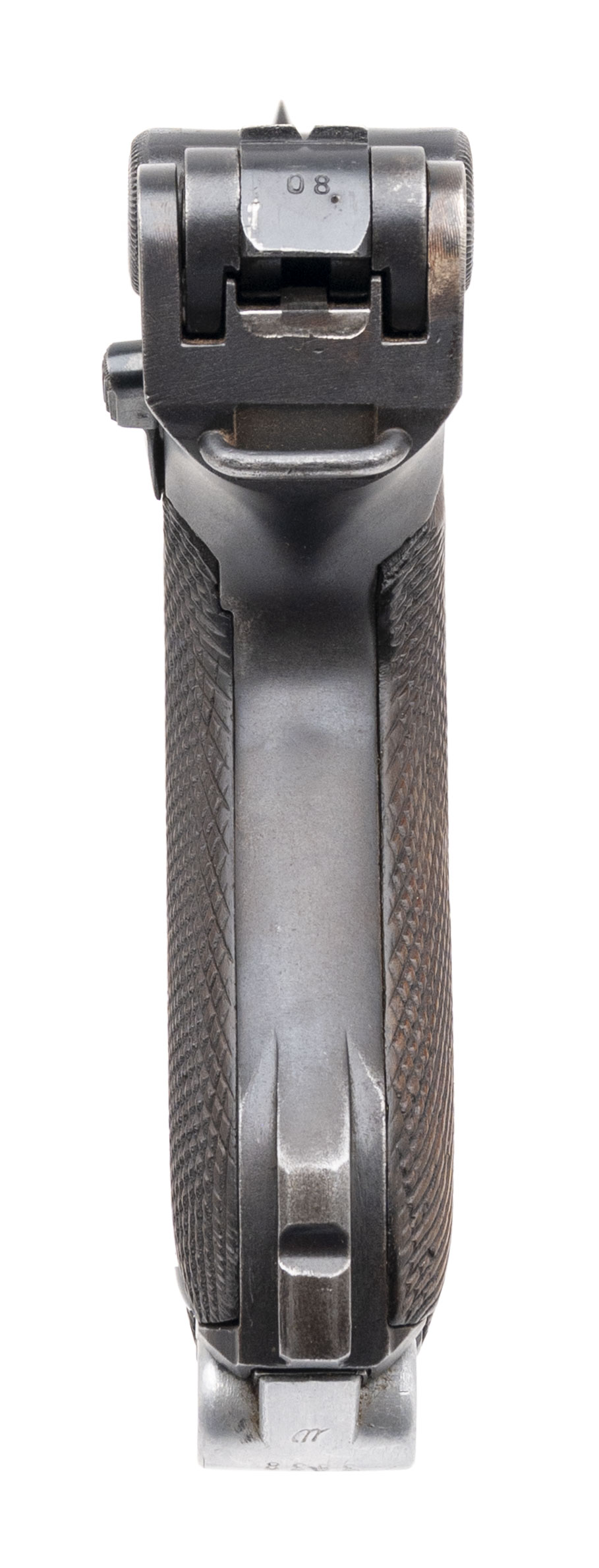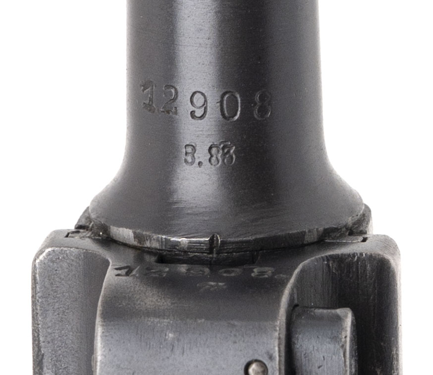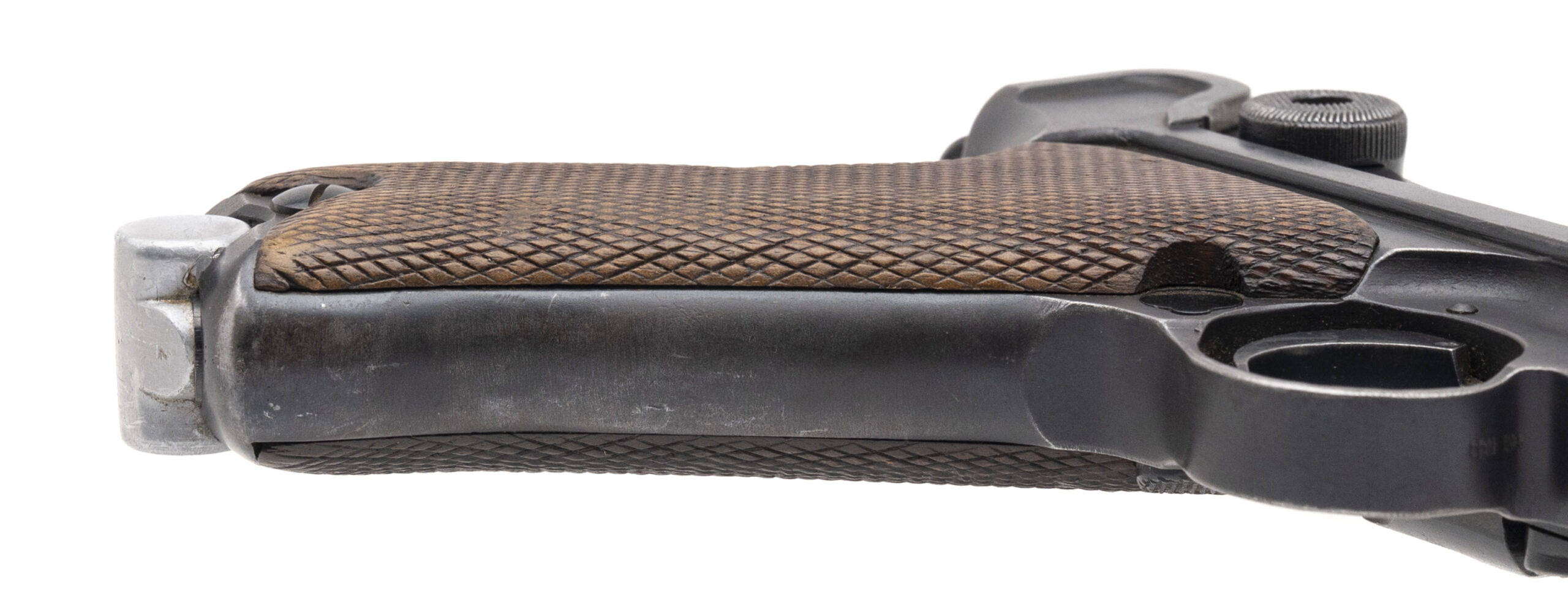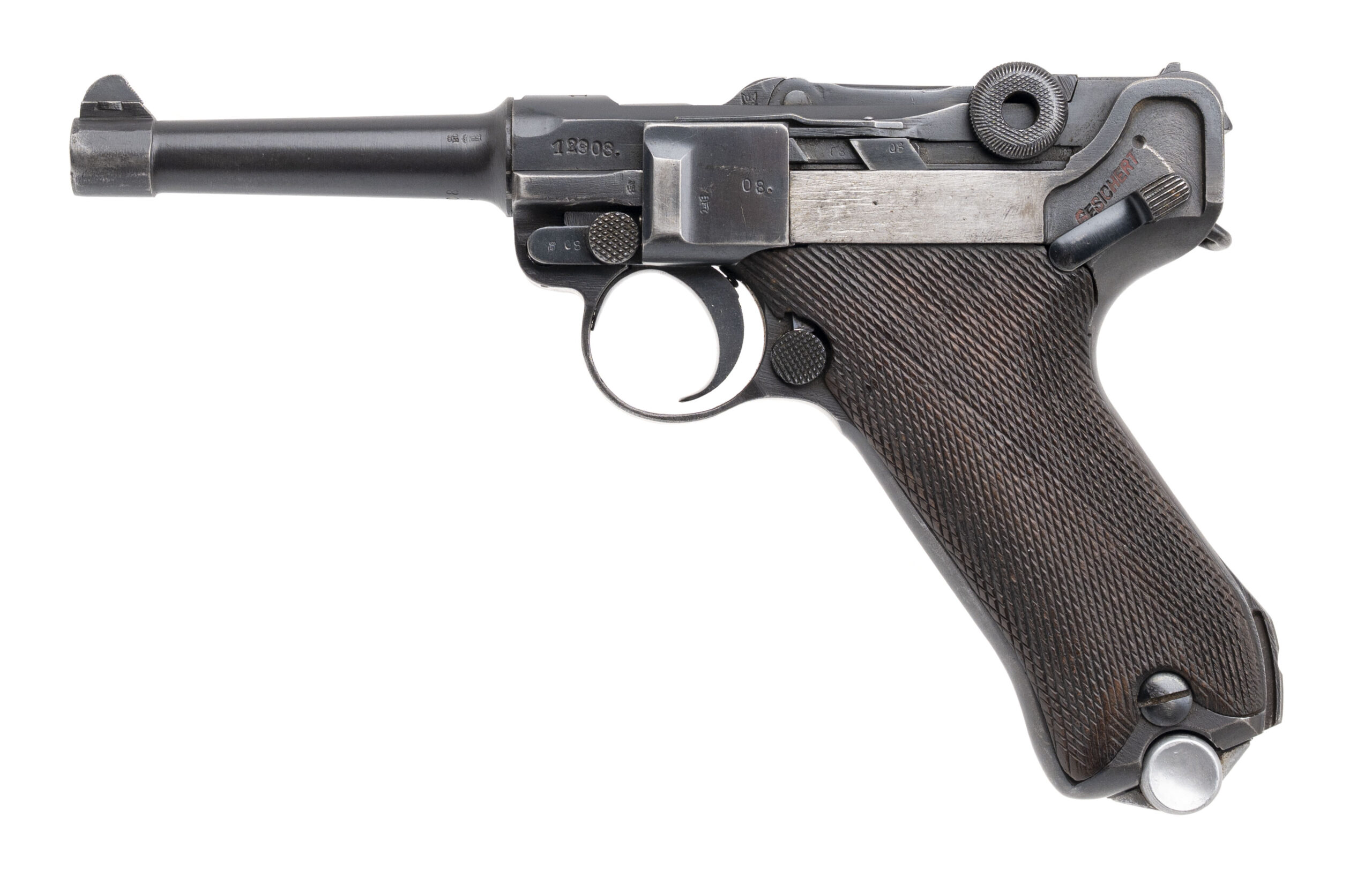 SN: 12908 made in 1918. 9mm semi-auto pistol with a 4" barrel. numbers have been re-stamped on the slide to match, finish is in good condition with the exception of a large area on the left side of the frame that has been removed. Magazine is period correct non matching. Bore has some frosting but strong rifling. Action functions smooth and works properly. Overall a good shooter grade Luger. Dallas location