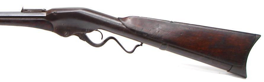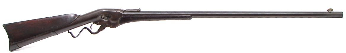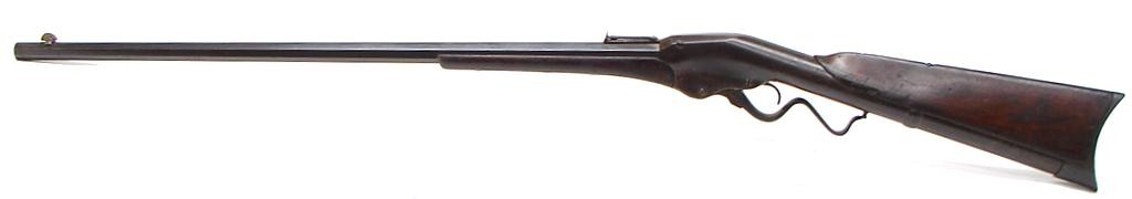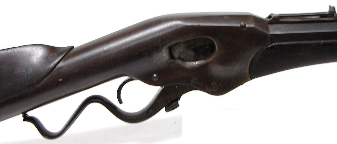 Evans "Old Model" serial number 373. Approximately 500 made. Bore is good with strong rifling and light pits in the grooves. Excellent barrel address. 30" barrel. Barrel has a blue brown patina. Excellent action. Scarce early model Evans.