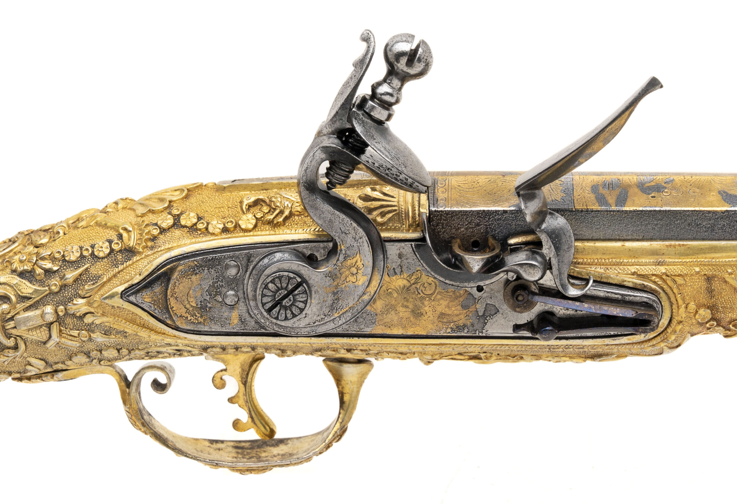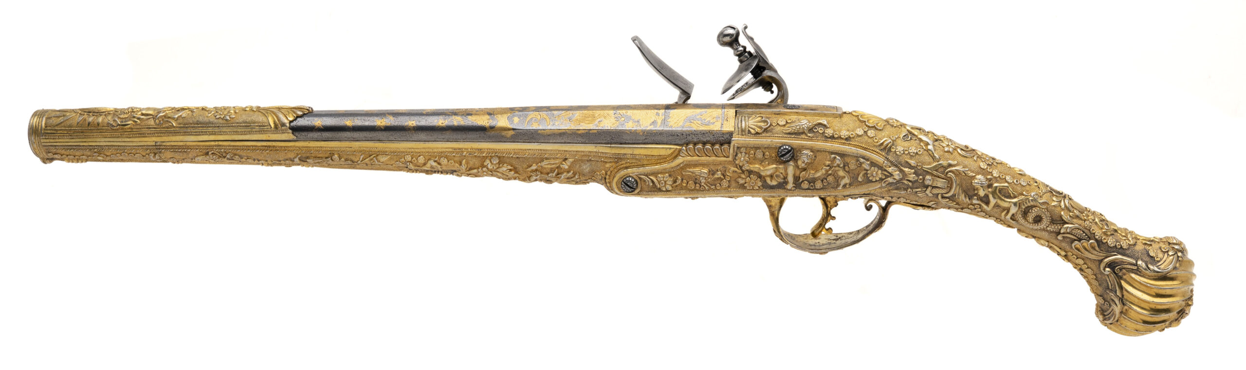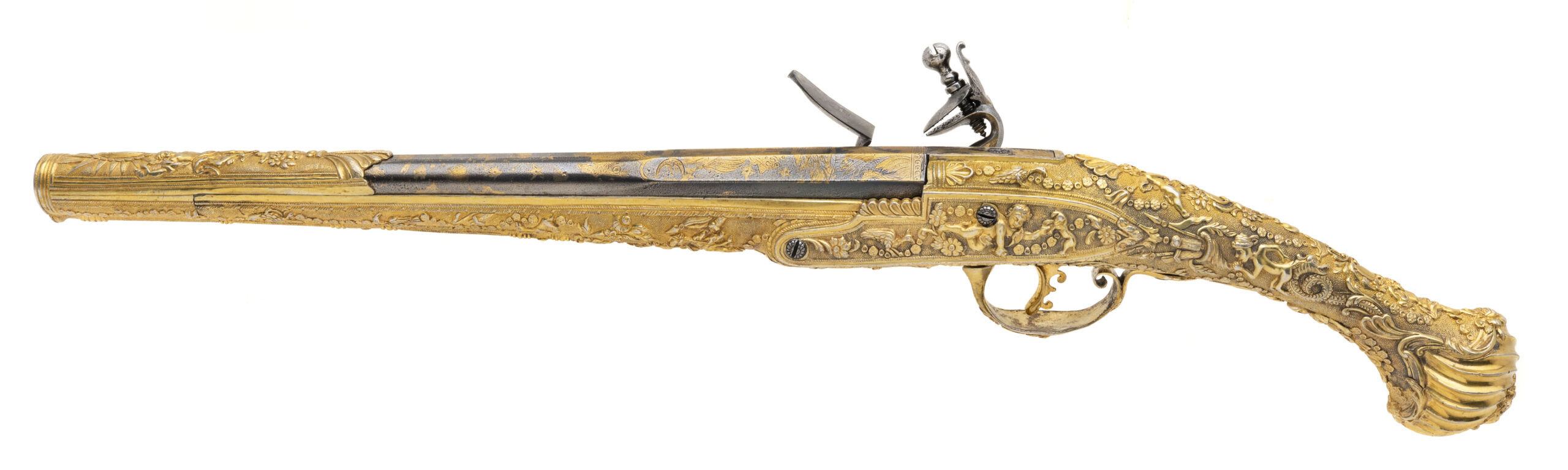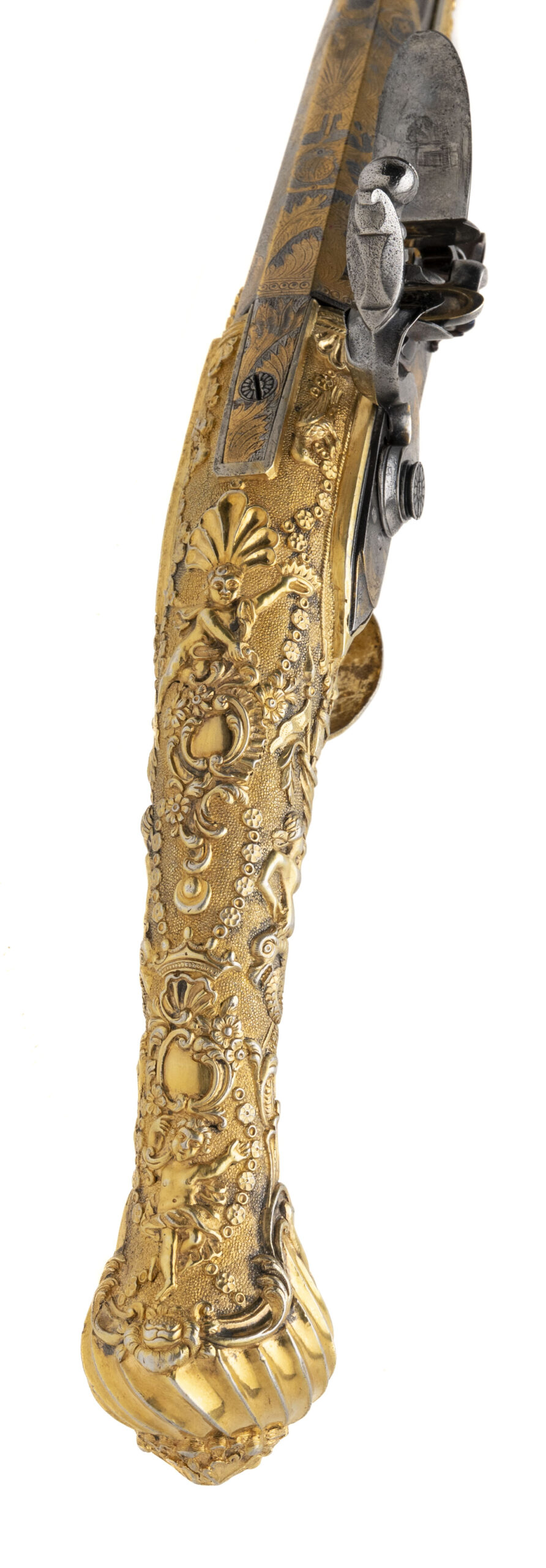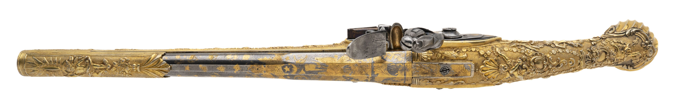 These are simply the finest Greek Pistols we have ever seen. These gun are made circa 1780-1800. The bores are 60 caliber with 12” barrels. The stocks are gold plated solid brass and in near Mint condition. Throughout the stocks are Greek gods like Poseiden and Hades as well as Cherubs. The barrels have been cleaned, but were done carefully as to preserve the gold inlay work. These are truly Museum Quality!
