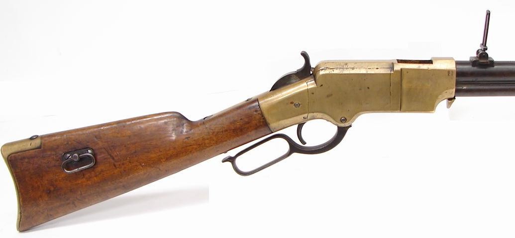 Extremely Rare Bavarian Contract Henry Rifle. This is on of approximately 500 Henry Rifles made for the King of Bavaria. There are several differences between these and a regular Henry Rifle. The most noticeable difference is the non-rotating barrel and the then newly designed loading system. An article by Herbert Houze accompanies this gun detailing more information on these rare rifles. This particular gun in addition to being German proofed is also English proofed and retailer marked. Condition on this gun is very fine with a smooth brown patina throughout the metal. This is a very rare rifle with approximately 10 known to exist among collectors.