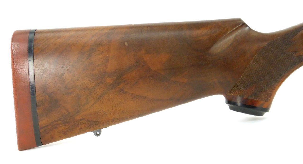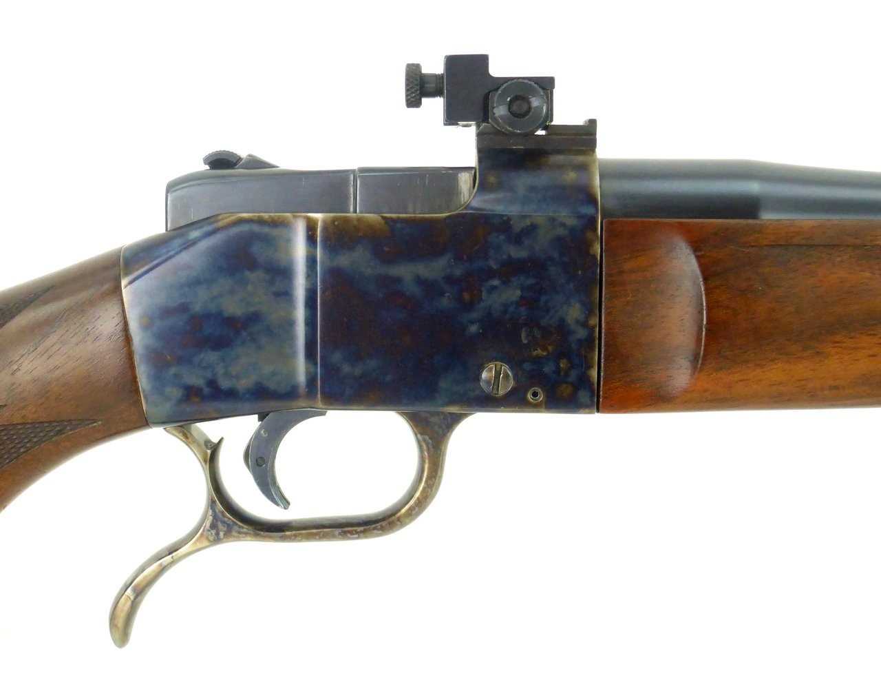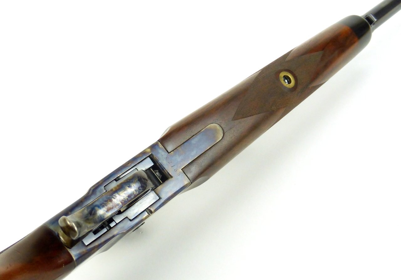 F. Depoy Custom Single Shot .338 Win Magnum caliber rifle. Beautiful custom rifle built on a Colt Sharps action. The barrel is marked “F. Depoy”; Fred Depoy worked for Douglas barrels, and was a master at his profession. The stock is of deluxe figured walnut and is finely checkered. LOP is 13½” over a recoil pad. The rifle has open sights with a peep rear sight and barrel band mount. A great looking custom single shot rifle in excellent condition.