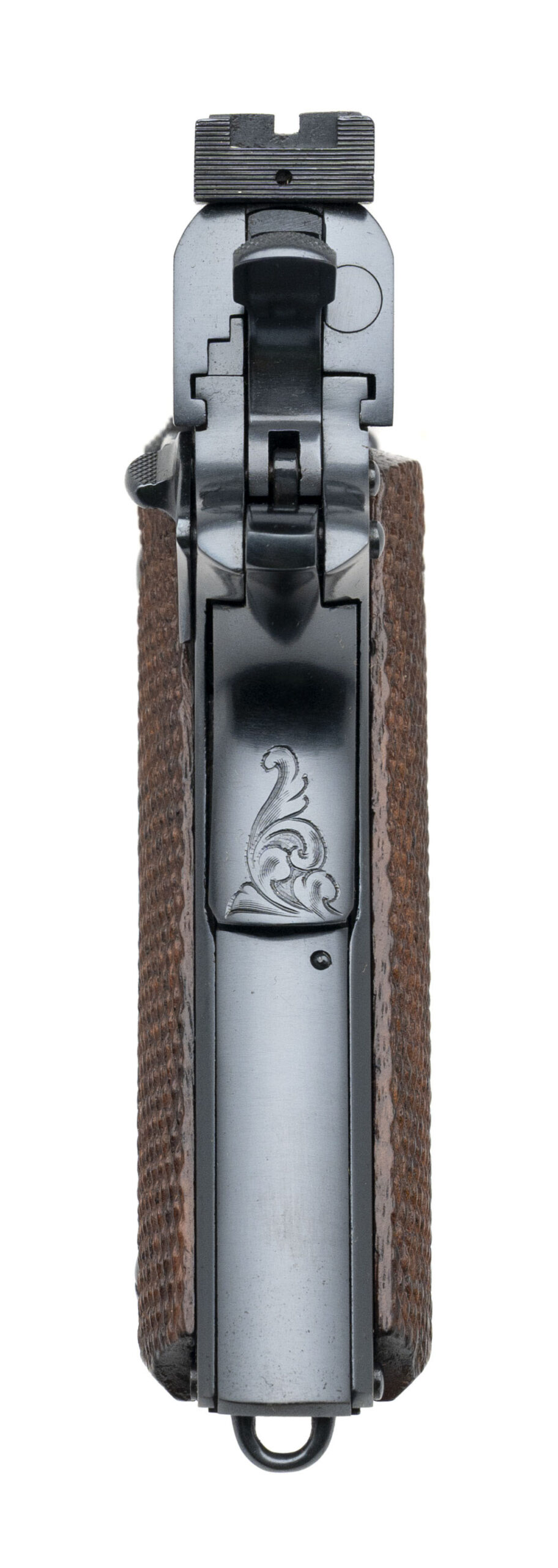 Serial number C136079. Made in 1923. 45 ACP caliber with a 5” barrel. This gun is in mint condition as restored. The restoration is excellent. This is a seldom seen factory engraved Government model. The grips are excellent. The slide has been modified to accommodate the rear sight. Accompanying this gun is a factory letter. The letter confirms the factory engraving. This gun was shipped to Rodriguez Juarez and Company and shipped to A Combaluzier in Mexico City, Mexico. Very fine Factory Engraved Colt 1911 shipped to Mexico!