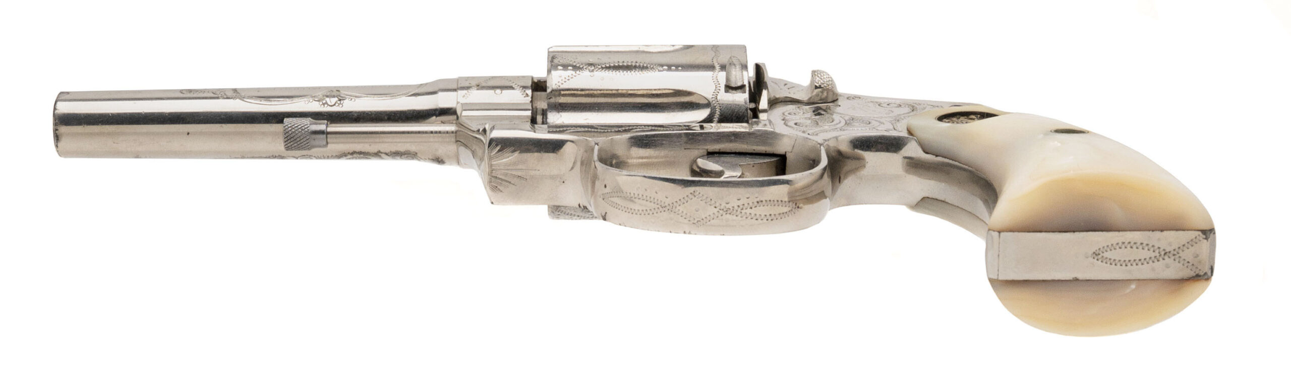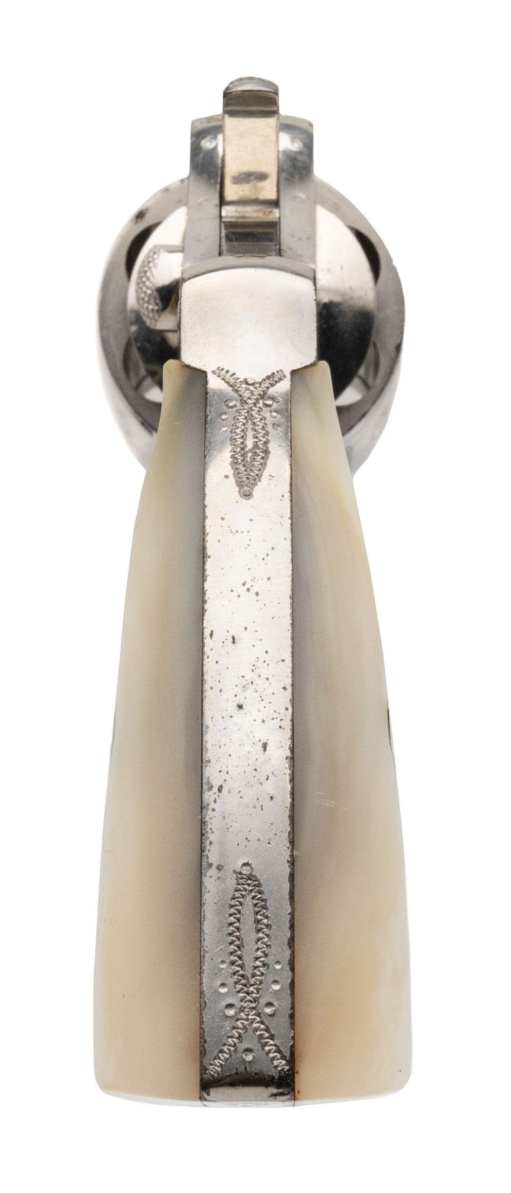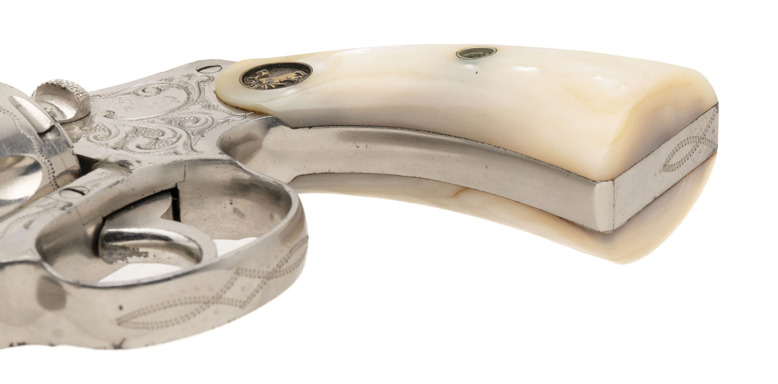Serial number 112017. Made in 1914. 38 Special with a 4” barrel. This gun is in very fine condition with 90% + of the original nickel finish. This gun is factory engraved. It has fantastic deep dish medallion pearl grips. This gun comes with a factory letter confirming all features. It was shipped to Townley Metal & Hardware Company in Kansas City, Mo.