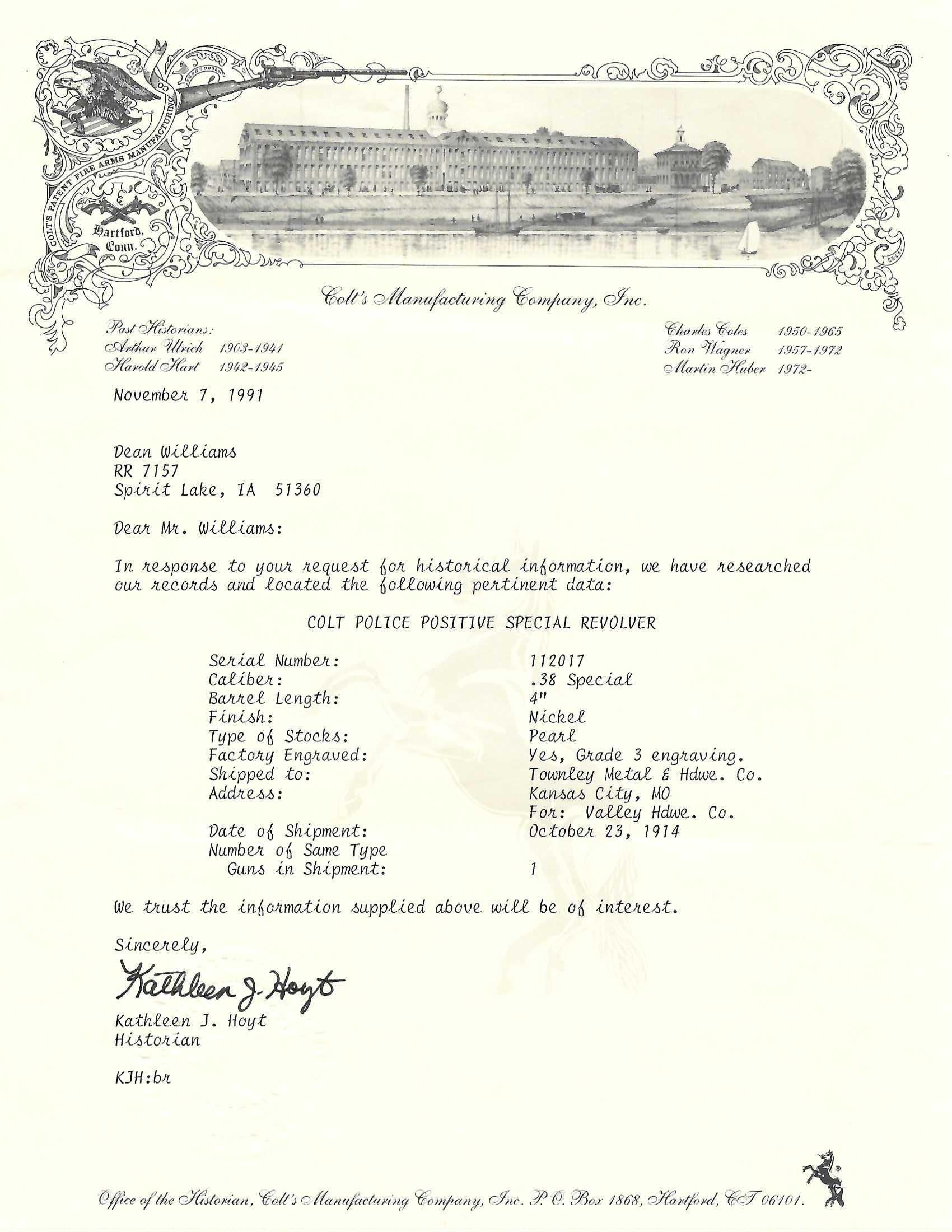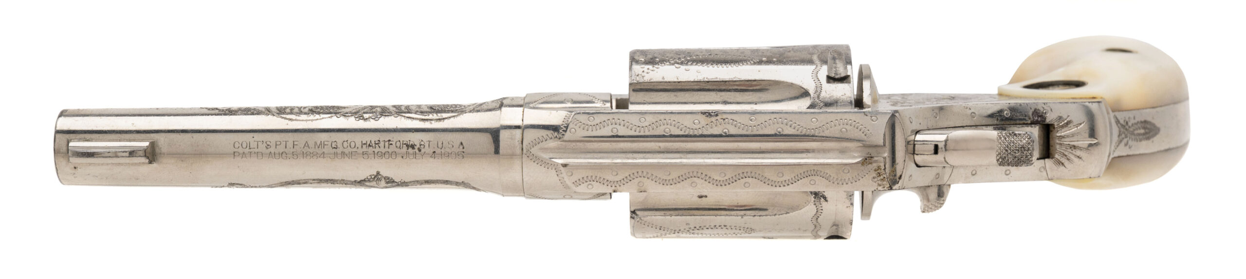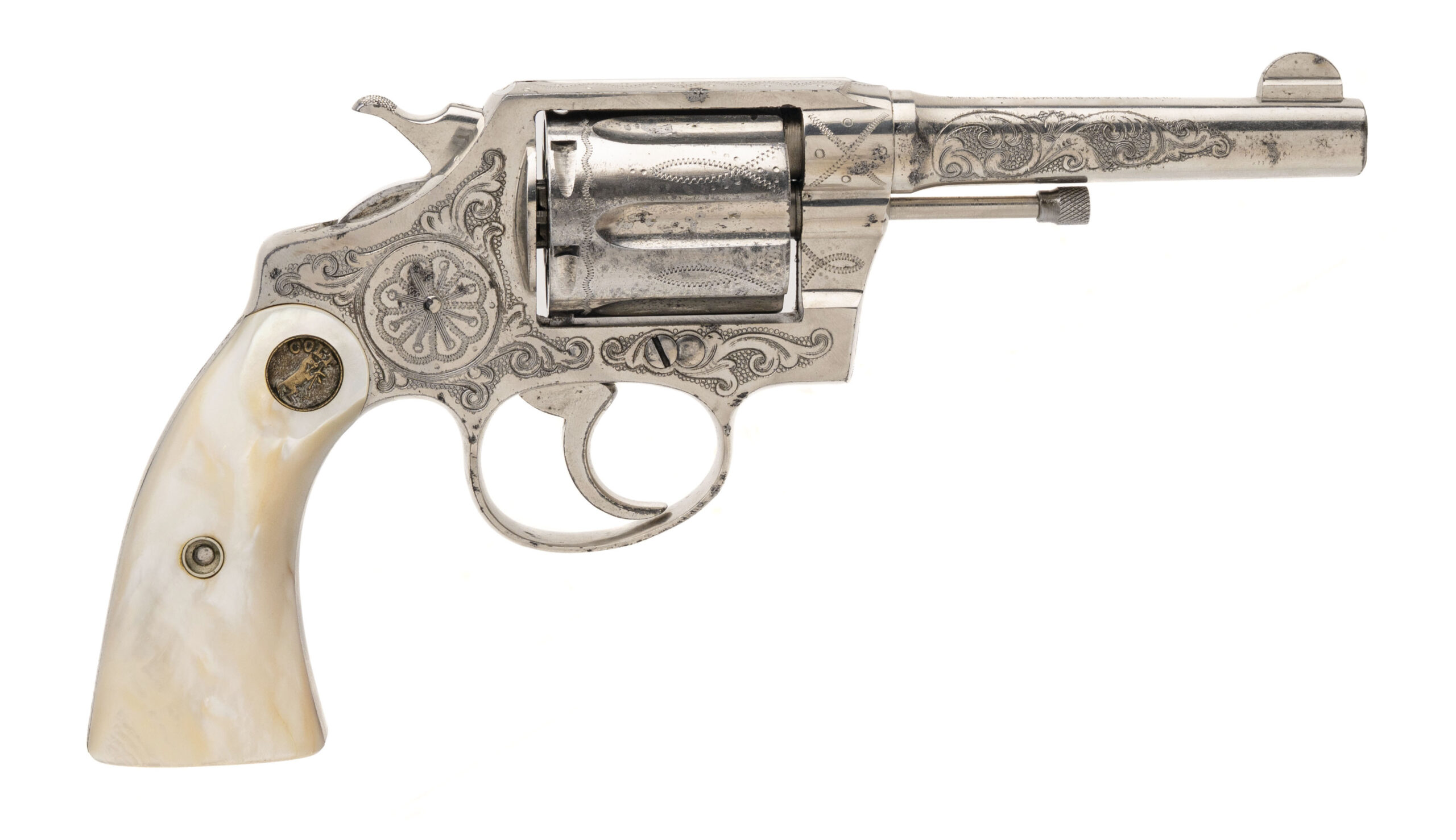 Serial number 112017. Made in 1914. 38 Special with a 4” barrel. This gun is in very fine condition with 90% + of the original nickel finish. This gun is factory engraved. It has fantastic deep dish medallion pearl grips. This gun comes with a factory letter confirming all features. It was shipped to Townley Metal & Hardware Company in Kansas City, Mo.
